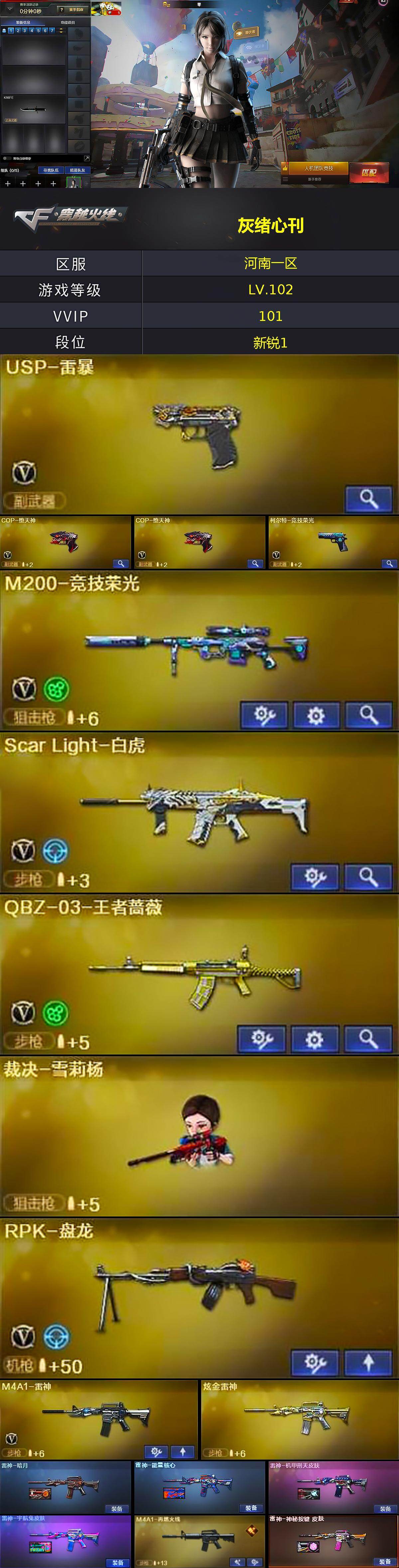 [16317395]河南一区-102v-1王者武器数-2炫金武器数 【热门武器】:scar light-白虎,m200-竞技荣光,死亡之眼,rpk-盘龙,裁决-雪莉杨,usp-雷暴,cop-堕天神2,沙鹰-修罗,金刚伞 【王者炫金武器】:炫金雷神,炫金武士 【音效卡】:炼狱-百战金芒-庆典舞曲音效卡 【皮肤】:雷神-暗月,雷神-能量核心,雷神-机甲刑天皮肤,雷神-宇航兔皮肤,m4a1-再燃火线,雷神-神秘按键 皮肤,火麒麟-ag战队皮肤,火麒麟-百城,毁灭-黑大圣皮肤,毁灭-风暴,毁灭-英雄计划 皮肤,黑骑士-暗月,无影-能量核心,ak47-黑武士-361,战神-紫绶金章皮肤,ak47-b-常胜将军-曹操2,ak47-b-常胜将军-刘备,ak47-b-常胜将军-孙权2,极光-能量核心,屠龙-春桃 皮肤,轻型军用手斧-再燃火线 【角色】:零,葵,魅影,迷迭香,电竞教官-云悠悠,王者樱-热浪之夏,王者玲珑-小乔,暗夜-x,嘉年华灵狐,娟娟,灵狐者-黄金海岸,灵狐者-七夕宝贝,龙儿,龙儿-小淘气,潘多拉-甜心教官,斯沃特-x,蜀雪,铁骑荣耀,兔囡囡,樱-战斗天使,影武者-x 【人偶武器】:裁决-雪莉杨,芭蕾特-零-水下丽影,awm-灵狐-15周年嘉年华,迷你深渊冰龙,迷你裂空之翼,深渊终结者手蕾2,闪光丹-小乔,闪光丹-貂蝉,高爆手蕾-大乔,迷你艾比,灵狐娃娃手蕾 【暴走生化】:死亡之眼,超级对讲机 【挑战大师】:暴君乱世-超越max,冰龙粉碎者-白马银呛,激光毁灭者iii-白马银呛3,机甲撕裂者iii,神圣爆裂者-末日iii 【英雄级武器】:ak47-火麒麟2,m4a1-黑龙,m4a1-雷神,ak47-无影,ak47-黑鲨,m4a1-堕天神,scar light-白虎,无影-神兵利器,黑武士-锦绣游龙,ak-47-猩红传说,黑骑士-海王,ak47-b-常胜将军,q-03-王者蔷薇-觉醒版,awm-天龙,barrett-毁灭,m200-竞技荣光,rpk-盘龙,炼狱-百战金芒,沙鹰-修罗,沙鹰-天神,usp-雷暴,cop-堕天神2,柯尔特-竞技荣光,天神-动感闪耀,屠龙,龙啸,麒麟刺-堕天神2,擎天,幻灵之锋,擎天-竞技荣光,龙啸-堕天神2,麒麟刺-百战金芒,丛林匕首-玄豹,高爆手蕾-堕天神6,高爆手蕾-幻灵3,高爆手蕾-竞技荣光7,高爆手蕾-玄豹2,闪光丹-堕