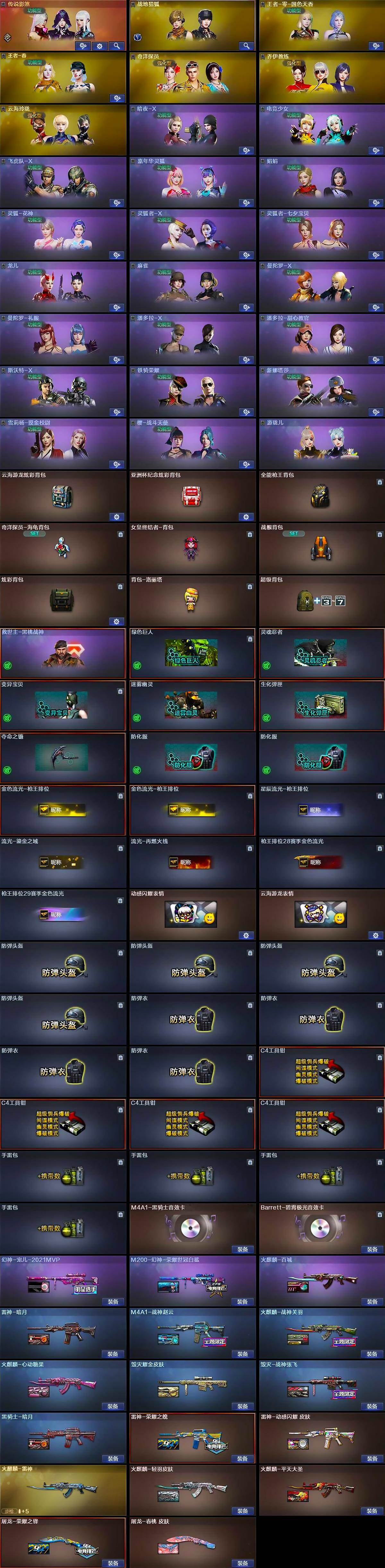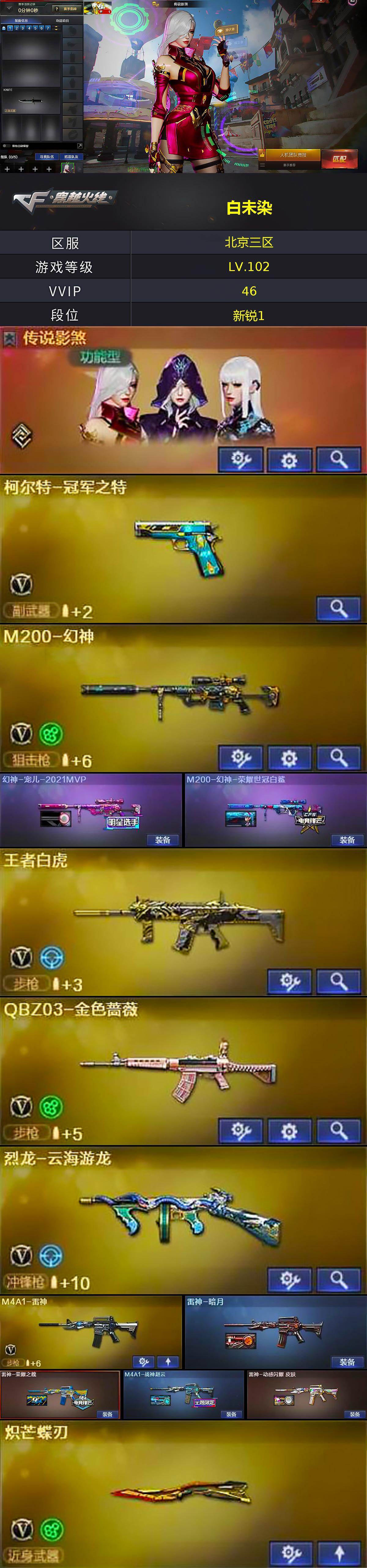 [16317555]北京三区-47v-1王者武器数-0炫金武器数 【传说角色】:传说影煞 【热门武器】:q03-金色蔷薇,m200-幻神,柯尔特-冠军之特,炼狱-迷你小钢,m4a1-黑骑士,沙鹰-修罗,炽芒蝶刃 【音效卡】:m4a1-黑骑士音效卡,barrett-碧霄极光音效卡 【皮肤】:幻神-宠儿-2021mvp,m200-幻神-荣耀世冠白鲨,雷神-暗月,雷神-荣耀之魄,m4a1-战神赵云,雷神-动感闪耀 皮肤,火麒麟-雷神,火麒麟-轻羽皮肤,火麒麟-战神关羽,火麒麟-平天大圣,火麒麟-百城,火麒麟-心动糖果,毁灭耀金皮肤,毁灭-战神张飞,毁灭-英雄计划 皮肤,黑骑士-暗月,屠龙-荣耀之锋,屠龙-春桃 皮肤 【角色】:战地猎狐,王者-零-国色天香,王者春,奇洋探员,乔伊教练,云海玲珑,暗夜-x,电竞少女,飞虎队-x,嘉年华灵狐,娟娟,兰-新年限定,灵狐-花神,灵狐者-x,灵狐者-七夕宝贝,龙儿,麻雀,曼陀罗-x,曼陀罗-礼服,潘多拉-x,潘多拉-甜心教官,斯沃特-x,铁骑荣耀,新娜塔莎,雪莉杨-摸金校尉,樱-战斗天使,游珑儿 【人偶武器】:炼狱-迷你小钢,芭蕾特-零-水下丽影,awm-灵狐-15周年嘉年华,迷你深渊冰龙,迷你波特博士,夺魂,迷你火种,深渊终结者手蕾2,迷你艾比,灵狐娃娃手蕾 【暴走生化】:超级对讲机 【挑战大师】:机甲撕裂者iii,试炼破坏者iii,神圣爆裂者-末日iii 【英雄级武器】:ak47-火麒麟,m4a1-雷神,m4a1-黑骑士,ak47-机械迷城,无影-神兵利器,黑武士-锦绣游龙,q03-金色蔷薇,烈火-动感闪耀,王者白虎-觉醒版,barrett-毁灭,barrett-极光,m200-幻神,烈龙-云海游龙,沙鹰-修罗,沙鹰-天神2,柯尔特-冠军之特,天神-动感闪耀,屠龙,炽芒蝶刃,唐刀-神工天巧,屠龙-动感闪耀,擎天-云海游龙,龙啸-热带奇洋,斩神刀-雷暴,高爆手蕾-雷暴,高爆手蕾-幻灵2,高爆手蕾-神工天巧2,手蕾-动感闪耀,高爆手蕾-云龙3,手蕾-云海游龙,手蕾-热带奇洋,闪光丹-雷暴,闪光丹-神工天巧,闪光丹-云龙,盐雾蛋-雷暴2,盐雾蛋-幻灵,盐雾蛋-神工天巧,m4a1-赤狱骑士 【道具】:云海游龙炫彩背包,亚洲杯纪念炫彩背包,全能呛王背包,奇洋探员-海龟背包,女皇终结者-背包,战舰背包,炫彩背包,背包-洛丽塔,超级背包,救世