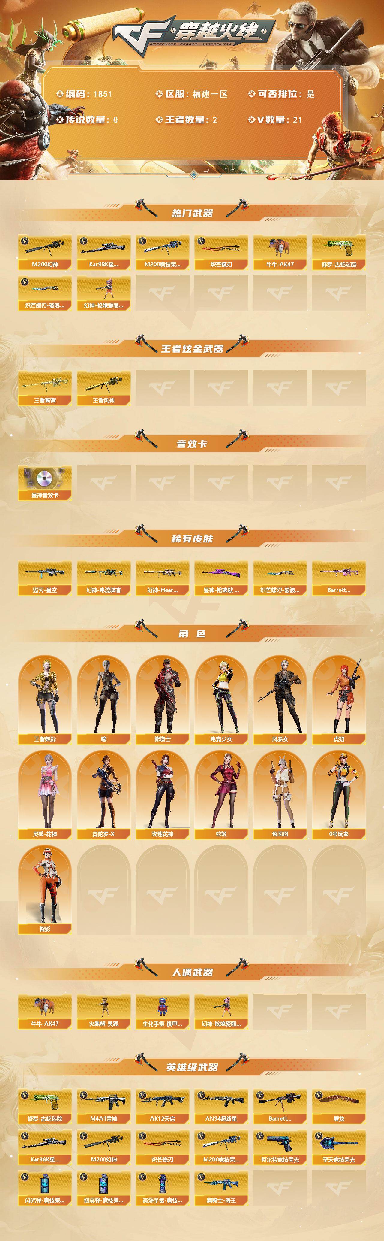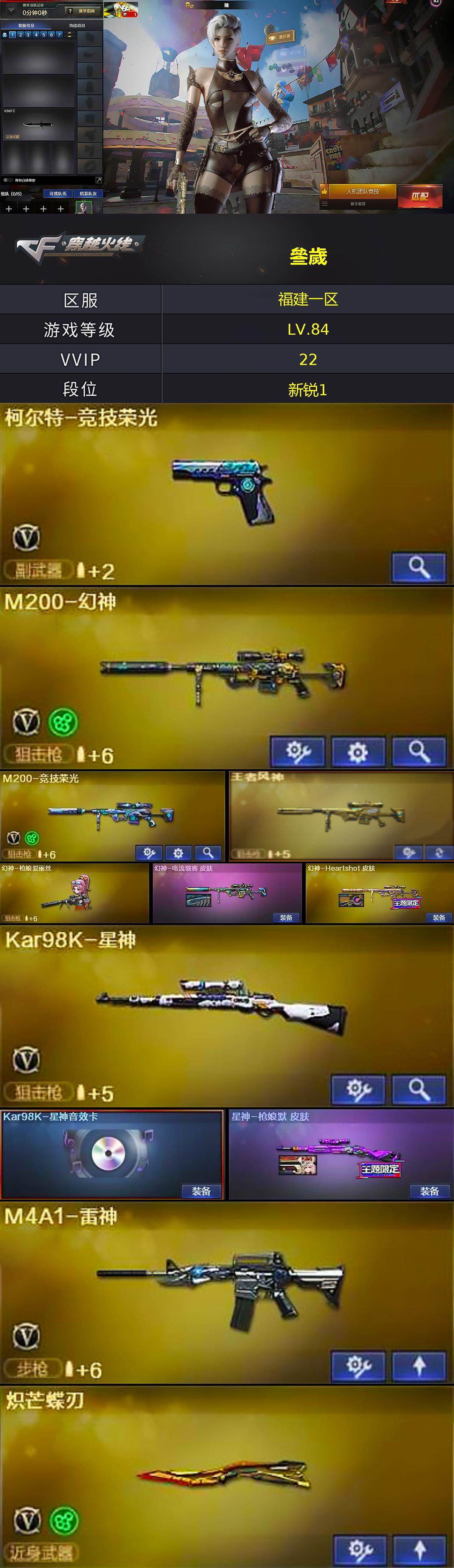 【1851】特36629可排位-可二次【福建一区/21v/vip1】【纯白无封号/幻神2皮肤/星神三件套/竞技荣光套/幻神-呛娘爱丽丝/蝴蝶刀带皮肤/四防角色】【m200-幻神/幻神-电流骇客 皮肤/幻神-heartshot 皮肤】【kar98k-星神/kar98k-星神音效卡/星神-呛娘默 皮肤】【m200-竞技荣光】【王者风神】【炽芒蝶刃/炽芒蝶刃-破浪逐光 皮肤】【柯尔特-竞技荣光】【m4a1-雷神/雷神-heartshot 皮肤】【barrett-毁灭/毁灭-星空】【黑骑士-海王】【擎天-竞技荣光2】【屠龙】【王者-魅影/木兰/修道士/兔囡囡/灵狐-花神/妲己】【scar light-像素】【ak12-天启】【an94-超新星】【柯尔特-萌杀/新usp-呛王排位奖励】【牛牛-ak47/猫猫手套/火麒麟-灵狐】【王者蔷薇】【高爆手蕾-竞技荣光/闪光丹-竞技荣光3/盐雾蛋-竞技荣光】【运动护目镜/超级背包/防弹头盔2/防弹衣2/c4工具钳2/手蕾包2/防化服2】截图展示段位不代表实际段位,如赛季更新等不/拒因素发生变化、时限道具不保证所剩时间