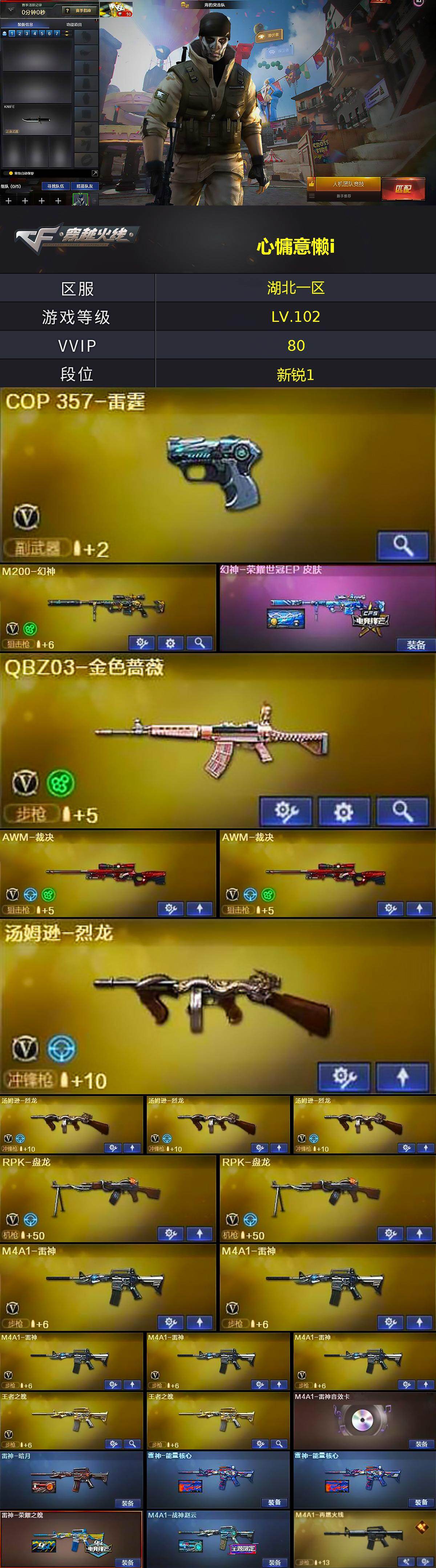 [16321033]湖北一区-83v-11王者武器数-6炫金武器数 【热门武器】:q03-金色蔷薇,m200-幻神,死亡之眼,金色小号,牛牛-ak47,m4a1-黑骑士,汤姆逊-烈龙4,rpk-盘龙2,加特林-炼狱,沙鹰-修罗6 【王者炫金武器】:玫瑰精灵-悦动,王者之魄,王者之心,王者之力3,王者之灵,王者之锋,炫金骑士2,炫金毁灭3,炫金天龙 【音效卡】:ak47-火麒麟音效卡,m4a1-雷神音效卡,m4a1-黑骑士音效卡,barrett-毁灭音效卡,炼狱-百战金芒-庆典舞曲音效卡 【皮肤】:幻神-荣耀世冠ep 皮肤,雷神-暗月,雷神-能量核心2,雷神-荣耀之魄,m4a1-战神赵云,m4a1-再燃火线,火麒麟-雷神,火麒麟-战神关羽,毁灭-暗月,毁灭耀金皮肤,毁灭-战神张飞,毁灭-虹光风暴 皮肤,毁灭-英雄计划 皮肤,m4a1-千变-孔明皮肤,黑龙-能量核心,黑骑士-暗月,黑骑士-战神马超,无影-暗月2,无影耀金皮肤,死神-秘银2,ak47-黑武士-361,天启-暗月2,战神-粉色甜心皮肤3,战神-紫绶金章皮肤5,战神-流金岁月皮肤3,天龙-秘银,天龙-能量核心,极光-能量核心2,修罗-能量核心,修罗-冠军之魂,天神-暗月,轻型军用手斧-再燃火线 【角色】:葵,战地猎狐,乔伊教练,修道士,空,初恋灵狐,风暴女,零-水下丽影,灵狐者-黄金海岸,麻雀,斯沃特-x,铁骑荣耀,兔囡囡,维纳斯,影武者-x,游珑儿,海豹突击队 【人偶武器】:cop-旗袍,牛牛-ak47,夺魂2,闪光丹-小乔 【暴走生化】:死亡之眼,超级对讲机 【挑战大师】:冰龙粉碎者-白马银呛,激光毁灭者iii,神圣爆裂者-末日iii 【英雄级武器】:ak47-火麒麟4,m4a1-黑龙,m4a1-雷神5,m4a1-黑骑士,ak47-无影,ak47-黑武士2,ak12-天启,m4a1-武圣2,q03-金色蔷薇,王者之魄-觉醒版,王者之势-觉醒版,ak-47-猩红传说10,ak47-b-战神,awm-天龙,barrett-毁灭,barrett-极光2,awm-裁决2,m200-幻神,王者之怒-觉醒版,rpk-盘龙2,加特林-炼狱,炼狱-百战金芒,汤姆逊-烈龙4,沙鹰-修罗6,沙鹰-天神,cop-雷霆,屠龙4,龙啸2,擎天2,麒麟刺3,麒麟刺-百战金芒,高爆手蕾-