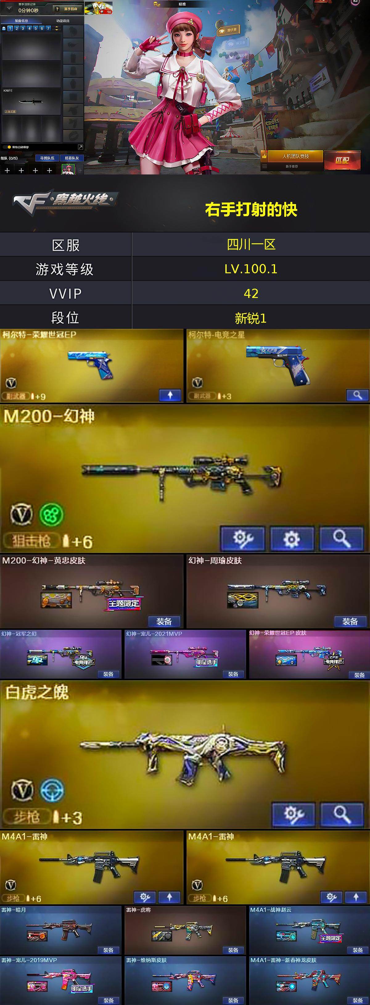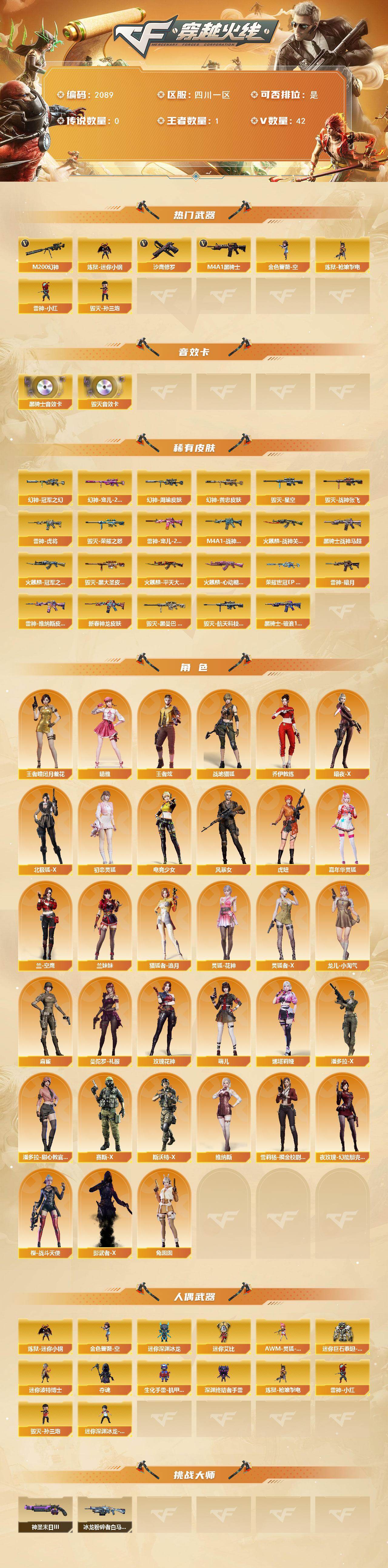 【2089】贝32242可排位-可二次【四川一区/42v/vip1】【幻神三件套/5皮肤/ep套/ep柯尔特ep小刀/2四防角色】【m200-幻神/幻神-宠儿-2021mvp/幻神-冠军之幻/幻神-周瑜皮肤/m200-幻神-黄忠皮肤】【白虎之魄】【m4a1-雷神2/雷神-宠儿-2019mvp/m4a1-战神赵云/雷神-维纳斯皮肤/雷神-暗月/雷神-虎将】【barrett-毁灭/barrett-毁灭音效卡/芭蕾特-毁灭-cfpl冠军/毁灭-荣耀之怒/毁灭-航天科技皮肤/毁灭-星空/毁灭-战神张飞/毁灭-黑曼巴 皮肤】【ak47-火麒麟2/火麒麟-冠军之心/火麒麟-cfstar/火麒麟-心动糖果/火麒麟-战神关羽/火麒麟-平天大圣】【m4a1-黑骑士/m4a1-黑骑士音效卡/黑骑士-战神马超】【ak47-无影/无影-神兵利器】【barrett-极光/barrett-极光音效卡】【沙鹰-修罗/修罗-cfstar】【天神-动感闪耀】【屠龙-动感闪耀/屠龙-秘银】【晴雅/王者炫/王者-瞳-闭月羞花/龙儿-小淘气/暗夜-x/木兰/乔伊教练/兔囡囡/灵狐-花神/萌儿/麻雀/紫霞/妲己/潘多拉-x/斯沃特-x/救世主-x/影武者-x/幻影/堕天使】【m4a1-神工天巧】【ak-47-猩红传说】【colt1911-小故障/colt 1911-大黄蜂/柯尔特-萌杀/新usp-呛王排位奖励5】【迷你深渊冰龙/唐刀-神工天巧】【神圣爆裂者-末日iii/冰龙粉碎者-白马银呛】【炼狱-迷你小钢/轻型军用手斧-镜】【猫猫手套/雷神-小红/炼狱-呛娘掣电/毁灭-孙三炮/夺魂/金色蔷薇-空】【高爆手蕾-神工天巧2/闪光丹-神工天巧5/盐雾蛋-神工天巧6】【烟雾保护头盔/闪光护目镜/超级背包/防弹头盔4/防弹衣3/c4工具钳4/手蕾包3/防化服】截图展示段位不代表实际段位,如赛季更新等不/拒因素发生变化、时限道具不保证所剩时间