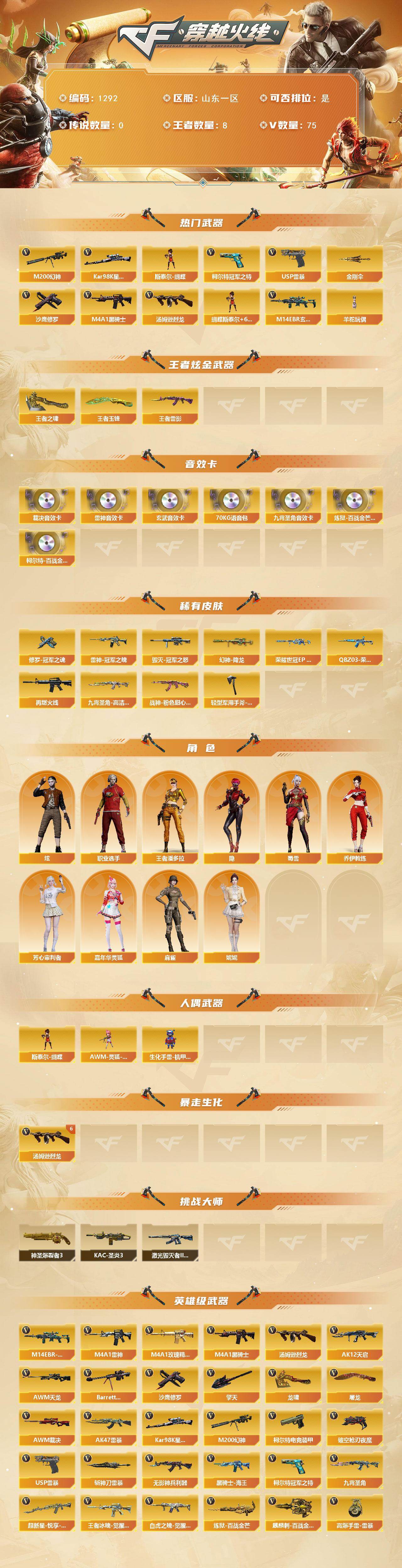 [16358939]山东一区-75v-8王者-0炫金 【热门武器】:m14ebr-玄武,m200-幻神,柯尔特-冠军之特,kar98k-星神,m4a1-黑骑士,汤姆逊-烈龙6,斯泰尔-蝴蝶,羊驼玩偶,usp-雷暴,沙鹰-修罗5,金刚伞 【王者炫金武器】:王者雷影,王者之啸,王者玉锋 【音效卡】:m4a1-雷神音效卡,awm-裁决音效卡,70kg语音包,m14ebr-玄武音效卡,九霄圣角音效卡,炼狱-百战金芒-庆典舞曲音效卡,柯尔特-百战金芒-庆典舞曲音效卡 【皮肤】:幻神-降龙,幻神-荣耀世冠ep 皮肤,q03-荣耀世冠ep 皮肤,雷神-冠军之魄,m4a1-再燃火线,毁灭-冠军之怒,九霄圣角-高洁仙镜 皮肤,战神-粉色甜心皮肤,修罗-冠军之魂,轻型军用手斧-再燃火线 【角色】:炫,隐,妮妮,王者潘多拉,乔伊教练,芳心审判者,嘉年华灵狐,麻雀,蜀雪,职业选手 【人偶武器】:斯泰尔-蝴蝶,awm-灵狐-15周年嘉年华,生化手蕾-机甲核心 【挑战大师】:神圣爆裂者iii,激光毁灭者iii-白马银呛,kac-圣炎切割者iii 【英雄级武器】:m4a1-雷神,m4a1-黑骑士,ak12-天启,ak47-雷暴,m14ebr-玄武,无影-神兵利器,九霄圣角,m4a1-玫瑰精灵,超新星-悦享-觉醒版,王者冰魄-觉醒版,黑骑士-海王,白虎之魄-觉醒版,awm-天龙,barrett-毁灭,awm-裁决,m200-幻神,kar98k-星神,炼狱-百战金芒,汤姆逊-烈龙6,沙鹰-修罗5,usp-雷暴,柯尔特-冠军之特,柯尔特-电竞装甲,破空呛刃-夜魔,柯尔特-荣耀世冠ep2,屠龙2,龙啸7,擎天,斩神刀-雷暴,麒麟刺-百战金芒,高爆手蕾-雷暴5,闪光丹-雷暴5,盐雾蛋-雷暴5,盐雾蛋-荣耀世冠ep 【道具】:bs战队炫彩背包,ep战队炫彩背包,炫彩背包,百战金芒炫彩背包,女皇终结者-魔龙之吻,绿色巨人,灵魂忍者,妖姬2,迷雾幽灵,夺命之镰,防化服2,金色流光-呛王排位2,星辰流光-呛王排位,语音特效-盛典烟火,萌萌小葵表情,ep战队收纳包,ep战队击杀图标,防弹头盔5,防弹衣4,c4工具钳5,手蕾包4 【特殊呛械】:蝴蝶斯泰尔6烈龙,1黑骑士,6烈龙,1蝴蝶斯泰尔