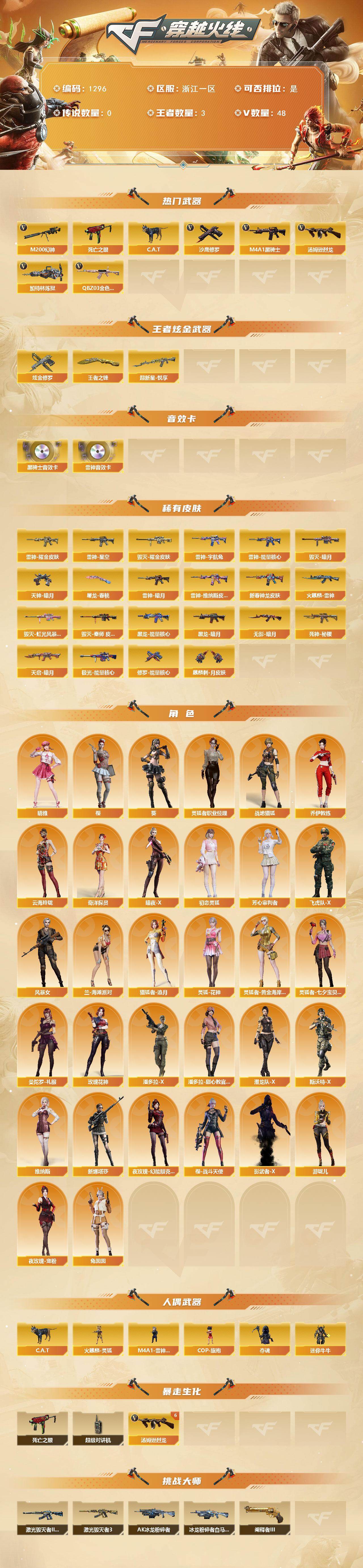 [16360327]浙江一区-48v-3王者-2炫金 【热门武器】:q03-金色蔷薇,m200-幻神,死亡之眼3,c.a.t,m4a1-黑骑士,汤姆逊-烈龙6,加特林-炼狱2,沙鹰-修罗2 【王者炫金武器】:超新星-悦享,王者之锋,炫金修罗2 【音效卡】:m4a1-雷神音效卡,m4a1-黑骑士音效卡 【皮肤】:雷神-暗月,雷神-能量核心,雷神-星空,雷神-耀金皮肤,雷神-宇航兔皮肤,雷神-维纳斯皮肤,m4a1-雷神-新春神龙皮肤,火麒麟-雷神,毁灭-暗月3,毁灭耀金皮肤,毁灭-虹光风暴 皮肤,毁灭-秦师 皮肤,黑龙-能量核心,黑龙-暗月,无影-暗月,死神-秘银2,天启-暗月2,极光-能量核心,修罗-能量核心2,天神-暗月,屠龙-春桃 皮肤,麒麟刺-月皮肤 【角色】:葵,樱,晴雅,战地猎狐,奇洋探员,乔伊教练,云海玲珑,暗夜-x,初恋灵狐,芳心审判者,飞虎队-x,风暴女,兰-海滩派对,猎狐者-追月,灵狐-花神,灵狐者-黄金海岸,灵狐者-七夕宝贝,灵狐者-职业经理,曼陀罗-礼服,玫瑰花神,潘多拉-x,潘多拉-甜心教官,潜龙队-x,斯沃特-x,兔囡囡,维纳斯,新娜塔莎,夜玫瑰-幻能朋克,夜玫瑰-宠粉,樱-战斗天使,影武者-x,游珑儿 【人偶武器】:火麒麟-灵狐,m4a1-雷神-精英刀锋2,cop-旗袍,c.a.t,夺魂,迷你牛牛 【暴走生化】:死亡之眼3,超级对讲机 【挑战大师】:ak47-冰龙粉碎者,冰龙粉碎者-白马银呛2,激光毁灭者iii-白马银呛,激光毁灭者iii,阐释者iii 【英雄级武器】:ak47-火麒麟,m4a1-黑龙,m4a1-雷神2,m4a1-黑骑士,ak47-黑武士,an94-超新星,m4a1-武圣,ak47-黑鲨,黑武士-锦绣游龙,q03-金色蔷薇,ak-47-猩红传说2,barrett-毁灭2,awm-裁决,m200-幻神,barrett-金色蔷薇,加特林-炼狱2,悦蓝-惊涛骇浪-觉醒版,汤姆逊-烈龙6,aa-12-雷霆2,沙鹰-修罗2,沙鹰-天神3,glock18-武圣,屠龙2,龙啸,擎天,麒麟刺3,手蕾-热带奇洋,盐雾蛋-云龙,m4a1-赤狱骑士 【道具】:亚洲杯纪念炫彩背包,冰冰企鹅背包-猛男专用,冰冰企鹅背包,炫彩背包,超级背包2,女皇终结者-魔龙之吻,救世主-黑桃战神,妩媚妖姬,黄金生化钩,绿色巨人,灵