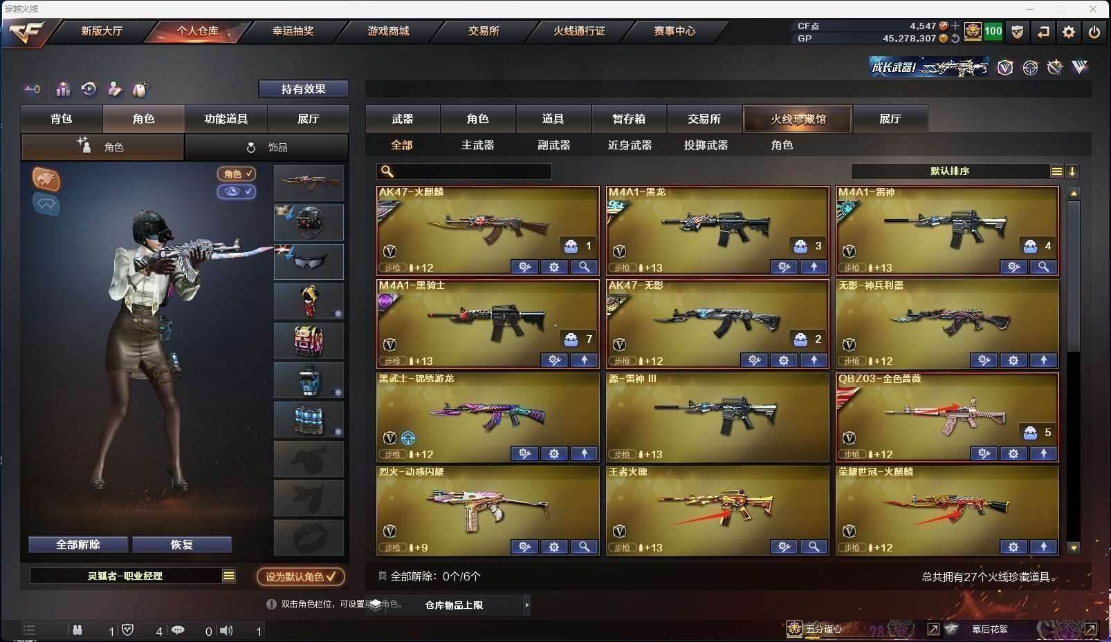 CFD533827号黑龙江区27v vip6【金色蔷薇3件套!!!】【m200幻神】【qbz03金色蔷薇金色蔷薇音效卡呛娘皮肤】【荣耀世冠火麒麟】【雷神荣耀之魄皮肤荣耀世冠ag皮肤】【火麒麟冠军之心皮肤】【黑龙冠军之武皮肤】【王者火魄】【黑骑士 无影神兵利器 黑武士锦绣游龙 无影神兵利器 烈火动感闪耀 极光 】——【热门武器/小人呛】【白虎迷你小艾 金钢伞 牛牛ak 】——【修罗 天神动感闪耀】——【屠龙 屠龙动感闪耀 王者之锋 】——【电竞装甲投掷武器套装】——【角色】【4防灵狐者职业经理】