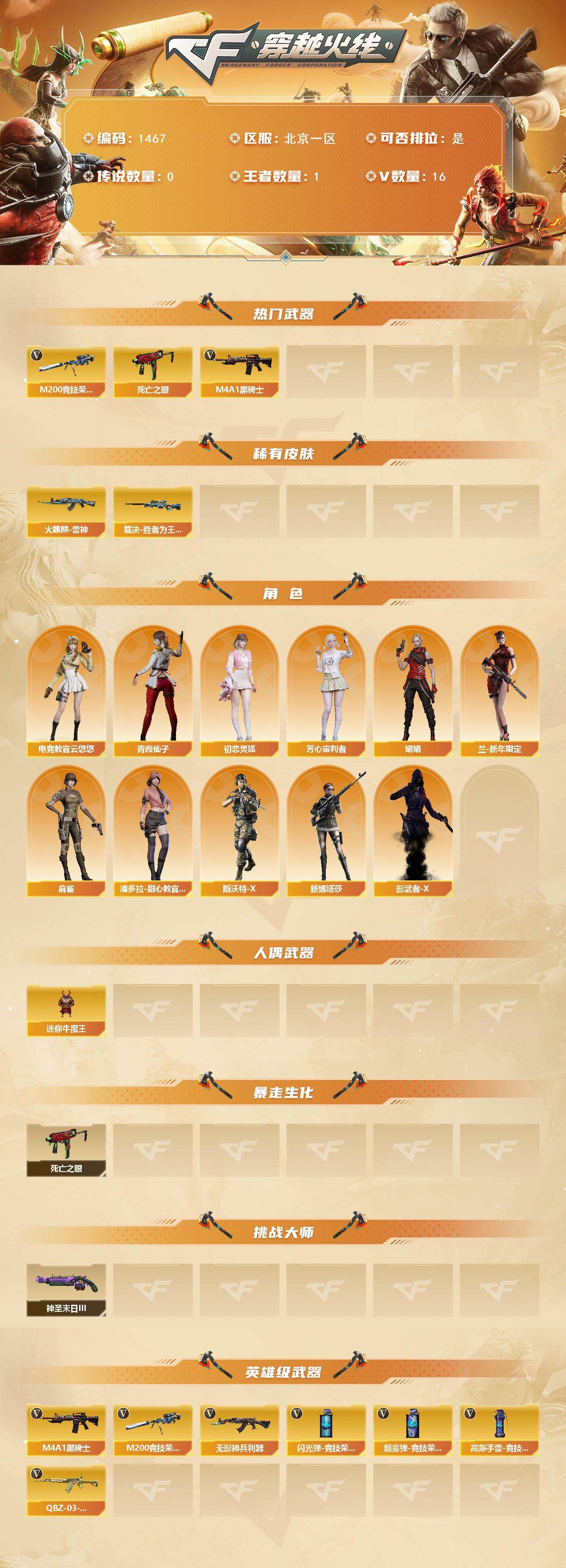 [16373383]北京一区-18v-1王者武器数-0炫金武器数 【热门武器】:m200-竞技荣光,死亡之眼,m4a1-黑骑士 【皮肤】:裁决-胜者为王 皮肤,火麒麟-雷神 【角色】:电竞教官-云悠悠,初恋灵狐,芳心审判者,娟娟,兰-新年限定,麻雀,潘多拉-甜心教官,青霞仙子,斯沃特-x,新娜塔莎,影武者-x 【人偶武器】:迷你牛魔王 【暴走生化】:死亡之眼 【挑战大师】:神圣爆裂者-末日iii 【英雄级武器】:m4a1-黑骑士,无影-神兵利器,q-03-王者蔷薇-觉醒版,m200-竞技荣光,高爆手蕾-竞技荣光,闪光丹-竞技荣光,盐雾蛋-竞技荣光 【道具】:云山科技背包,冰冰企鹅背包,女皇终结者-魔龙之吻,救世主-黑桃战神,绿色巨人,灵魂忍者,迷雾幽灵,夺命之镰,防化服3,金色流光-呛王排位2,星辰流光-呛王排位,呛王排位28赛季金色流光,防弹头盔3,防弹衣3,c4工具钳3,手蕾包3 【特殊呛械】:1黑骑士