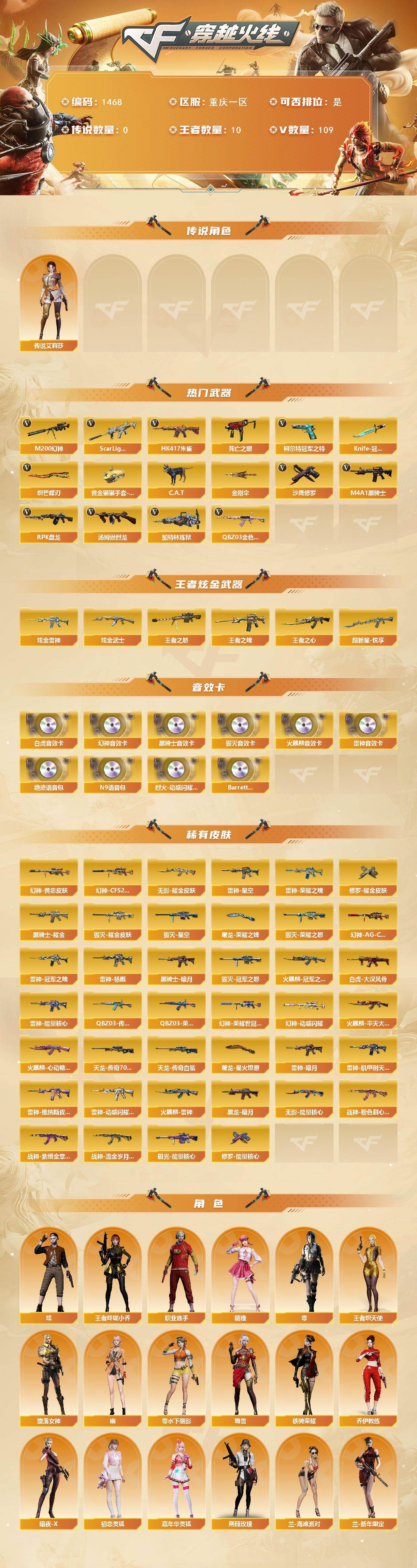 [16373711]重庆一区-116v-10王者武器数-2炫金武器数 【传说角色】:传说艾莉莎 【热门武器】:q03-金色蔷薇,scar light-白虎,hk417-朱雀,m200-幻神2,死亡之眼,柯尔特-冠军之特,c.a.t,m4a1-黑骑士,汤姆逊-烈龙6,rpk-盘龙,加特林-炼狱,沙鹰-修罗5,knife-冠军之刃,炽芒蝶刃,黄金猫猫手套-白鲨,金刚伞 【王者炫金武器】:超新星-悦享,王者之魄,王者之心,王者之怒,炫金雷神,炫金武士 【音效卡】:烈火-动感闪耀 音效卡,m200-幻神音效卡,ak47-火麒麟音效卡,m4a1-雷神音效卡,m4a1-黑骑士音效卡,barrett-毁灭音效卡3,scar light-白虎音效卡,绝迹语音包,n9语音包,barrett-碧霄极光音效卡 【皮肤】:m200-幻神-黄忠皮肤,幻神-ag-cfpls17冠军,幻神-cfs2022,m200-幻神-荣耀世冠白鲨,幻神-动感闪耀 皮肤,白虎-大汉风骨,q03-传奇宠儿,q03-荣耀世冠白鲨,雷神-暗月,雷神-能量核心2,雷神-荣耀之魄,雷神-星空,雷神-冠军之魄,雷神-杨戬,雷神-机甲刑天皮肤,雷神-维纳斯皮肤,雷神-动感闪耀 皮肤,火麒麟-雷神,火麒麟-冠军之心,火麒麟-平天大圣2,火麒麟-心动糖果,毁灭-荣耀之怒,毁灭耀金皮肤,毁灭-星空,毁灭-冠军之怒,黑龙-暗月,黑骑士-暗月,黑骑士耀金皮肤,无影-能量核心,无影耀金皮肤,战神-粉色甜心皮肤2,战神-紫绶金章皮肤5,战神-流金岁月皮肤2,awm-天龙-传奇70kg,awm-天龙-传奇白鲨,极光-能量核心,修罗-能量核心,修罗耀金皮肤,屠龙-荣耀之锋,屠龙-星火燎原 【角色】:零,炫,晴雅,王者玲珑-小乔,王者炽天使,堕落女神,乔伊教练,暗夜-x,初恋灵狐,嘉年华灵狐,荆棘玫瑰,兰-海滩派对,兰-新年限定,零-水下丽影,灵狐者-x,灵狐者-黄金海岸,潘多拉-x,潘多拉-甜心教官,潜龙队-x,斯沃特-x,蜀雪,铁骑荣耀,兔囡囡,新娜塔莎,影武者-x,幽,职业选手 【人偶武器】:火麒麟-灵狐,m4a1-雷神-精英刀锋,cop-旗袍,c.a.t,迷你牛魔王,迷你波特博士,夺魂2,迷你牛牛,深渊终结者手蕾,闪光丹-小乔 【暴走生化】:死亡之眼 【挑战大师】:神圣爆裂者iii,ak47-冰龙粉碎者2,冰龙粉碎者-