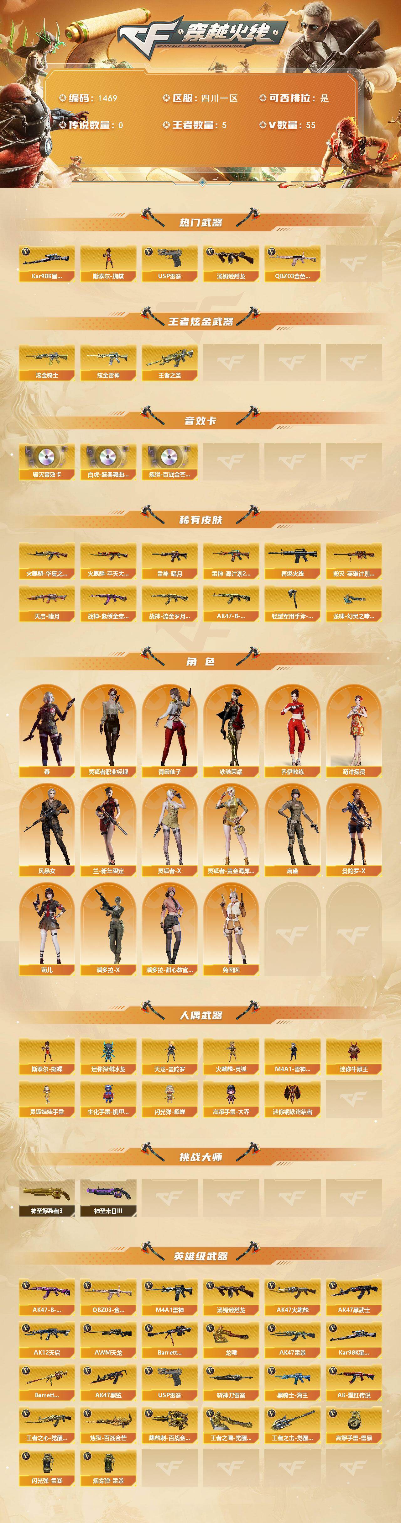 [16374033]四川一区-61v-5王者武器数-3炫金武器数 【热门武器】:q03-金色蔷薇,kar98k-星神,汤姆逊-烈龙2,斯泰尔-蝴蝶,usp-雷暴 【王者炫金武器】:王者之圣,炫金骑士2,炫金雷神 【音效卡】:barrett-毁灭音效卡,白虎-盛典舞曲音效卡,炼狱-百战金芒-庆典舞曲音效卡 【皮肤】:雷神-暗月,雷神-源计划2.0专属 皮肤,m4a1-再燃火线,火麒麟-华夏之心,火麒麟-平天大圣,毁灭-英雄计划 皮肤,天启-暗月,战神-紫绶金章皮肤2,战神-流金岁月皮肤,ak47-b-常胜将军-孙权,轻型军用手斧-再燃火线,龙啸-幻灵之哮 皮肤 【角色】:春,奇洋探员,乔伊教练,风暴女,兰-新年限定,灵狐者-x,灵狐者-黄金海岸,灵狐者-职业经理,麻雀,曼陀罗-x,萌儿,潘多拉-x,潘多拉-甜心教官,青霞仙子,铁骑荣耀,兔囡囡 【人偶武器】:天龙-曼陀罗,火麒麟-灵狐,m4a1-雷神-精英刀锋,迷你钢铁终结者,斯泰尔-蝴蝶,迷你深渊冰龙,迷你牛魔王,生化手蕾-机甲核心,闪光丹-貂蝉,高爆手蕾-大乔,灵狐娃娃手蕾 【挑战大师】:神圣爆裂者iii,神圣爆裂者-末日iii2 【英雄级武器】:ak47-火麒麟,m4a1-雷神,ak47-黑武士,ak12-天启,ak47-黑鲨,ak47-雷暴,q03-金色蔷薇,王者之心-觉醒版,ak-47-猩红传说,黑骑士-海王2,ak47-b-常胜将军,awm-天龙2,barrett-毁灭,barrett-朱雀,kar98k-星神,炼狱-百战金芒,汤姆逊-烈龙2,usp-雷暴,龙啸2,斩神刀-雷暴,麒麟刺-百战金芒,王者之啸-觉醒版2,王者之击-觉醒版,高爆手蕾-雷暴7,闪光丹-雷暴7,盐雾蛋-雷暴7 【道具】:喜狮迎春背包,bs战队炫彩背包,xrock炫彩背包,炫彩背包,百战金芒炫彩背包,超级背包,女皇终结者-魔龙之吻,绿色巨人,灵魂忍者2,妖姬,迷雾幽灵,夺命之镰,防化服3,流光-鎏金之域,呛王排位28赛季金色流光,呛王排位29赛季金色流光,语音特效-盛典烟火,萌萌小葵表情,电玩兔兔表情,斯沃特表情,循环实验表情,防弹头盔5,防弹衣6,c4工具钳5,手蕾包5 【特殊呛械】:蝴蝶斯泰尔2烈龙,2烈龙,1蝴蝶斯泰尔
