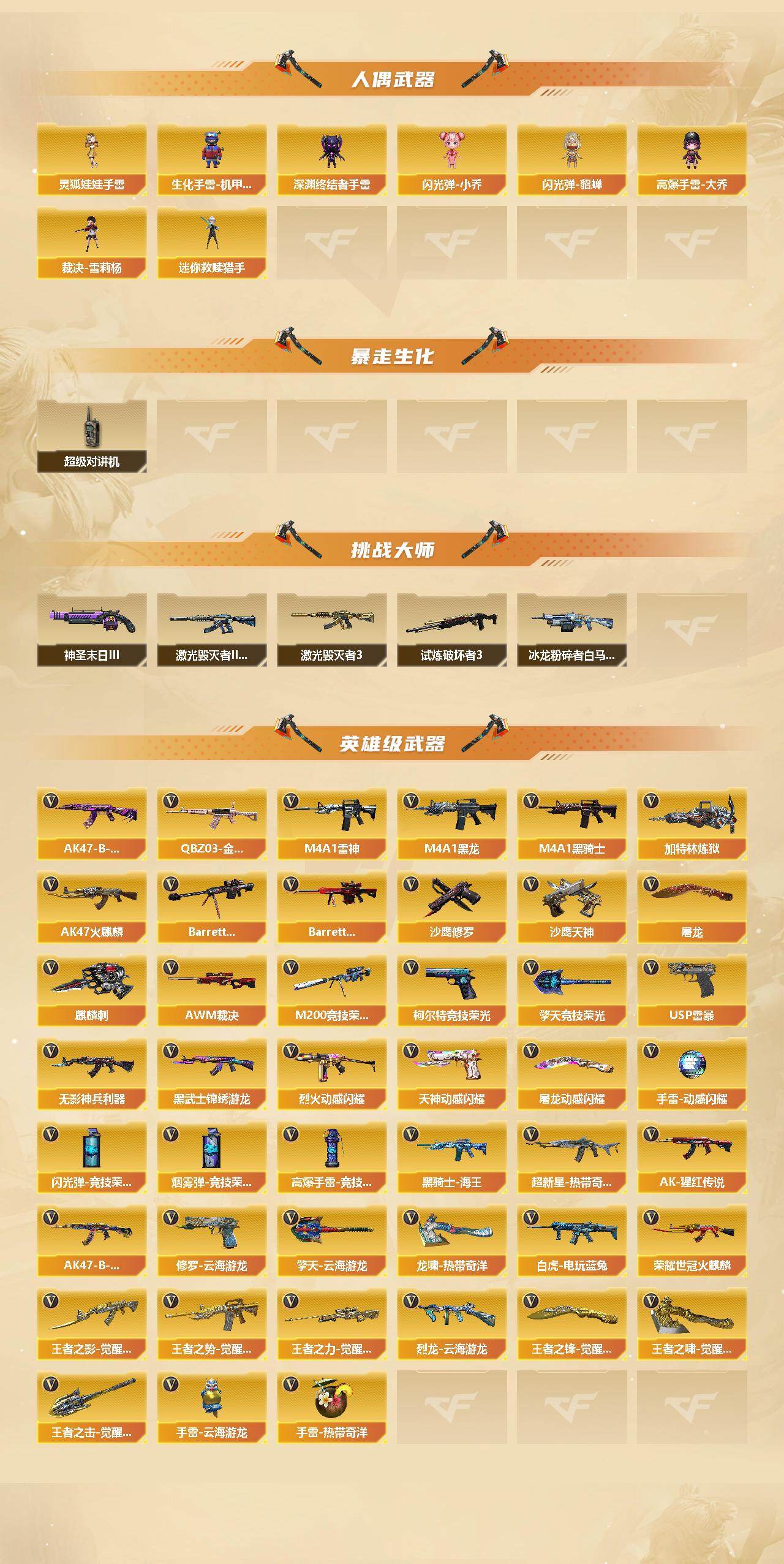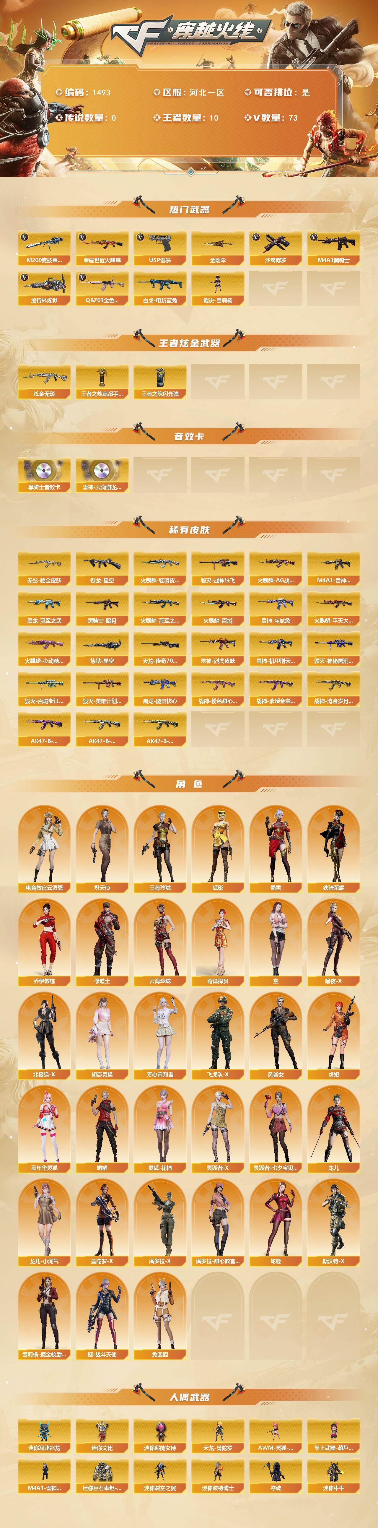 [16406638]河北一区-81v-10王者武器数-1炫金武器数 【热门武器】:q03-金色蔷薇,m200-竞技荣光2,荣耀世冠-火麒麟,白虎-电玩蓝兔,m4a1-黑骑士,加特林-炼狱,裁决-雪莉杨,usp-雷暴,沙鹰-修罗,金刚伞 【王者炫金武器】:炫金无影,王者之魄高爆手蕾,王者之魄闪光丹 【音效卡】:m4a1-雷神-云海游龙音效卡,m4a1-黑骑士音效卡 【皮肤】:烈龙-星空,m4a1-雷神-cfs 2019,雷神-烈虎皮肤,雷神-机甲刑天皮肤,雷神-宇航兔皮肤,火麒麟-ag战队皮肤,火麒麟-冠军之心,火麒麟-轻羽皮肤,火麒麟-平天大圣2,火麒麟-百城,火麒麟-心动糖果,毁灭-战神张飞,毁灭-神秘黑洞皮肤,毁灭-百城浙江 皮肤,毁灭-英雄计划 皮肤,黑龙-能量核心,黑龙-冠军之武,黑骑士-暗月,无影耀金皮肤,战神-粉色甜心皮肤2,战神-紫绶金章皮肤3,战神-流金岁月皮肤3,ak47-b-常胜将军-曹操2,ak47-b-常胜将军-刘备2,ak47-b-常胜将军-孙权,awm-天龙-传奇70kg,炼狱-星空 【角色】:电竞教官-云悠悠,王者玲珑,狐影,奇洋探员,乔伊教练,修道士,云海玲珑,炽天使,空,暗夜-x,北极狐-x,初恋灵狐,芳心审判者,飞虎队-x,风暴女2,虎妞,嘉年华灵狐,娟娟,灵狐-花神,灵狐者-x,灵狐者-七夕宝贝,龙儿,龙儿-小淘气,曼陀罗-x,潘多拉-x,潘多拉-甜心教官,蛇姬,斯沃特-x,蜀雪,铁骑荣耀,兔囡囡,雪莉杨-摸金校尉,樱-战斗天使 【人偶武器】:裁决-雪莉杨,天龙-曼陀罗,m4a1-雷神-精英刀锋,迷你救赎猎手,awm-灵狐-15周年嘉年华,迷你深渊冰龙,迷你裂空之翼,迷你波特博士,夺魂,迷你牛牛2,生化手蕾-机甲核心3,深渊终结者手蕾4,闪光丹-小乔,闪光丹-貂蝉,高爆手蕾-大乔,迷你艾比,迷你超能女侍,迷你巨石泰坦-魔花研究所,灵狐娃娃手蕾,掌上武器-葫芦兄弟 【暴走生化】:超级对讲机 【挑战大师】:冰龙粉碎者-白马银呛,激光毁灭者iii-白马银呛,激光毁灭者iii,试炼破坏者iii,神圣爆裂者-末日iii2 【英雄级武器】:ak47-火麒麟2,m4a1-黑龙,m4a1-雷神,m4a1-黑骑士,无影-神兵利器,黑武士-锦绣游龙,超新星-热带奇洋,q03-金色蔷薇,烈火-动感闪耀,王者之影-觉醒版,王者之势-觉醒