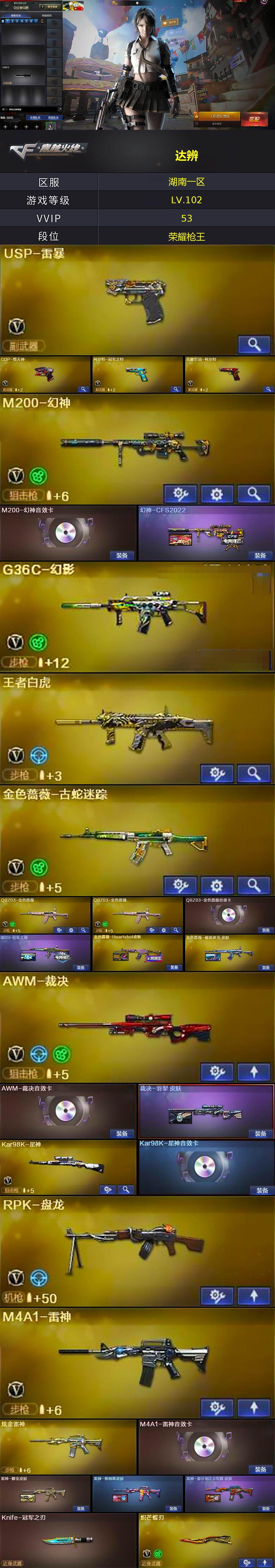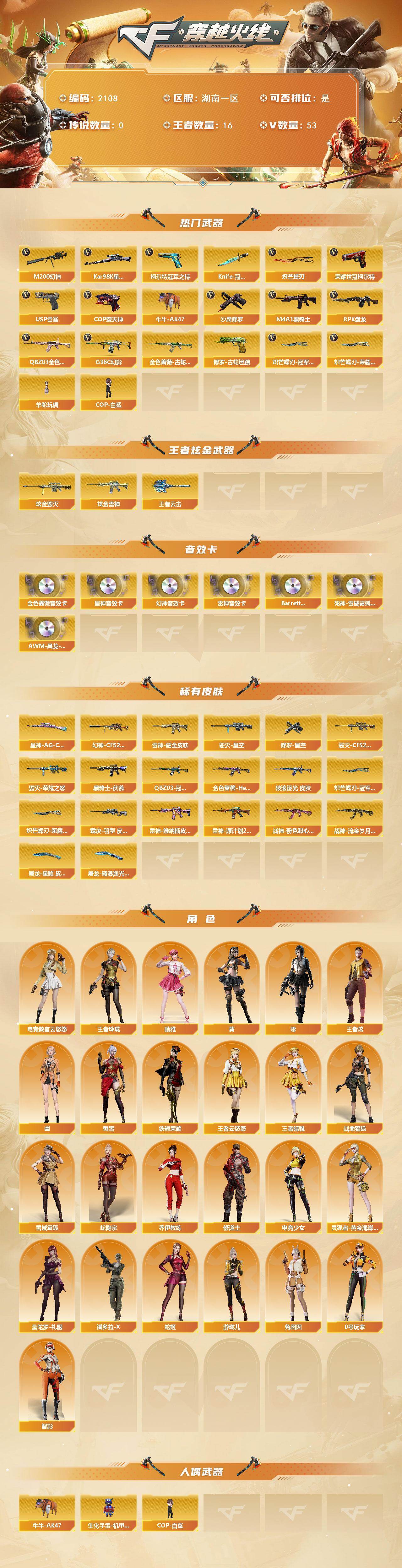 【2108】特52992可排位-可二次【湖南一区/69v/vip4】【8位qq/附赠王者荣耀v7150多皮肤/幻神三件套/星神三件套/裁决三件套/g36c幻影/冠军之特冠军小刀/蝴蝶刀带皮肤/2柯尔特copusp/5四防角色/q三件套】【m200-幻神/m200-幻神音效卡/幻神-cfs2022】【kar98k-星神/kar98k-星神音效卡】【王者白虎】【炽芒蝶刃/炽芒蝶刃-荣耀世冠白鲨2023 皮肤】【knife-冠军之刃】【g36c-幻影】【柯尔特-冠军之特/荣耀世冠-柯尔特/usp-雷暴】【q03-金色蔷薇2/q03-金色蔷薇音效卡/q03-冠军之薇/金色蔷薇-破浪逐光 皮肤】【王者云击/王者之势/王者之光】【m4a1-雷神/m4a1-雷神音效卡/雷神-耀金皮肤/雷神-维纳斯皮肤】【cop-堕天神】【barrett-毁灭/barrett-毁灭音效卡/毁灭-荣耀之怒/毁灭-cfs2020/毁灭-星空】【ak47-火麒麟】【m4a1-黑骑士/黑骑士-伏羲】【黑武士-锦绣游龙】【awm-裁决/awm-裁决音效卡】【rpk-盘龙】【沙鹰-修罗3/修罗-星空】【沙鹰-天神】【麒麟刺】【擎天】【屠龙/屠龙-破浪逐光 皮肤】【龙啸2】【电竞教官-云悠悠/王者晴雅/晴雅/王者云悠悠/王者炫/王者玲珑/幽/乔伊教练/修道士/兔囡囡/灵狐者-黄金海岸/蜀雪/潘多拉-x/救世主-x/铁骑荣耀/幻影/堕天使/复仇者】【ak12-天启】【colt1911-小故障2/colt 1911-大黄蜂3/新usp-呛王排位奖励2】【雷霆王者之锋/斩神刀3】【kac-圣炎切割者iii/冰龙粉碎者-白马银呛】【斯泰尔-巧克力/轻型军用手斧-镜】【牛牛-ak47/cop-白鲨】【高爆手蕾-竞技荣光2/闪光丹-竞技荣光2/盐雾蛋-竞技荣光2】【高爆手蕾-雷暴/闪光丹-雷暴/盐雾蛋-雷暴】【高爆手蕾-雷霆王者3/闪光丹-雷霆王者/盐雾蛋-雷霆王者】【高爆手蕾-堕天神/闪光丹-堕天神/盐雾蛋-堕天神】【炫金雷神/炫金毁灭】【超级护目镜/透明头盔/透明护目镜/烟雾保护头盔/闪光护目镜/超级对讲机/防弹头盔3/防弹衣3/c4工具钳4/手蕾包4/防化服2】截图展示段位不代表实际段位,如赛季更新等不/拒因素发生变化、时限道具不保证所剩时间