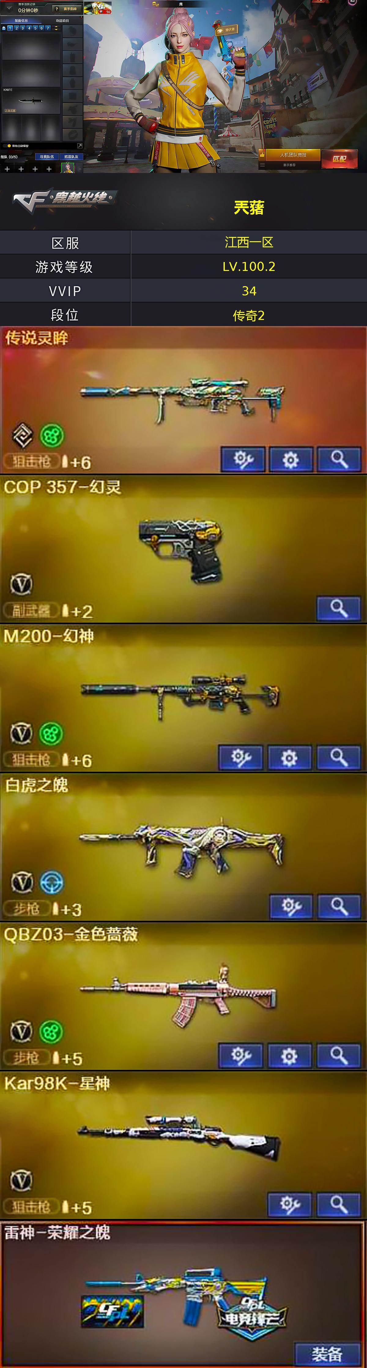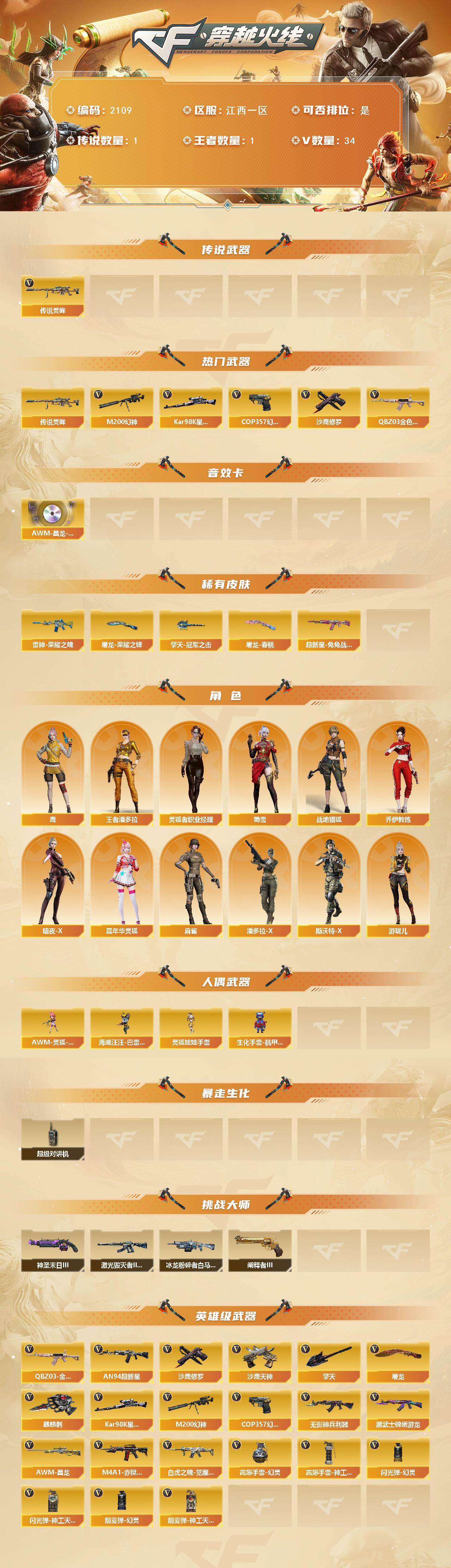 【2109】特62658可排位-可二次【江西一区/34v/vip6/1传说】【传说灵眸/m200-幻神/kar98k-星神/白虎之魄/q03-金色蔷薇/6手呛/四防角色】【雷神-荣耀之魄】【cop 357-幻灵】【火麒麟-cfstar】【无影-神兵利器】【黑武士-锦绣游龙】【鹰】【沙鹰-修罗4/修罗-cfstar】【沙鹰-天神】【麒麟刺】【擎天/擎天-冠军之击】【屠龙2/屠龙-荣耀之锋3/屠龙-春桃 皮肤】【龙啸-烈火龙威】【王者潘多拉/暗夜-x/木兰/乔伊教练/麻雀/蜀雪/潘多拉-x/斯沃特-x/堕天使】【an94-超新星】【colt 1911-大黄蜂/新usp-呛王排位奖励3】【神圣爆裂者-末日iii/激光毁灭者iii-白马银呛/冰龙粉碎者-白马银呛/阐释者iii】【斯泰尔-巧克力】【猫猫手套/龙宝投影/海滩汪汪-芭蕾特/cop-斯沃特】【高爆手蕾-神工天巧2/闪光丹-神工天巧2/盐雾蛋-神工天巧2】【高爆手蕾-幻灵4/闪光丹-幻灵2/盐雾蛋-幻灵2】【超级对讲机/防弹头盔3/防弹衣3/c4工具钳3/手蕾包3/防化服3】截图展示段位不代表实际段位,如赛季更新等不/拒因素发生变化、时限道具不保证所剩时间