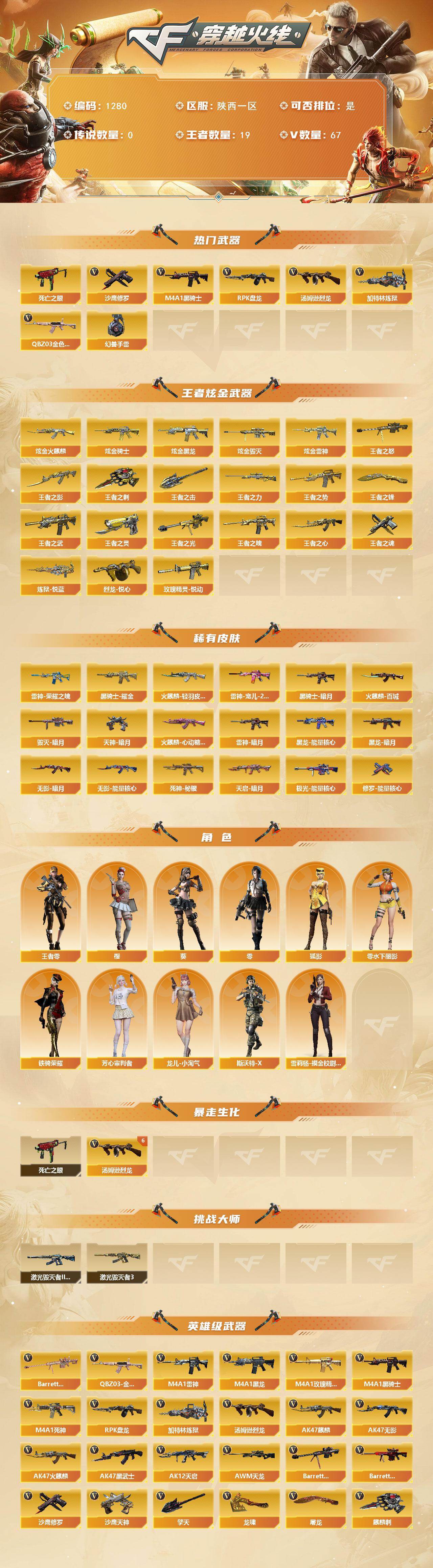 [16408630]陕西一区-67v-19王者-6炫金 【热门武器】:q03-金色蔷薇,死亡之眼,m4a1-黑骑士3,汤姆逊-烈龙6,rpk-盘龙2,加特林-炼狱,沙鹰-修罗5,高爆手蕾-幻兽 【王者炫金武器】:王者之势,王者之武2,玫瑰精灵-悦动,王者之影,王者之魄2,王者之心,王者之光,王者之怒,王者之力,炼狱-悦蓝,烈龙-悦心,王者之灵,王者之魂,王者之刺,王者之击,王者之锋2,炫金火麒麟,炫金骑士,炫金黑龙,炫金雷神2,炫金毁灭 【皮肤】:雷神-暗月,雷神-荣耀之魄,雷神-宠儿-2019mvp,火麒麟-轻羽皮肤,火麒麟-百城,火麒麟-心动糖果,毁灭-暗月2,黑龙-能量核心,黑龙-暗月,黑骑士-暗月2,黑骑士耀金皮肤,无影-暗月2,无影-能量核心,死神-秘银,天启-暗月2,极光-能量核心2,修罗-能量核心,天神-暗月3 【角色】:零,葵,樱,王者-零,狐影,芳心审判者,零-水下丽影,龙儿-小淘气,斯沃特-x,铁骑荣耀,雪莉杨-摸金校尉 【暴走生化】:死亡之眼 【挑战大师】:激光毁灭者iii-白马银呛,激光毁灭者iii 【英雄级武器】:m4a1-千变,ak47-火麒麟6,ak47-麒麟,m4a1-黑龙2,m4a1-雷神2,m4a1-黑骑士3,ak47-无影,m4a1-死神,ak47-黑武士,ak12-天启,m4a1-武圣,ak47-机械迷城,m4a1-玫瑰精灵,q03-金色蔷薇,awm-天龙,barrett-毁灭,barrett-极光3,barrett-金色蔷薇,rpk-盘龙2,加特林-炼狱,汤姆逊-烈龙6,沙鹰-修罗5,沙鹰-天神,沙鹰-幻兽,屠龙4,龙啸4,擎天,麒麟刺2,女皇利刃-幻兽,高爆手蕾-雷霆,高爆手蕾-幻兽,闪光丹-雷霆,闪光丹-幻兽,盐雾蛋-雷霆,盐雾蛋-幻兽 【道具】:战舰背包,炫彩背包,超级背包,变异宝贝,夺命之镰,防化服,防弹头盔,防弹衣,c4工具钳,手蕾包 【特殊呛械】:3黑骑士,6烈龙,2盘龙,1炼狱