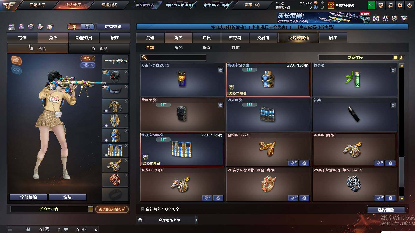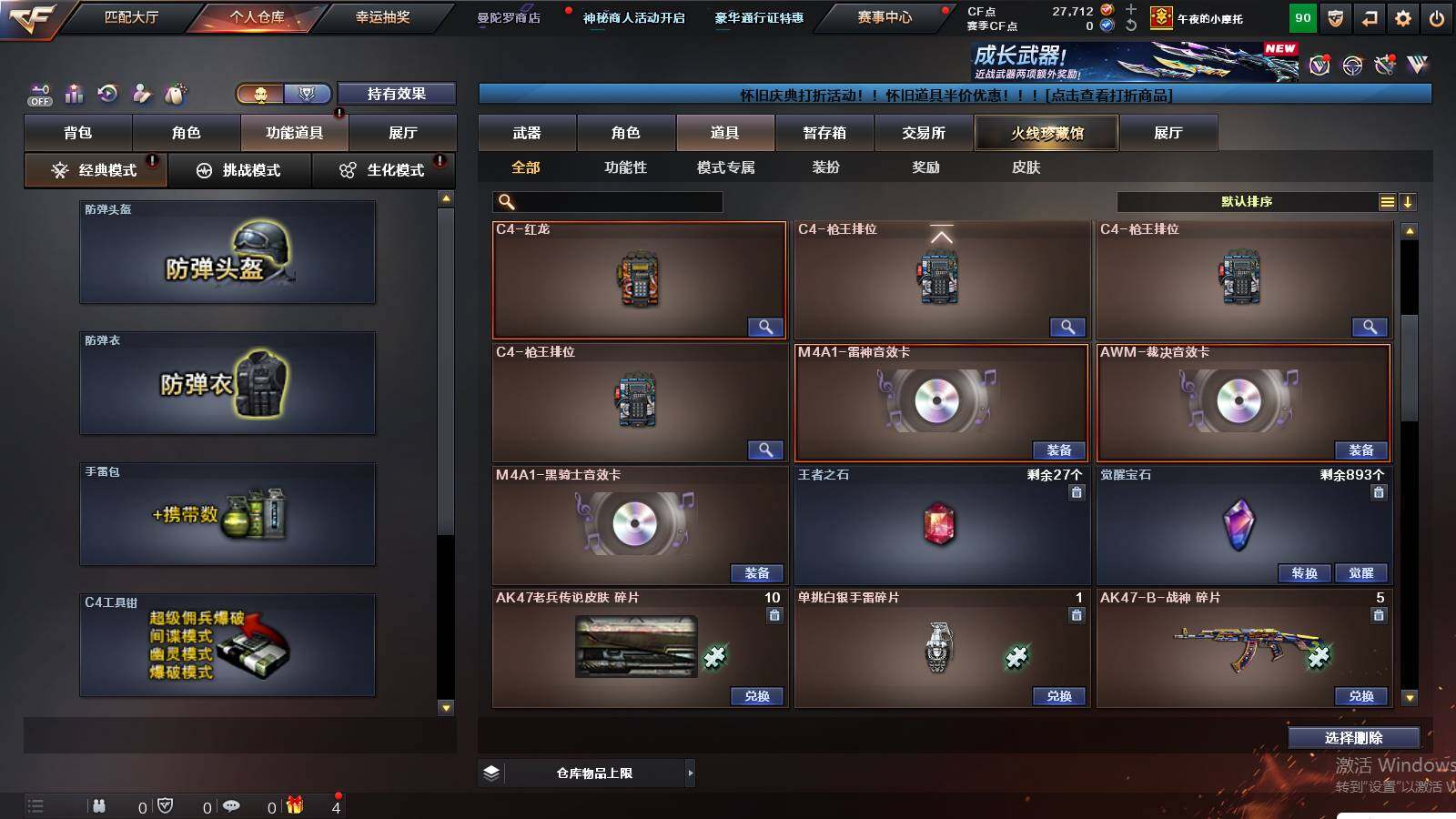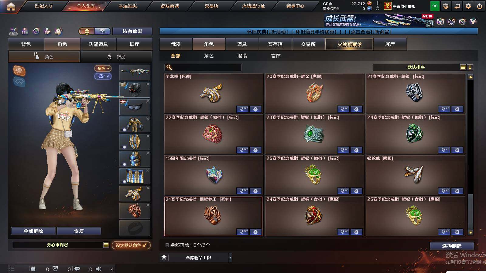 安徽一区-36v 【传说武器】:传说圣灵 【热门武器】:传说圣灵,王者幻神,q03-金色蔷薇,hk417-朱雀,m200-竞技荣光,死亡之眼,沙鹰-修罗3 【王者炫金武器】:王者之心,王者幻神,王者之怒,炫金毁灭 【音效卡】:m4a1-雷神音效卡,m4a1-黑骑士音效卡,awm-裁决音效卡 【皮肤】:awm-裁决-百城联赛天津皮肤,awm-裁决-凤灵皮肤,雷神-星空,雷神-维纳斯皮肤,火