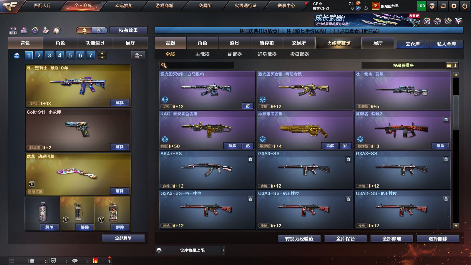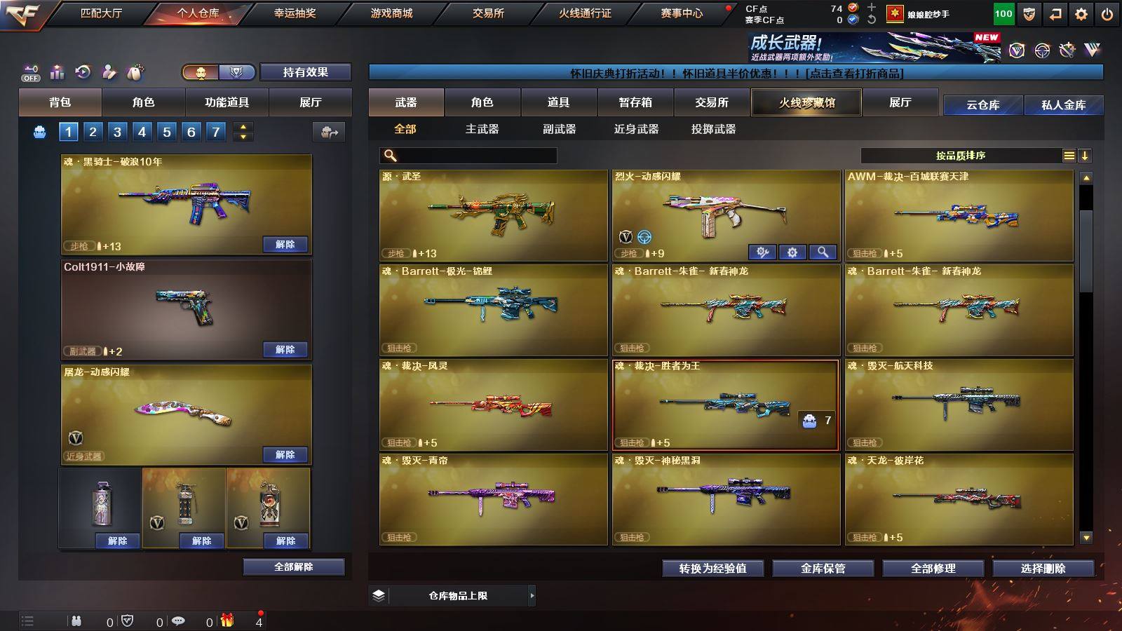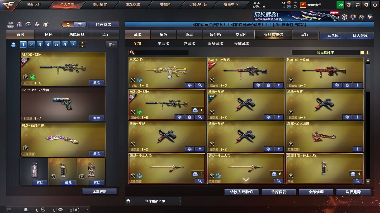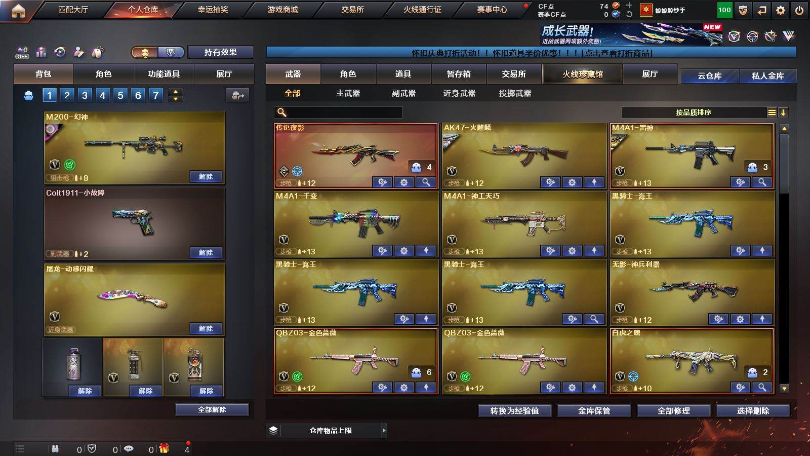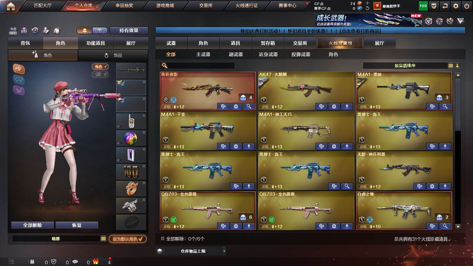 CFD535720号湖南一区30v vip6【幻神3件套!!!】【m200幻神幻神音效卡宠儿皮肤荣耀世冠白鲨皮肤】【传说夜影】【白虎之魄】qbz03金色蔷薇】m4a1神工天巧】【毀灭呛娘皮肤】【雷神宠儿皮肤】【王者之势】【火麒麟千变 黑骑士海王 无影神兵利器 极光】——【修罗4 天神动感闪耀】——【龙啸烈火龙威 唐刀神工天巧】——【角色】【晴雅】