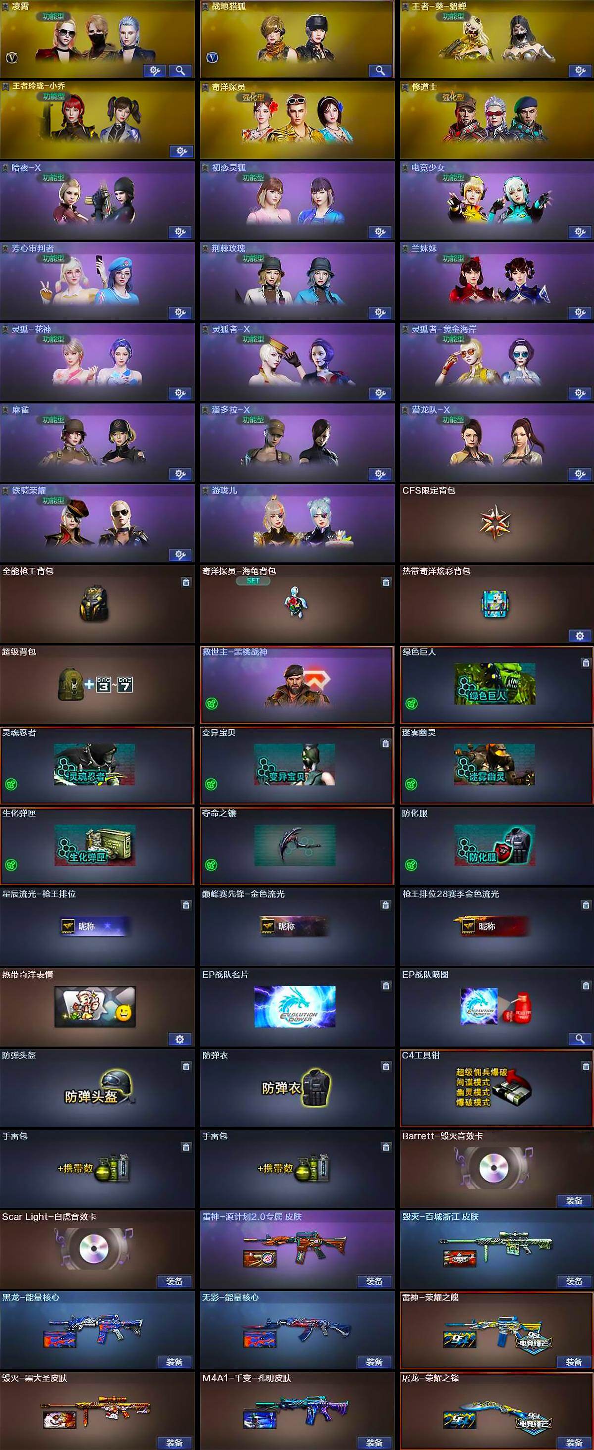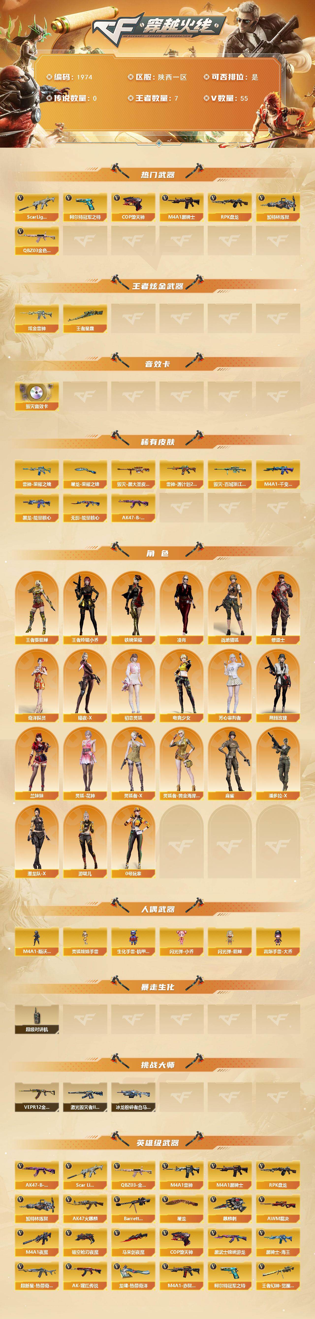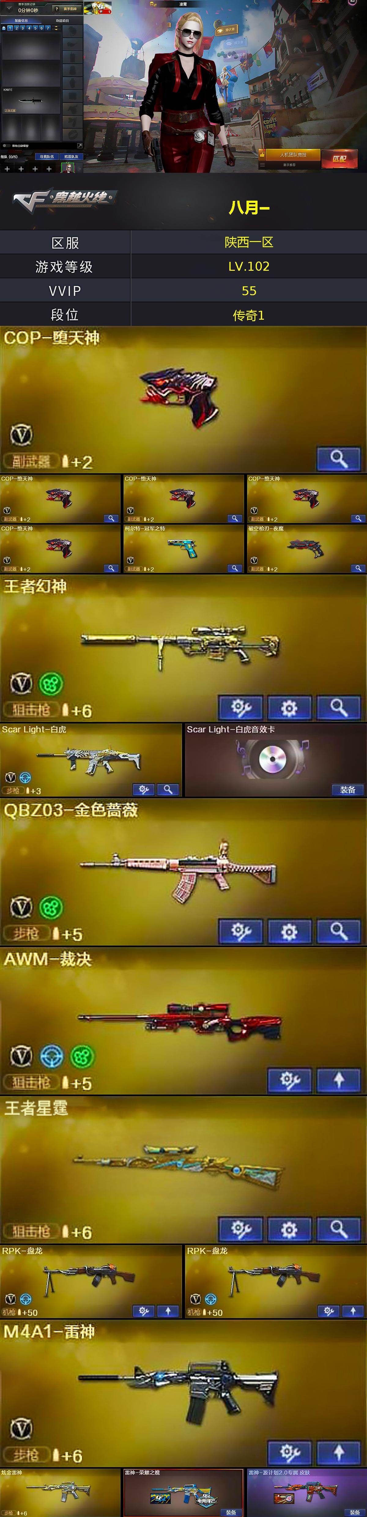 [16445701]陕西一区-56v-7王者武器数-1炫金武器数 【热门武器】:q03-金色蔷薇,scar light-白虎,柯尔特-冠军之特,m4a1-黑骑士,rpk-盘龙2,加特林-炼狱,cop-堕天神5 【王者炫金武器】:王者星霆,炫金雷神 【音效卡】:barrett-毁灭音效卡 【皮肤】:雷神-荣耀之魄,雷神-源计划2.0专属 皮肤,毁灭-黑大圣皮肤,毁灭-百城浙江 皮肤,m4a1-千变-孔明皮肤,黑龙-能量核心,无影-能量核心,ak47-b-常胜将军-曹操,屠龙-荣耀之锋 【角色】:凌霄,战地猎狐,王者-葵-貂蝉,王者玲珑-小乔,奇洋探员,修道士,暗夜-x,初恋灵狐,电竞少女,芳心审判者,荆棘玫瑰,兰妹妹,0号玩家,灵狐-花神,灵狐者-x,灵狐者-黄金海岸,麻雀,潘多拉-x,潜龙队-x,铁骑荣耀,游珑儿 【人偶武器】:生化手蕾-机甲核心2,闪光丹-小乔,闪光丹-貂蝉,高爆手蕾-大乔,m4a1-斯沃特,灵狐娃娃手蕾 【暴走生化】:超级对讲机 【挑战大师】:冰龙粉碎者-白马银呛,激光毁灭者iii-白马银呛,vepr-12-金魔 【英雄级武器】:ak47-火麒麟,m4a1-雷神,m4a1-黑骑士,scar light-白虎,m4a1-夜魔,黑武士-锦绣游龙,超新星-热带奇洋,q03-金色蔷薇,ak-47-猩红传说,黑骑士-海王,ak47-b-常胜将军,barrett-毁灭,awm-裁决,王者幻神-觉醒版,rpk-盘龙2,加特林-炼狱,cop-堕天神5,柯尔特-冠军之特,破空呛刃-夜魔,屠龙2,马来剑-夜魔,麒麟刺,龙啸-热带奇洋,王者之啸-觉醒版,王者之击-觉醒版,高爆手蕾-夜魔7,手蕾-热带奇洋,闪光丹-夜魔7,闪光丹-雷霆王者-觉醒版,盐雾蛋-夜魔7,m4a1-赤狱骑士 【道具】:cfs限定背包,全能呛王背包,奇洋探员-海龟背包,热带奇洋炫彩背包,超级背包,哔哩哔哩名片,救世主-黑桃战神,绿色巨人,灵魂忍者,变异宝贝,迷雾幽灵,生化弹匣,夺命之镰,防化服,星辰流光-呛王排位,巅峰赛先锋-金色流光,呛王排位28赛季金色流光,热带奇洋表情,ep战队名片,ep战队喷图,防弹头盔,防弹衣,c4工具钳,手蕾包2 【特殊呛械】:1白虎,1黑骑士,2盘龙,1炼狱