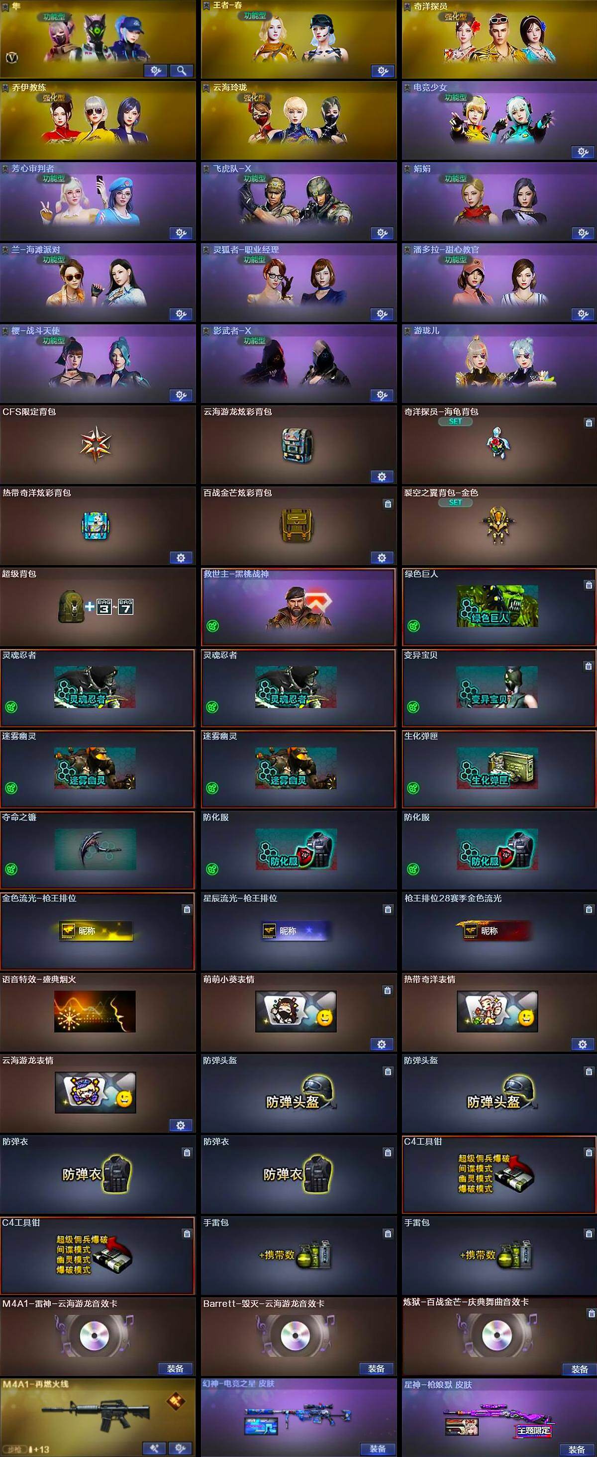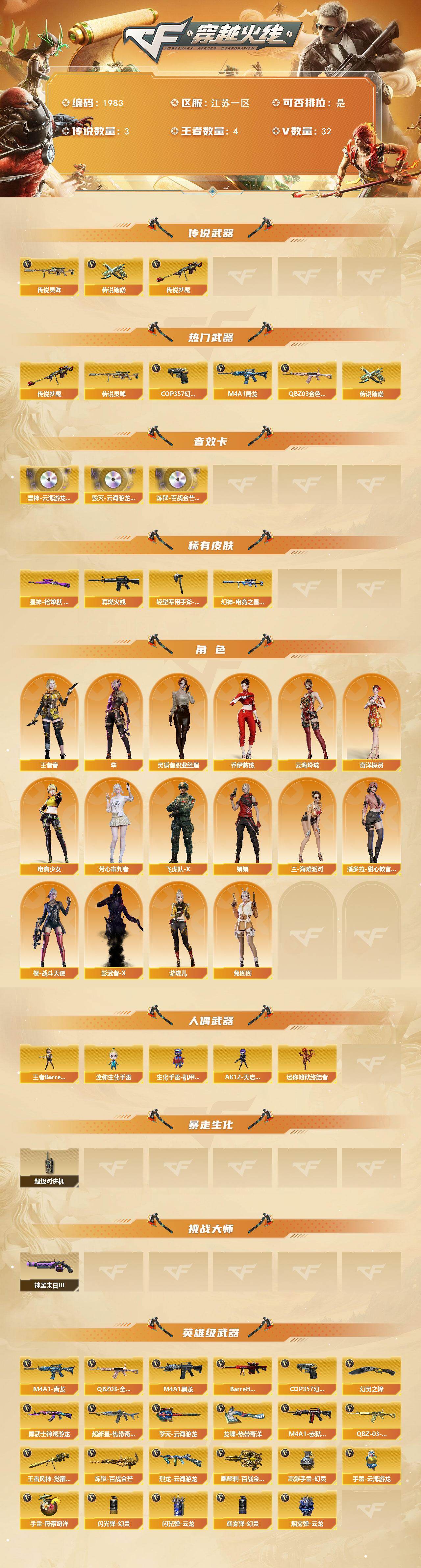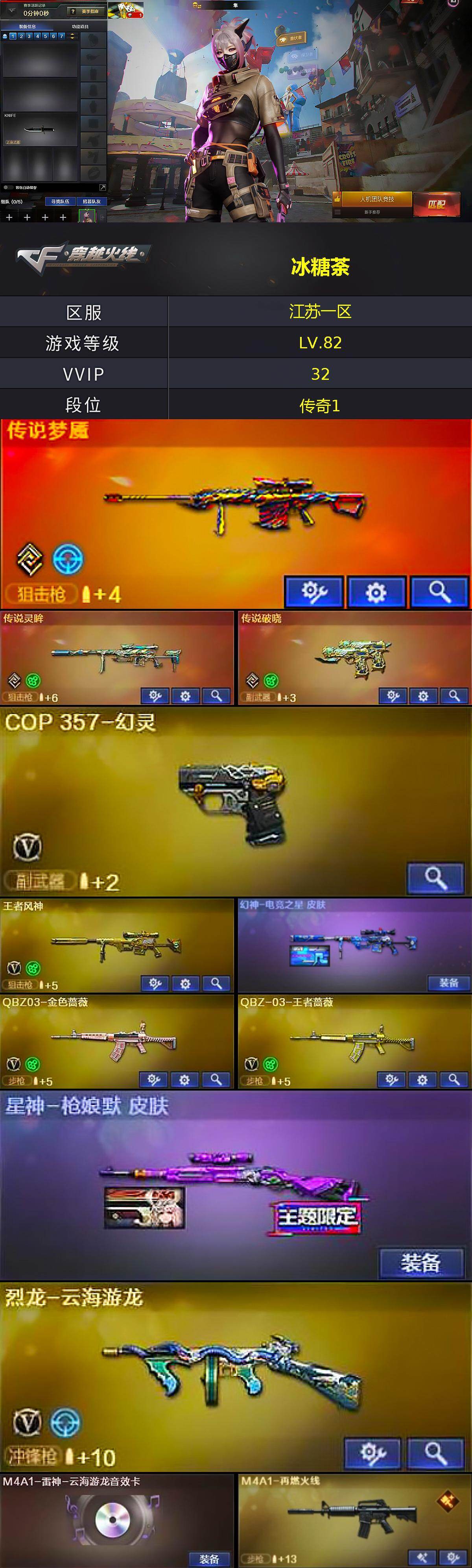 江苏一区-36v-4王者武器数-0炫金武器数 【传说武器】:传说梦魇,传说灵眸,传说破晓 【热门武器】:传说梦魇,传说灵眸,传说破晓,q03-金色蔷薇,m4a1-青龙,cop 357-幻灵 【音效卡】:m4a1-雷神-云海游龙音效卡,barrett-毁灭-云海游龙音效卡,炼狱-百战金芒-庆典舞曲音效卡 【皮肤】:幻神-电竞之星 皮肤,星神-呛娘默 皮肤,m4a1-再燃火线,轻型军用手斧-再