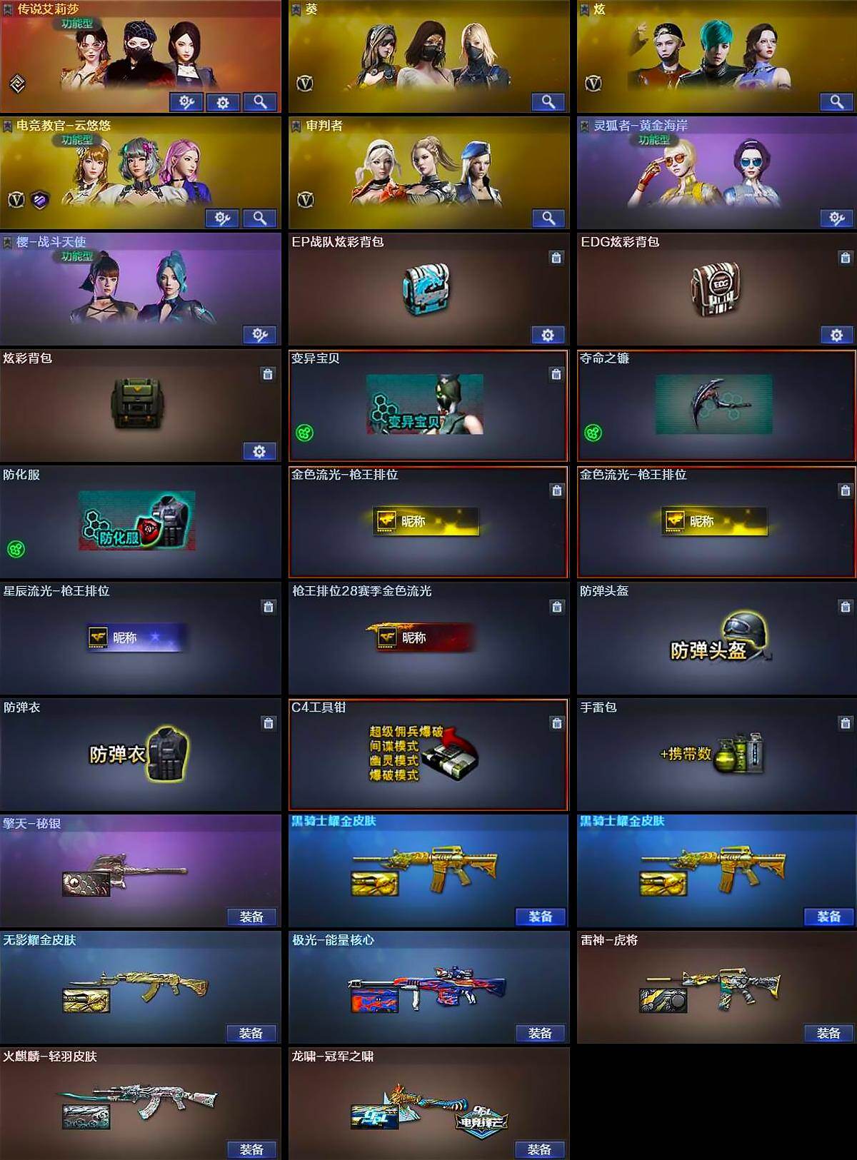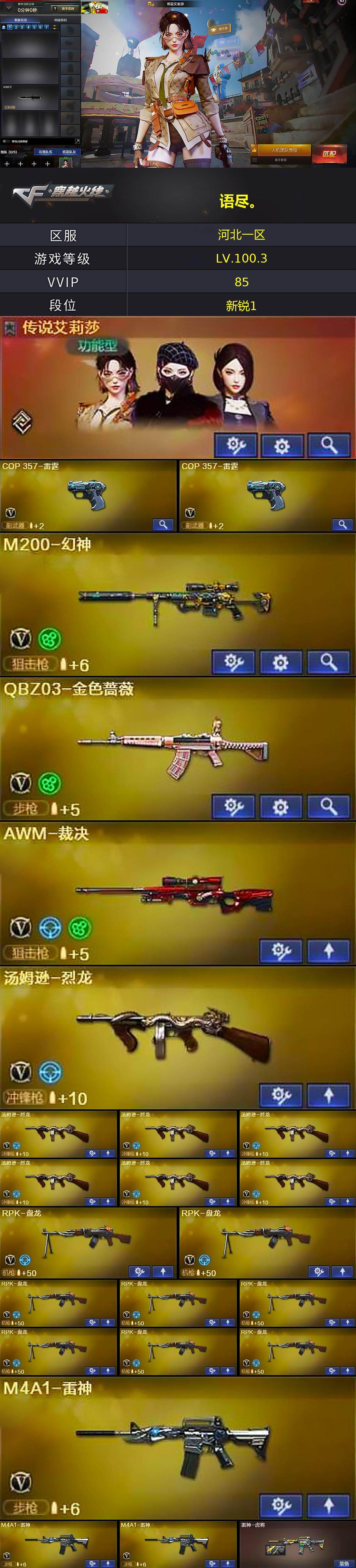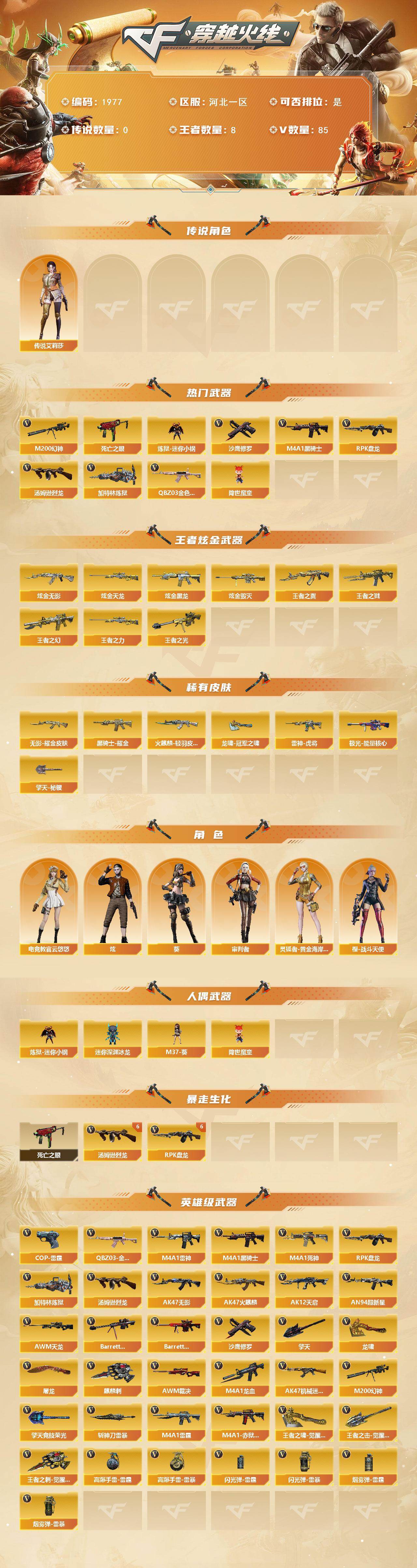 [16447620]河北一区-88v-8王者武器数-6炫金武器数 【传说角色】:传说艾莉莎 【热门武器】:q03-金色蔷薇,m200-幻神,死亡之眼,炼狱-迷你小钢,m4a1-黑骑士2,汤姆逊-烈龙7,rpk-盘龙8,加特林-炼狱2,降世魔童,沙鹰-修罗4 【王者炫金武器】:王者之戮,王者之幻,王者之翼,王者之光,王者之力,炫金无影,炫金黑龙,炫金毁灭3,炫金天龙 【皮肤】:雷神-虎将,火麒麟-轻羽皮肤,黑骑士耀金皮肤2,无影耀金皮肤,极光-能量核心,龙啸-冠军之啸,擎天-秘银 【角色】:葵,炫,电竞教官-云悠悠,审判者,灵狐者-黄金海岸,樱-战斗天使 【人偶武器】:炼狱-迷你小钢,m37-葵,迷你深渊冰龙,降世魔童 【暴走生化】:死亡之眼 【英雄级武器】:ak47-火麒麟2,m4a1-雷神3,m4a1-黑骑士2,ak47-无影,m4a1-死神,ak12-天启,an94-超新星,ak47-机械迷城,m4a1-龙血,m4a1-雷霆,q03-金色蔷薇,awm-天龙2,barrett-毁灭5,barrett-极光,awm-裁决,m200-幻神,rpk-盘龙8,加特林-炼狱2,汤姆逊-烈龙7,沙鹰-修罗4,cop-雷霆2,屠龙,龙啸2,擎天,麒麟刺2,擎天-竞技荣光,斩神刀-雷暴,王者之啸-觉醒版,王者之击-觉醒版,王者之刺-觉醒版,高爆手蕾-雷霆6,高爆手蕾-雷暴,闪光丹-雷霆6,闪光丹-雷暴,盐雾蛋-雷霆6,盐雾蛋-雷暴,m4a1-赤狱骑士 【道具】:ep战队炫彩背包,edg炫彩背包,炫彩背包,变异宝贝,夺命之镰,防化服,金色流光-呛王排位2,星辰流光-呛王排位,呛王排位28赛季金色流光,防弹头盔,防弹衣,c4工具钳,手蕾包 【特殊呛械】:2黑骑士,6烈龙,6盘龙,2炼狱