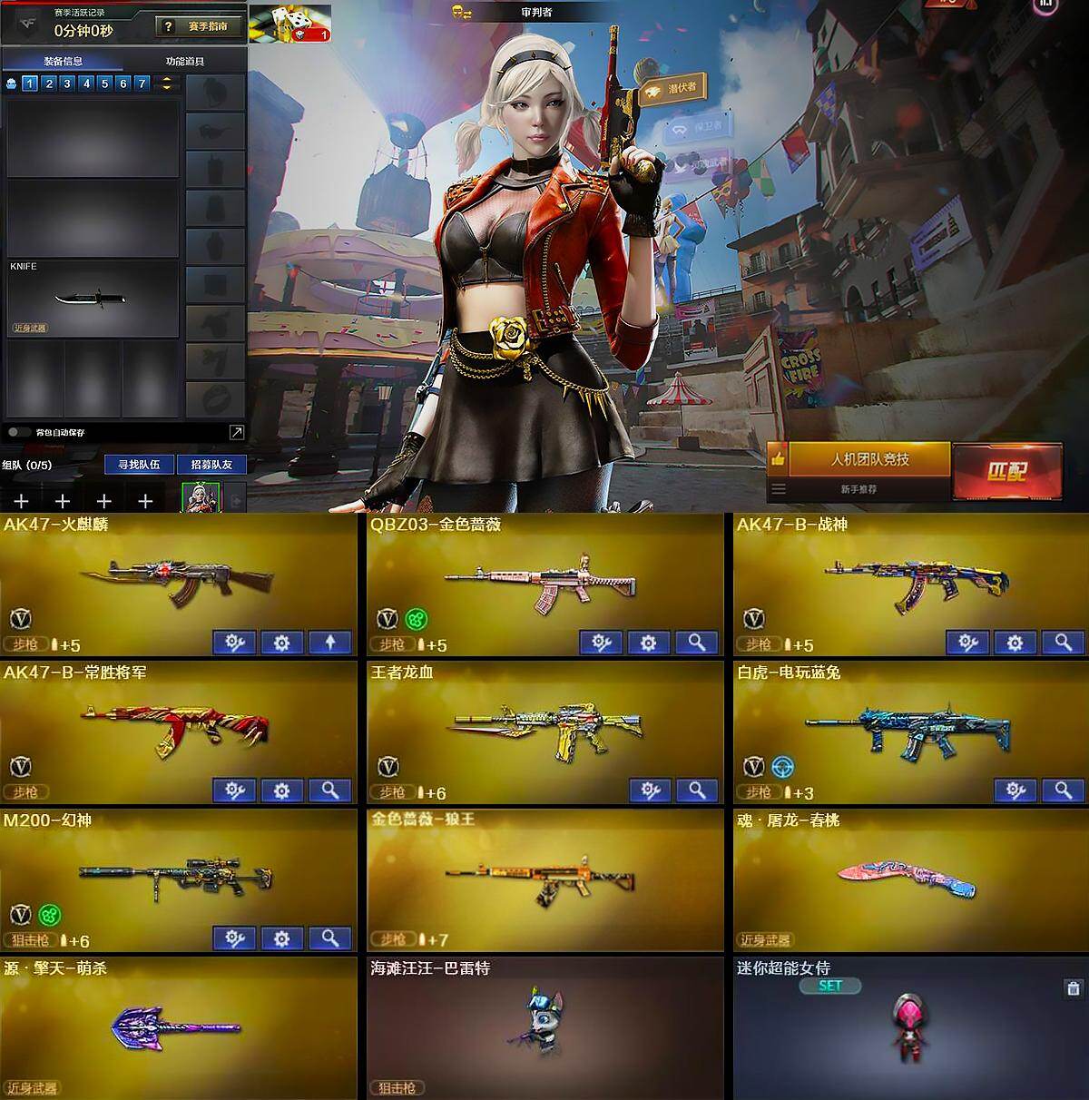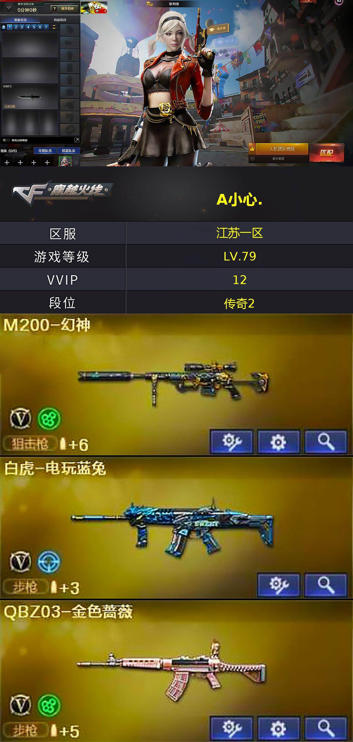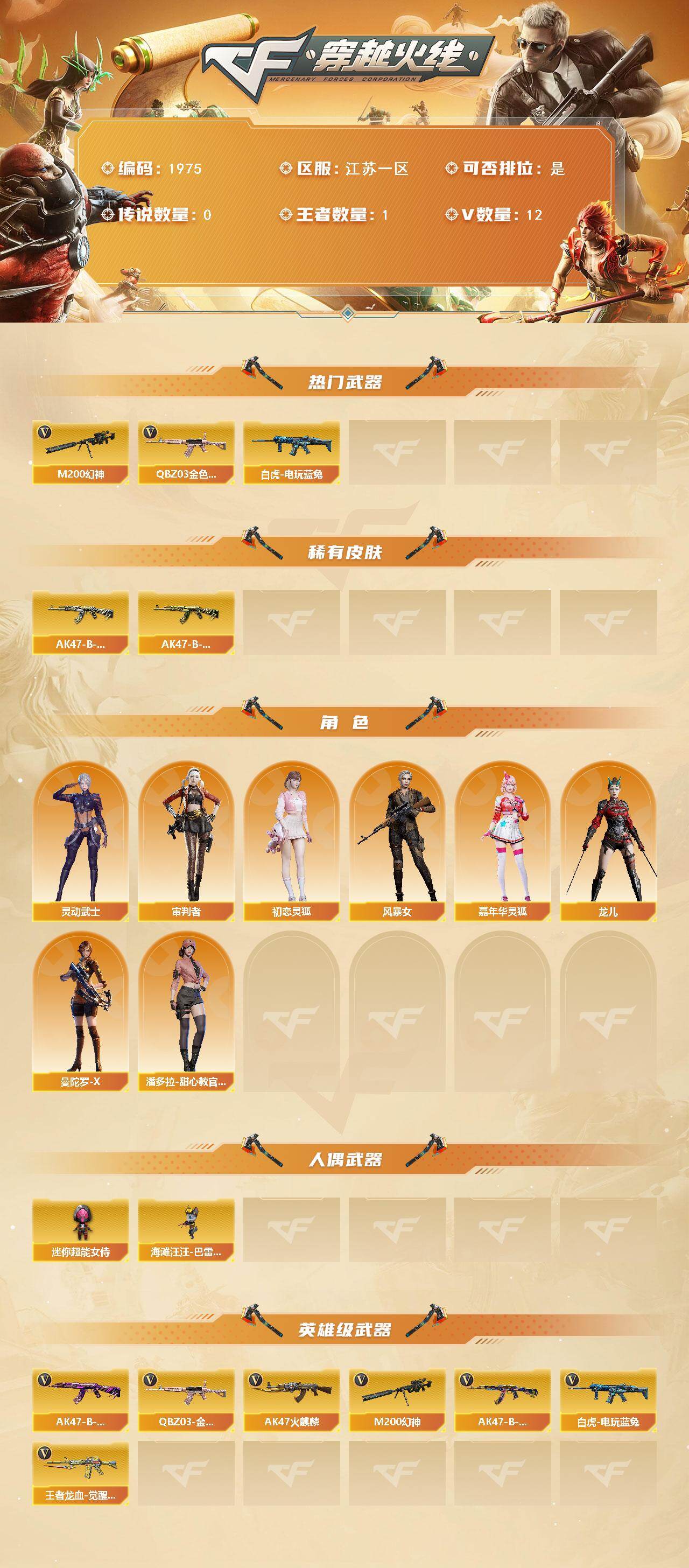 江苏一区-14v-1王者武器数-0炫金武器数 【热门武器】:q03-金色蔷薇,m200-幻神,白虎-电玩蓝兔 【皮肤】:ak47-b-常胜将军-刘备,ak47-b-常胜将军-孙权 【角色】:审判者,初恋灵狐,风暴女2,嘉年华灵狐,灵动武士,龙儿,曼陀罗-x,潘多拉-甜心教官 【人偶武器】:海滩汪汪-芭蕾特,迷你超能女侍 【英雄级武器】:ak47-火麒麟,q03-金色蔷薇,ak47-b