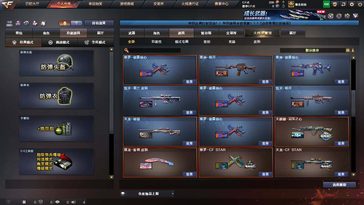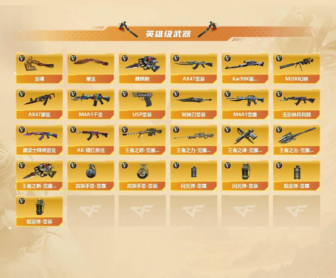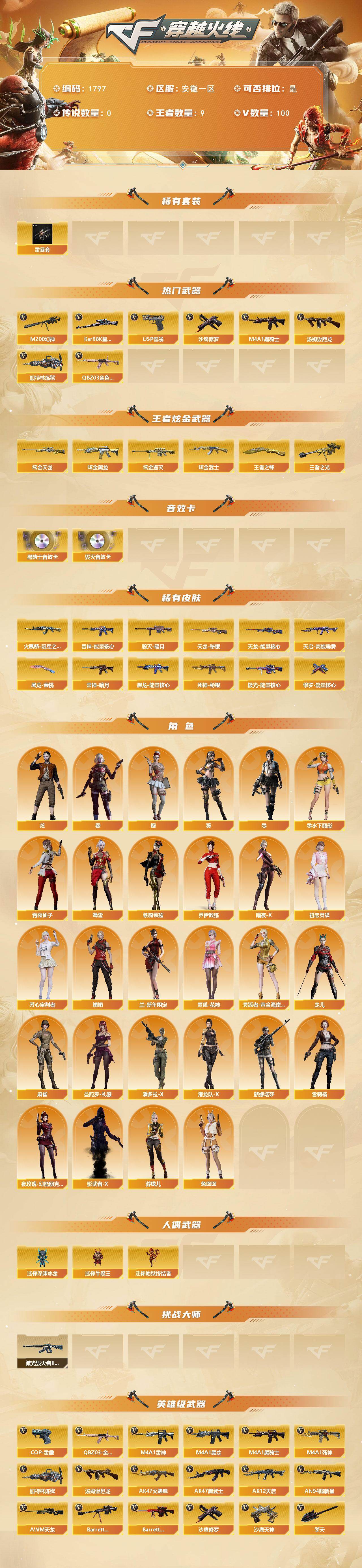 安徽一区-100v-9王者武器数-4炫金武器数 【热门武器】:q03-金色蔷薇,m200-幻神,kar98k-星神,m4a1-黑骑士,汤姆逊-烈龙,加特林-炼狱,usp-雷暴2,沙鹰-修罗7 【王者炫金武器】:王者之光,王者之锋2,炫金黑龙,炫金武士,炫金毁灭,炫金天龙 【音效卡】:m4a1-黑骑士音效卡,barrett-毁灭音效卡 【皮肤】:雷神-暗月,雷神-能量核心,火麒麟-冠军