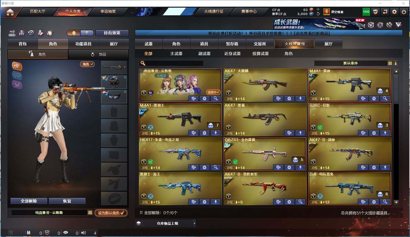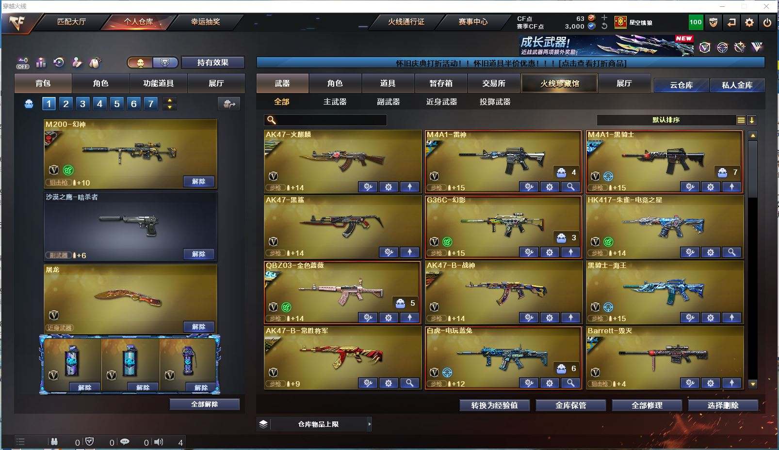 云南一区 vip1 51V 【M200幻神N9皮肤荣耀世冠白鲨皮肤usp雷暴4防云悠悠】【竞技荣光套装】【qbz03金色蔷薇荣耀世冠白鲨皮肤冠军之薇皮肤】【雷神荣耀之魄皮肤】【黑骑士黑骑士音效卡冠军之势皮肤】【毁灭荣耀之怒皮肤CFPLS15冠军皮肤】【G36C幻影】【火麒麟 黑鲨 朱雀电竞之星 战神 黑骑士海王 常胜将军 巴雷特暗月传说 炼狱 烈龙】——【usp雷暴 柯尔特竞技荣光 柯尔特冠军之特】——【屠龙 擎天竞技荣光 擎天云海游龙 麒麟刺百战金芒 屠龙电竞之星 屠龙斗烈龙驹 龙啸烈火龙威】——【竞技荣光投掷武器套装7】——【热门武器/小人枪】【火麒麟 裁决雪莉杨 炫金毁灭 黄金猫猫手套白鲨】——【角色】【4防(云悠悠 王者葵惊若翩鸿)】