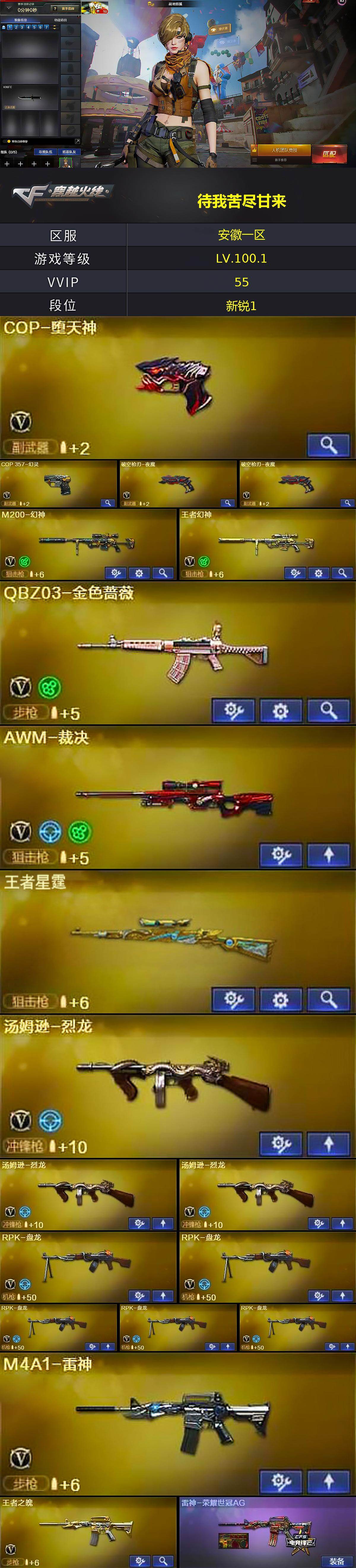 安徽一区-58v-9王者武器数-2炫金武器数 【热门武器】:q03-金色蔷薇,hk417-朱雀,m200-幻神,死亡之眼,王者炎心,牛牛-ak47,m4a1-黑骑士,汤姆逊-烈龙3,rpk-盘龙5,加特林-炼狱,cop-堕天神,cop 357-幻灵,沙鹰-修罗 【王者炫金武器】:王者炎心,王