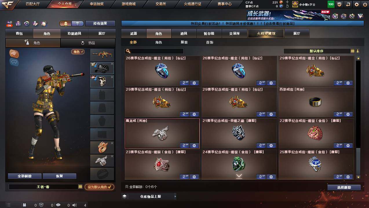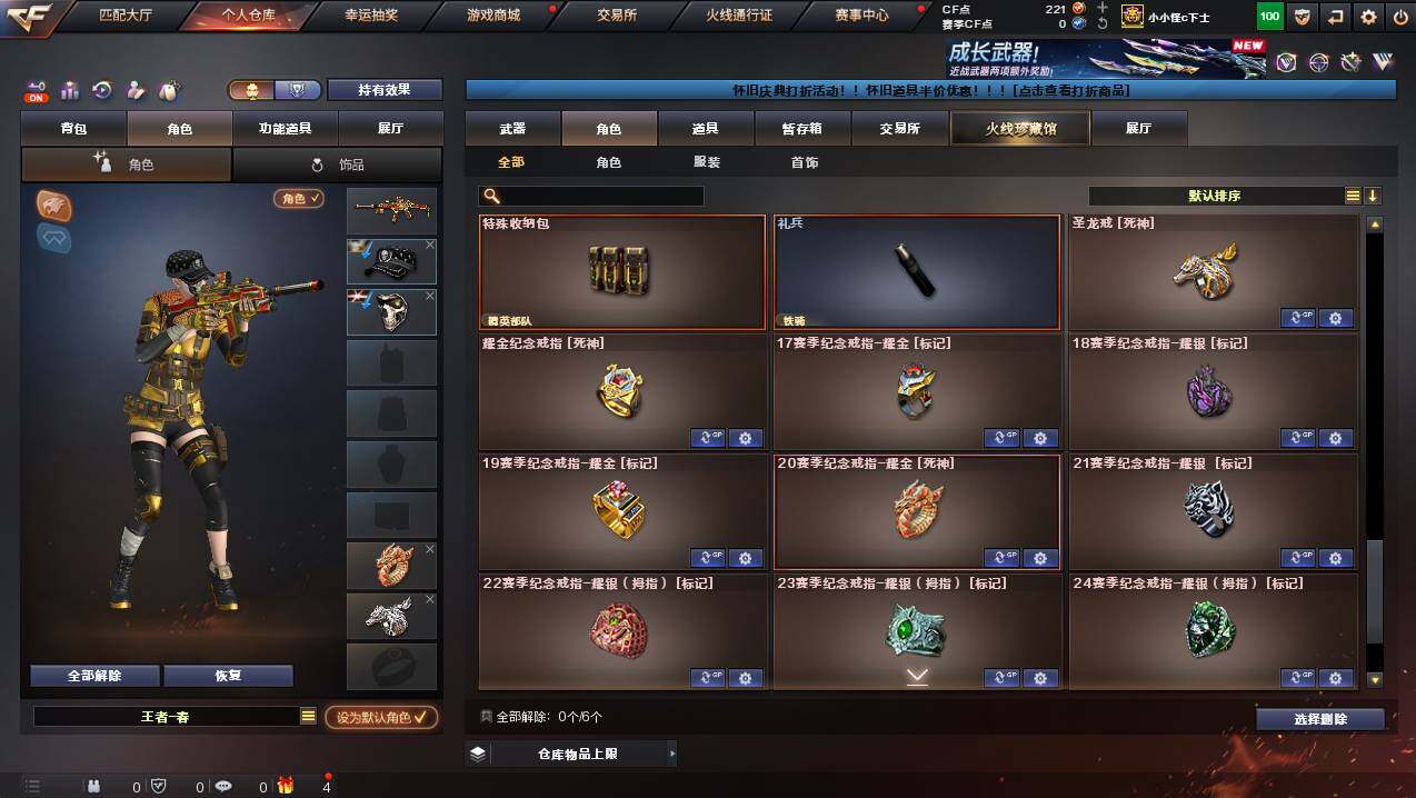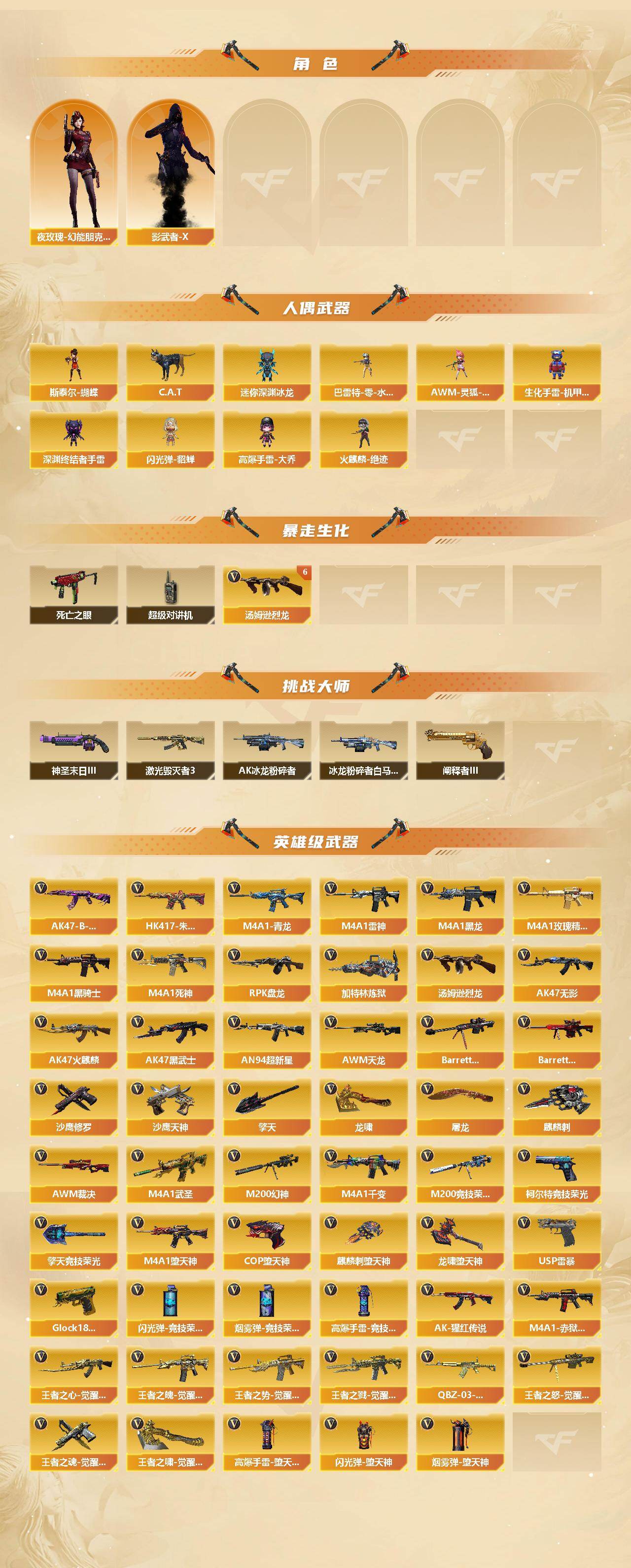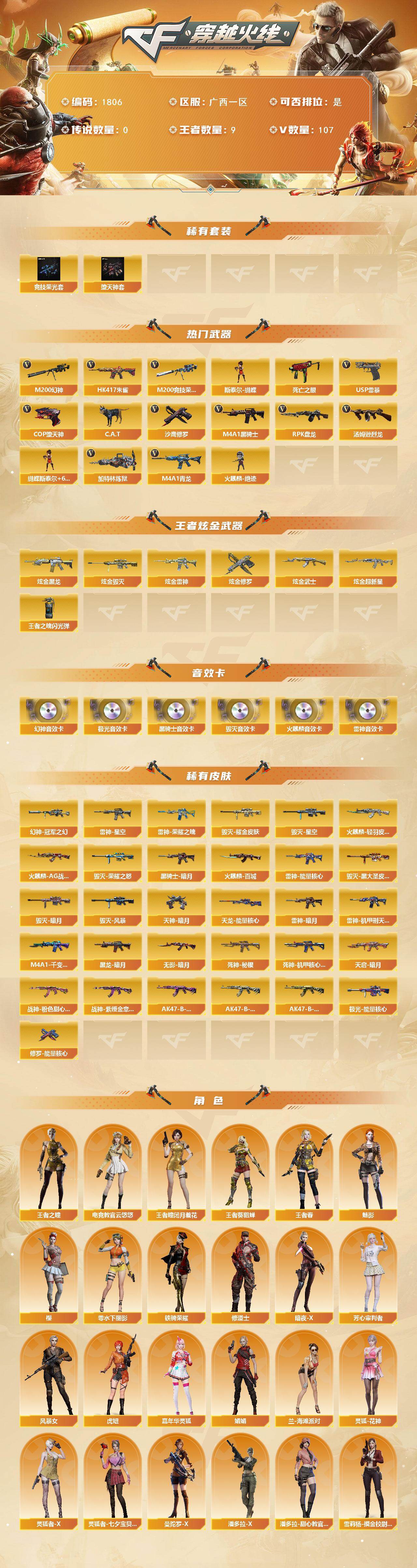 广西一区-107v-9王者武器数-7炫金武器数 【热门武器】:hk417-朱雀,m4a1-青龙,m200-幻神,m200-竞技荣光,死亡之眼,c.a.t,m4a1-黑骑士3,汤姆逊-烈龙7,rpk-盘龙,加特林-炼狱,斯泰尔-蝴蝶,火麒麟-绝迹,usp-雷暴,cop-堕天神,沙鹰-修罗6 【王者炫金武器】:炫金黑龙2,炫金雷神,炫金武士,炫金超新星,炫金毁灭,炫金修罗,王者之魄闪光丹
