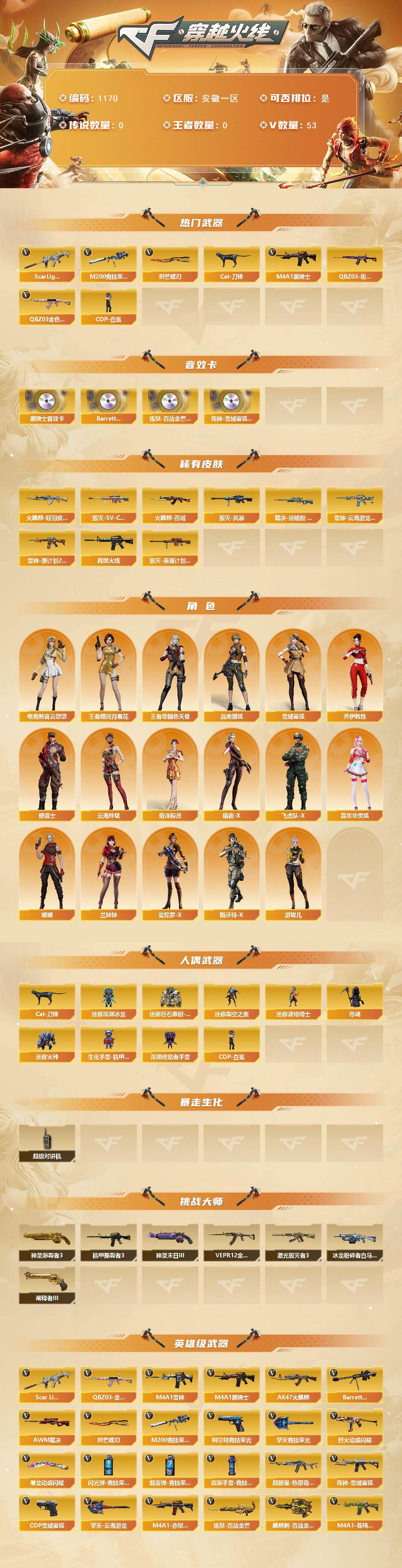 安徽一区-54v-0王者武器数-0炫金武器数 【热门武器】:q03-金色蔷薇,scar light-白虎,m200-竞技荣光,q03-街机,cat-刀锋,m4a1-黑骑士,cop-白鲨,炽芒蝶刃 【音效卡】:m4a1-黑骑士音效卡,barrett-碧霄极光音效卡,炼狱-百战金芒-庆典舞曲音效卡,死神-雪域霜狐-怀旧音效卡 【皮肤】:裁决-运输船 皮肤,雷神-云海游龙皮肤,雷神-源计划2