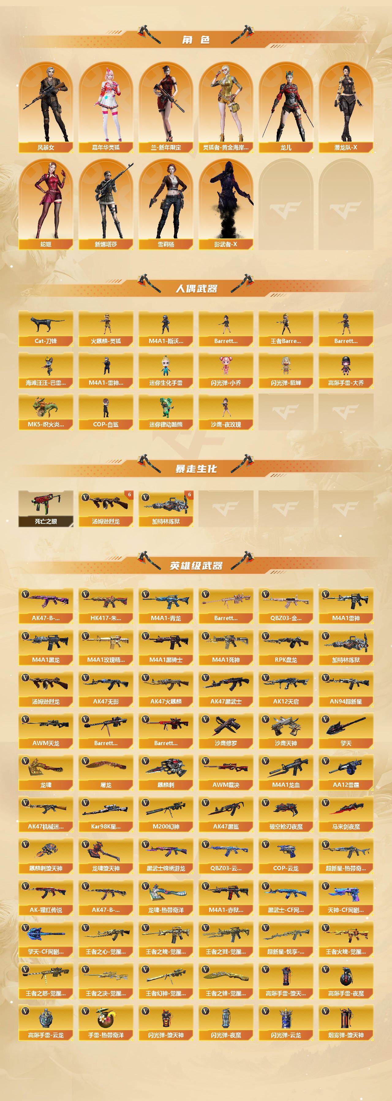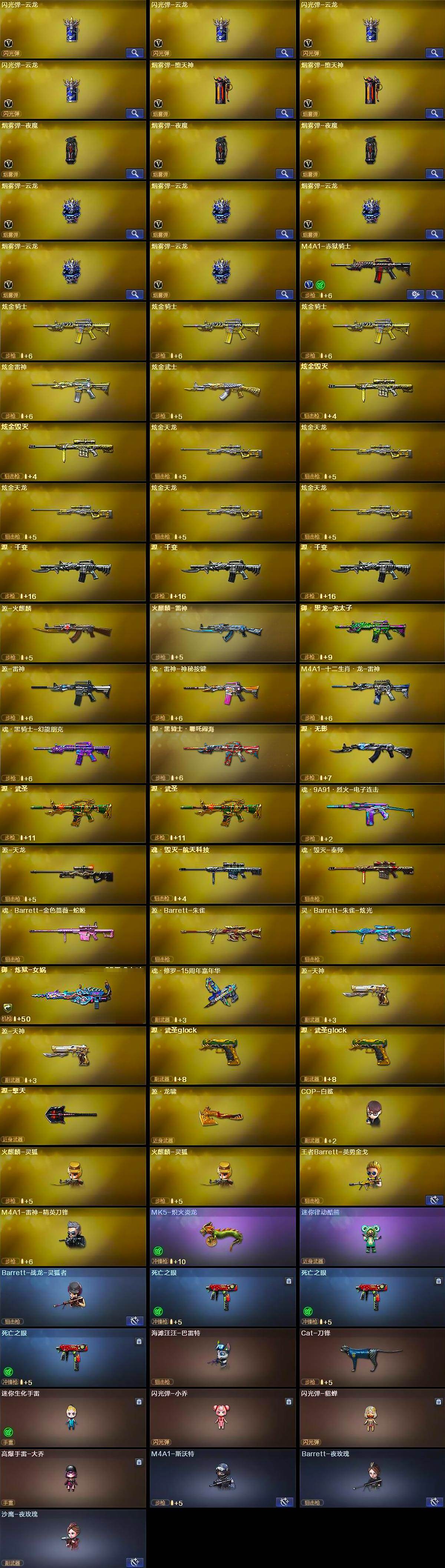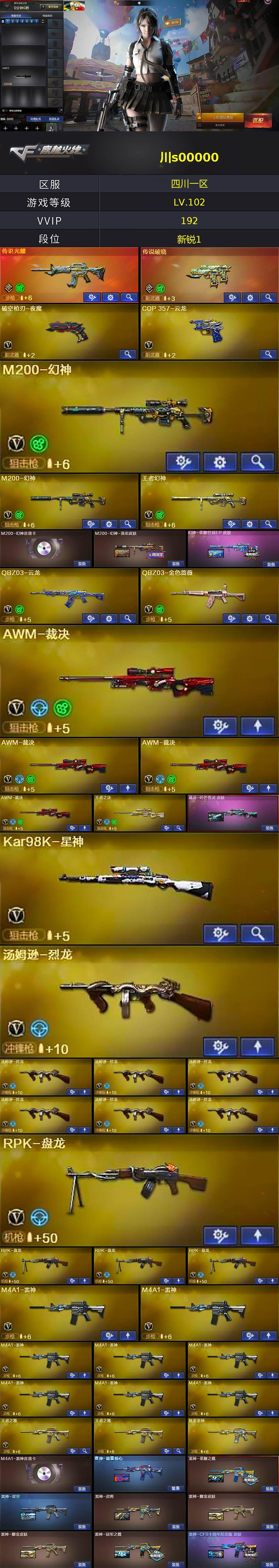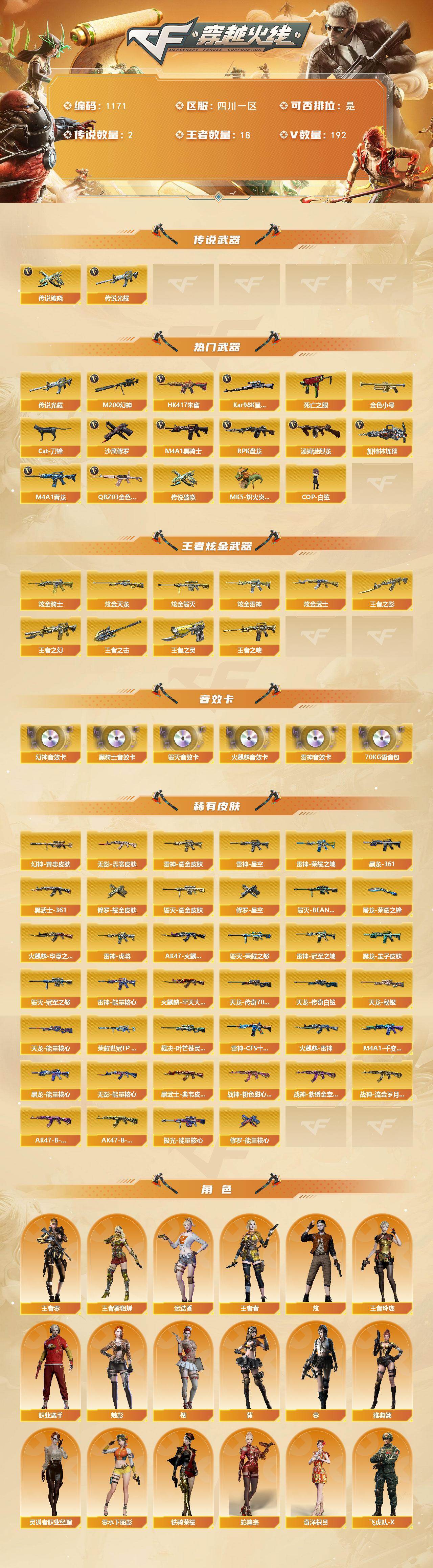 [16457182]四川一区-198v-18王者武器数-12炫金武器数 【传说武器】:传说光耀,传说破晓 【热门武器】:传说光耀,传说破晓,q03-金色蔷薇,hk417-朱雀,m4a1-青龙,m200-幻神2,死亡之眼3,kar98k-星神,金色小号,cat-刀锋,m4a1-黑骑士3,汤姆逊-烈龙7,rpk-盘龙4,加特林-炼狱6,mk5-炽火炎龙,cop-白鲨,沙鹰-修罗6 【王者炫金武器】:王者之幻3,王者之影2,王者之魄,王者之灵,王者之击,炫金骑士3,炫金雷神,炫金武士,炫金毁灭2,炫金天龙5 【音效卡】:m200-幻神音效卡,ak47-火麒麟音效卡,m4a1-雷神音效卡,m4a1-黑骑士音效卡2,barrett-毁灭音效卡,70kg语音包 【皮肤】:m200-幻神-黄忠皮肤,幻神-荣耀世冠ep 皮肤,裁决-叶芒苍灵 皮肤,雷神-能量核心,雷神-荣耀之魄,雷神-星空,雷神-虎将,雷神-耀金皮肤2,雷神-冠军之魄,雷神-cfs十周年纪念版 皮肤,火麒麟-雷神,火麒麟-华夏之心,ak47-火麒麟-传奇even,火麒麟-平天大圣,毁灭-荣耀之怒2,毁灭耀金皮肤5,毁灭-冠军之怒,毁灭-bean-2020mvp,m4a1-千变-孔明皮肤,黑龙-能量核心,m4a1-黑龙-361,黑龙-墨子皮肤,无影-能量核心,无影-霓裳皮肤,ak47-黑武士-361,黑武士-典韦皮肤,战神-粉色甜心皮肤9,战神-紫绶金章皮肤30,战神-流金岁月皮肤22,ak47-b-常胜将军-曹操,ak47-b-常胜将军-孙权3,天龙-秘银,天龙-能量核心,awm-天龙-传奇70kg,awm-天龙-传奇白鲨,极光-能量核心,修罗-能量核心,修罗耀金皮肤2,修罗-星空,屠龙-荣耀之锋 【角色】:零,葵,樱,魅影,炫,迷迭香,王者-葵-貂蝉,王者-零,王者春,王者玲珑,蛇隐宗,奇洋探员,飞虎队-x,风暴女,嘉年华灵狐,兰-新年限定,零-水下丽影,灵狐者-黄金海岸,灵狐者-职业经理,龙儿,潜龙队-x,蛇姬,铁骑荣耀,新娜塔莎,雪莉杨,影武者-x,职业选手,雅典娜 【人偶武器】:cop-白鲨,火麒麟-灵狐2,王者barrett-英勇金戈,m4a1-雷神-精英刀锋,mk5-炽火炎龙,迷你律动酷熊,barrett-战龙-灵狐者,海滩汪汪-芭蕾特,cat-刀锋,迷你生化手蕾,闪光丹-