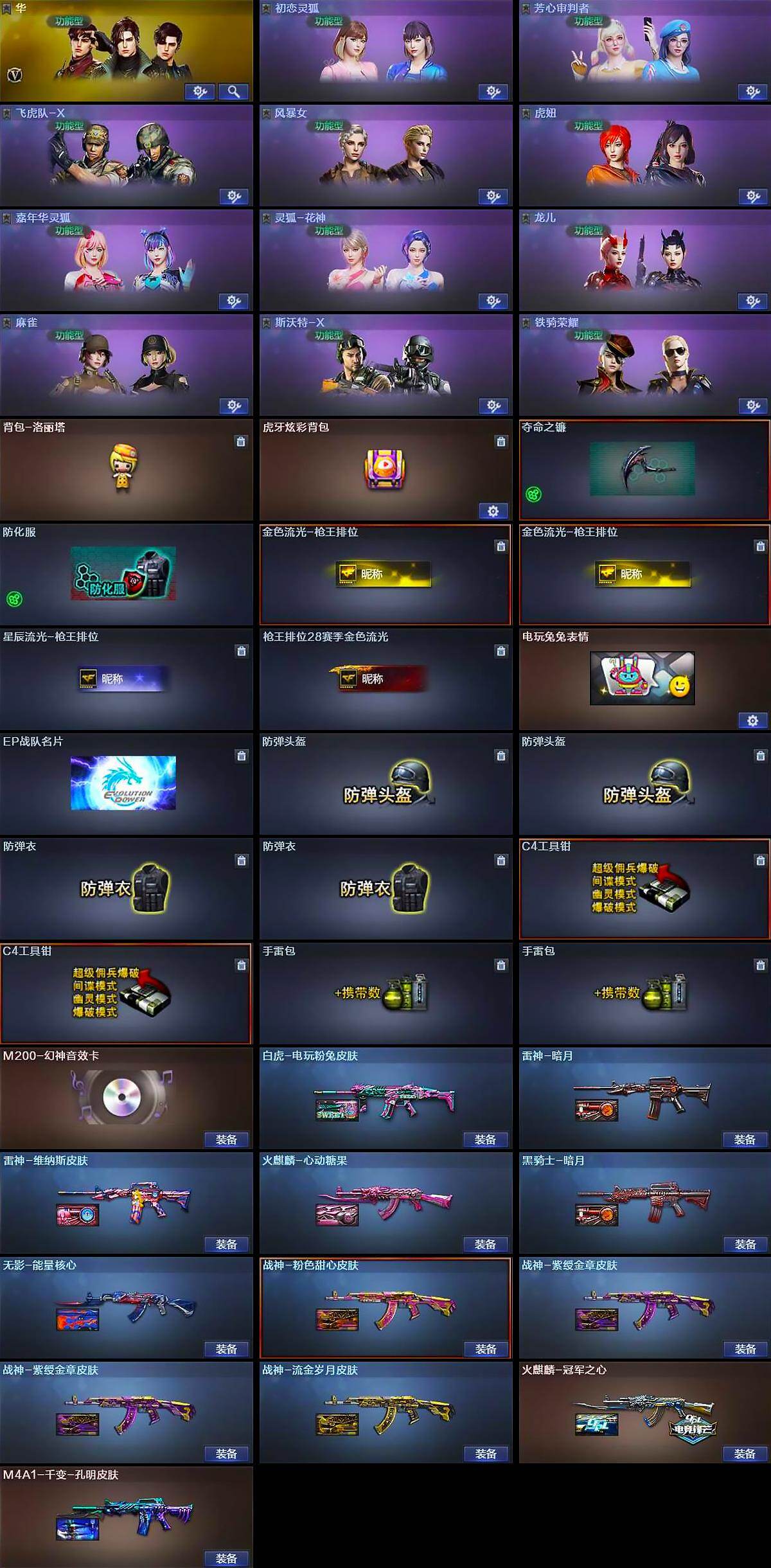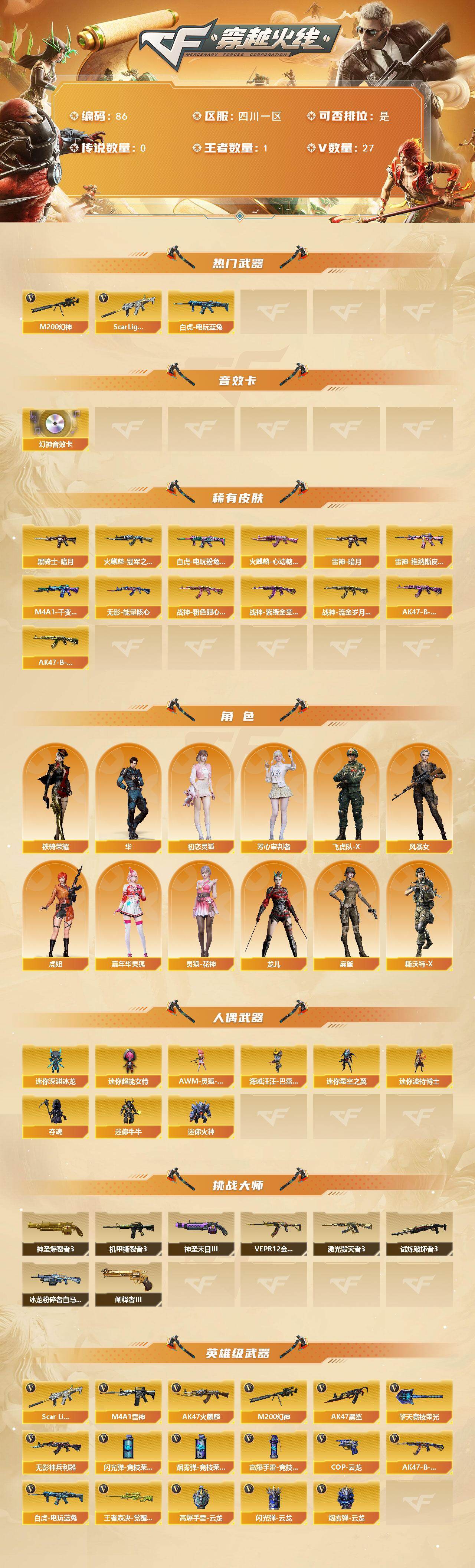 四川一区-28v-1王者武器数-0炫金武器数 【热门武器】:scar light-白虎,m200-幻神,白虎-电玩蓝兔 【音效卡】:m200-幻神音效卡 【皮肤】:白虎-电玩粉兔皮肤,雷神-暗月,雷神-维纳斯皮肤,火麒麟-冠军之心,火麒麟-心动糖果,m4a1-千变-孔明皮肤,黑骑士-暗月,无影-能量
