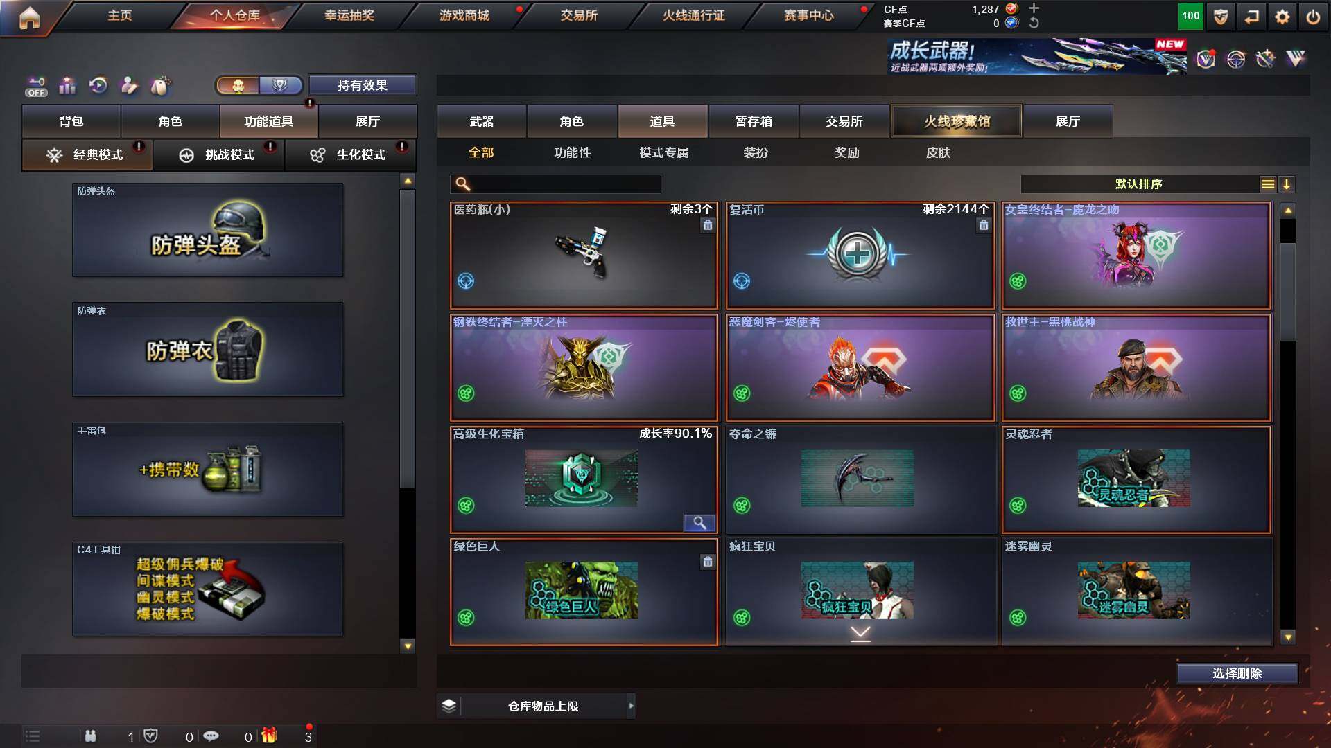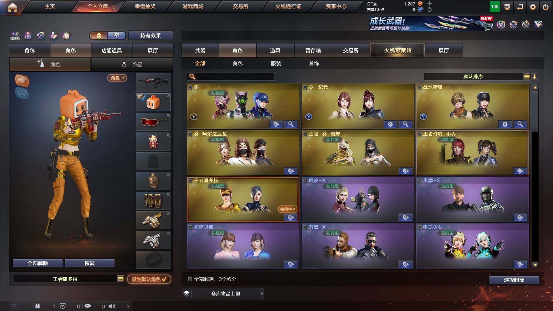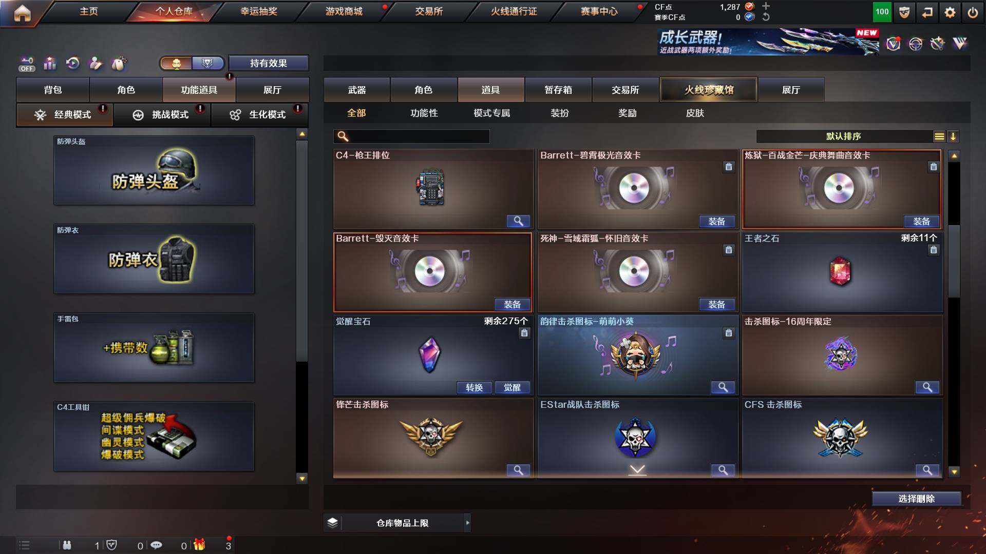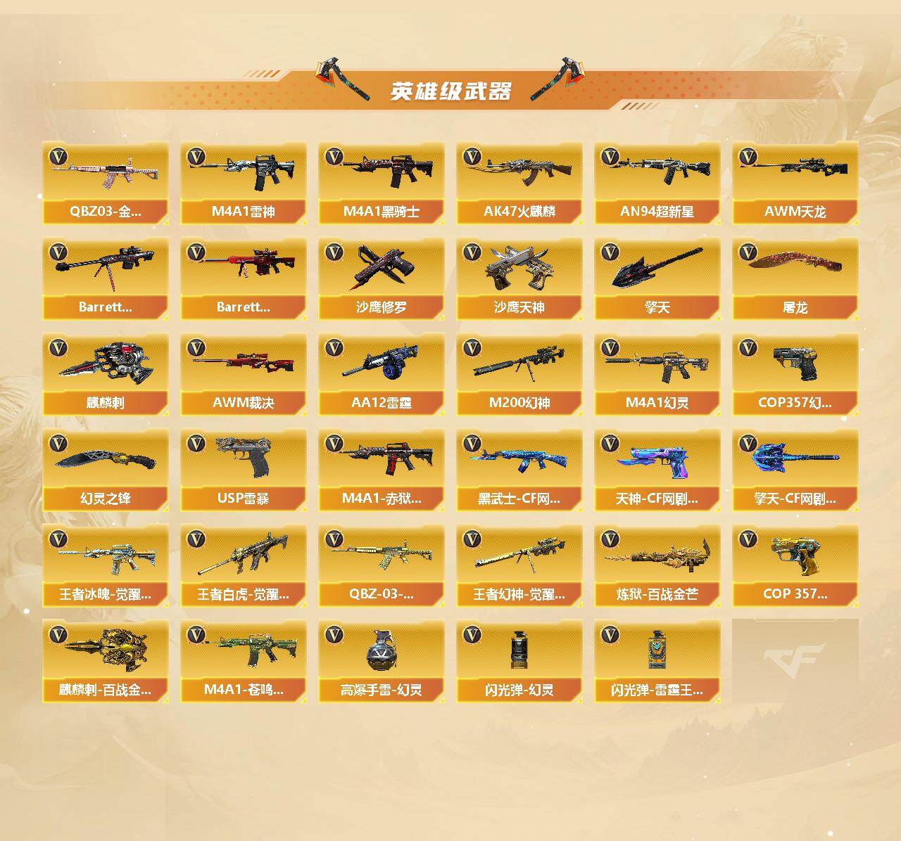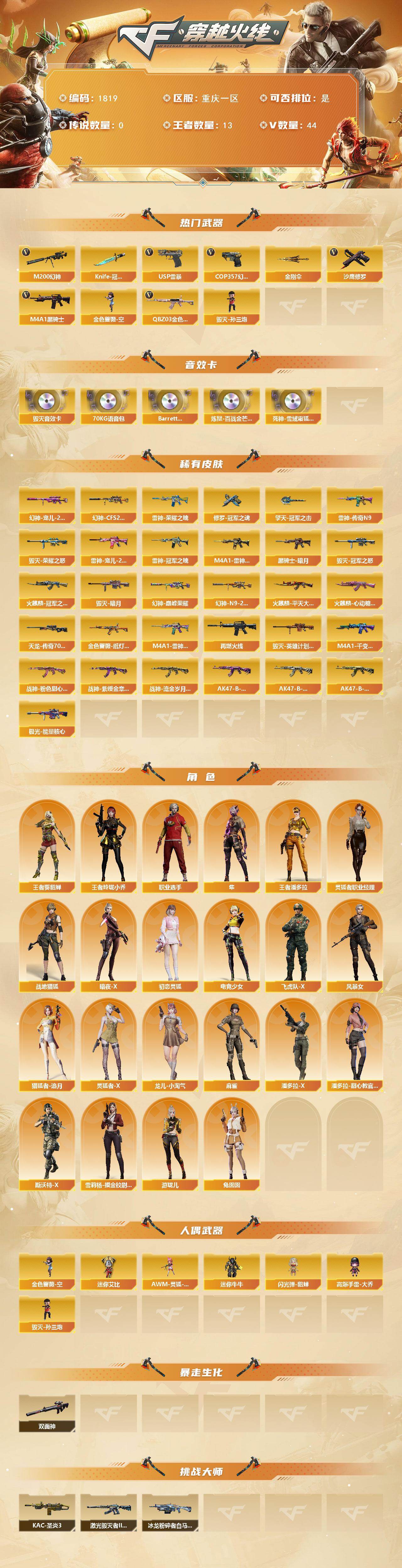 重庆一区-44v-13王者武器数-0炫金武器数 【热门武器】:q03-金色蔷薇,m200-幻神,m4a1-黑骑士,金色蔷薇-空,毁灭-孙三炮,usp-雷暴,cop 357-幻灵,沙鹰-修罗2,knife-冠军之刃,金刚伞 【音效卡】:barrett-毁灭音效卡,70kg语音包,barrett-碧霄极光音效卡,炼狱-百战金芒-庆典舞曲音效卡,死神-雪域霜狐-怀旧音效卡 【皮肤】:幻神-宠儿