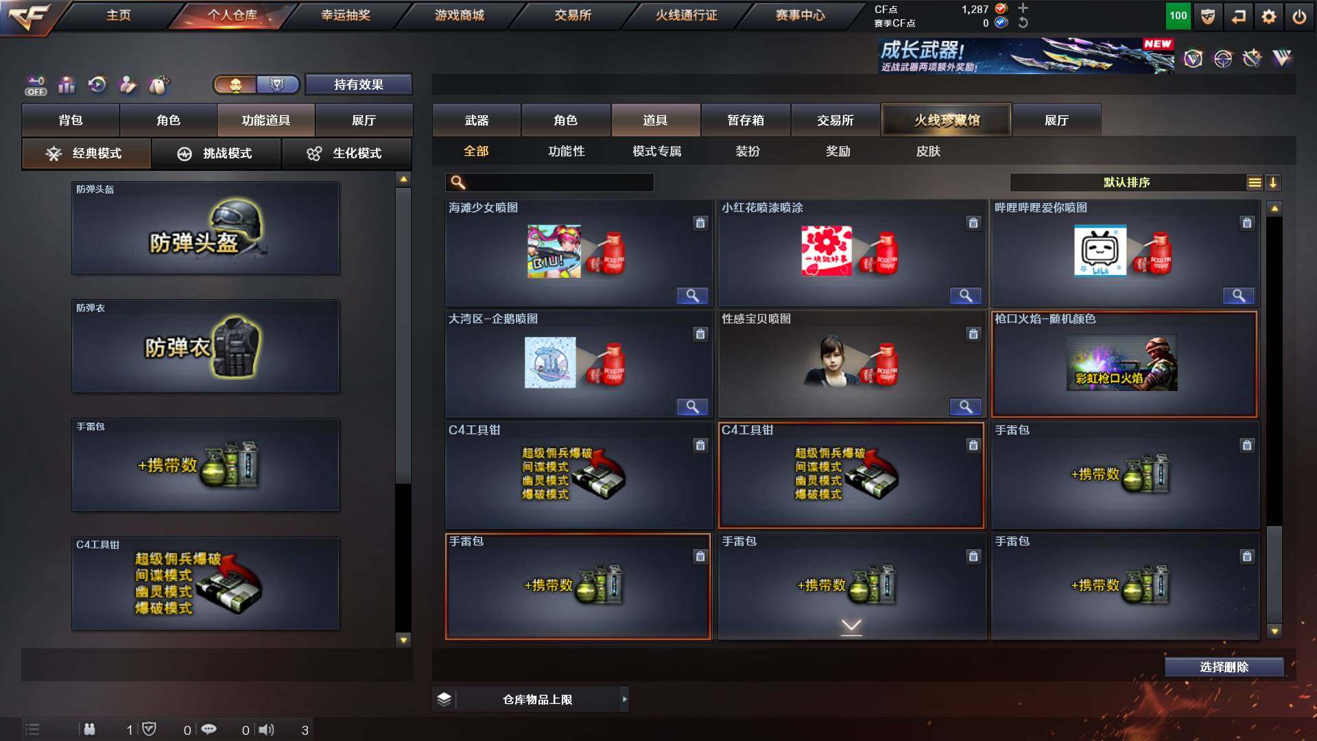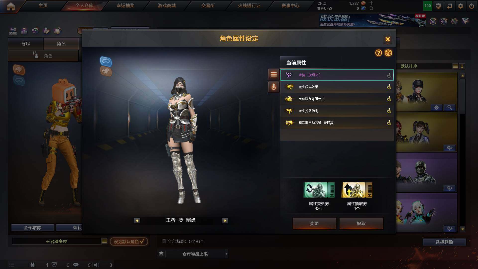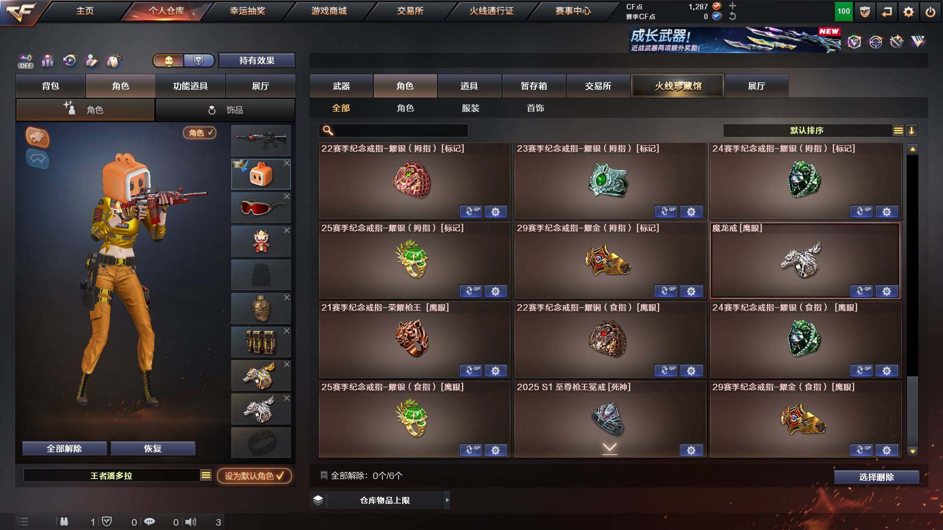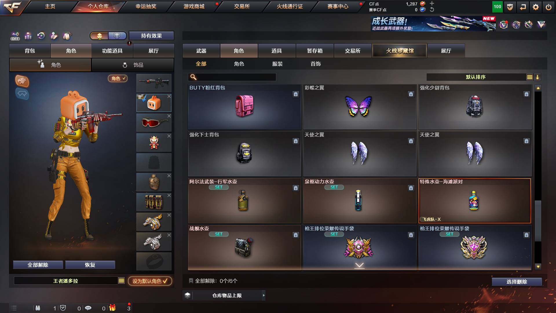 重庆一区-44v-13王者武器数-0炫金武器数 【热门武器】:q03-金色蔷薇,m200-幻神,m4a1-黑骑士,金色蔷薇-空,毁灭-孙三炮,usp-雷暴,cop 357-幻灵,沙鹰-修罗2,knife-冠军之刃,金刚伞 【音效卡】:barrett-毁灭音效卡,70kg语音包,barrett-碧霄极光音效卡,炼狱-百战金芒-庆典舞曲音效卡,死神-雪域霜狐-怀旧音效卡 【皮肤】:幻神-宠儿