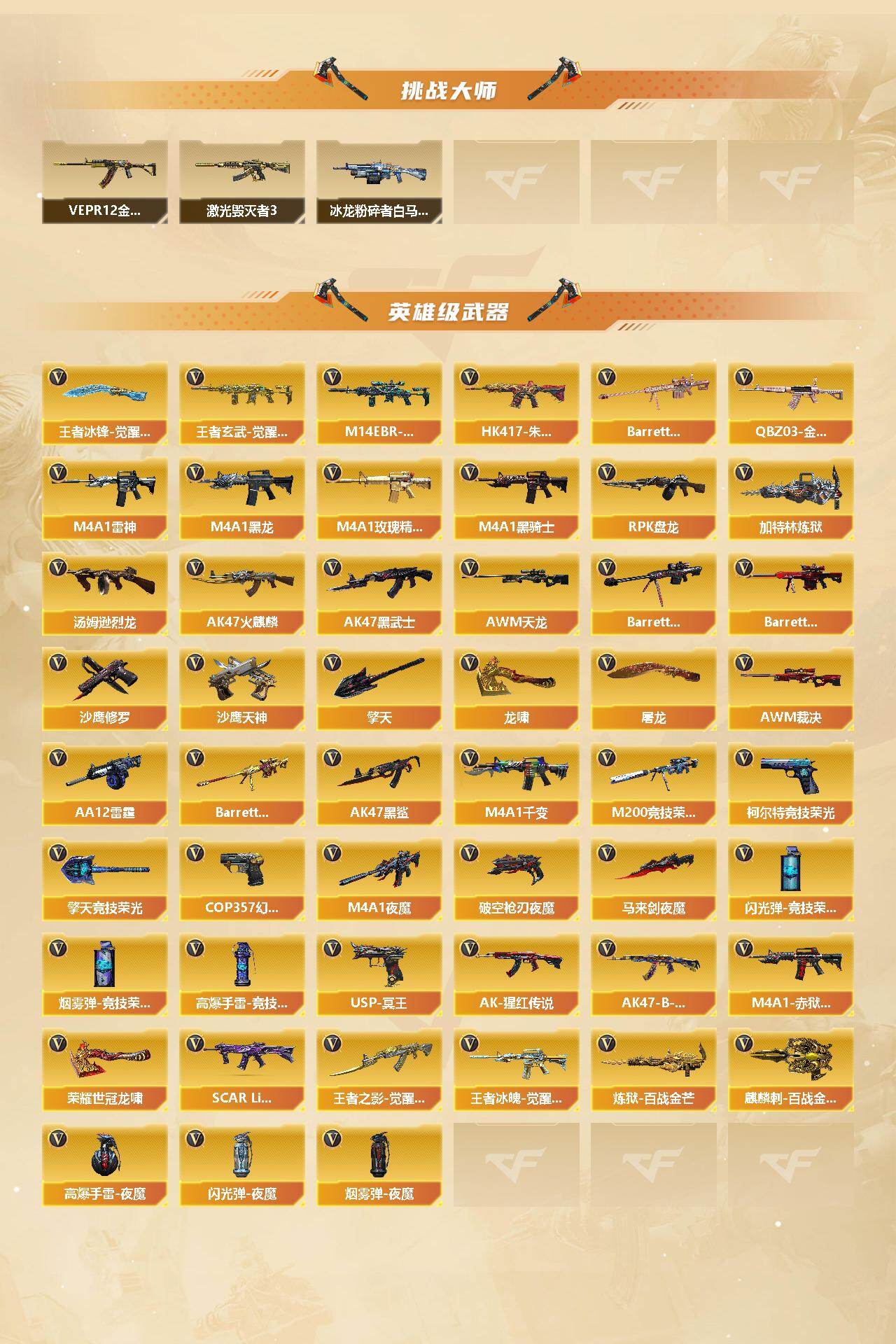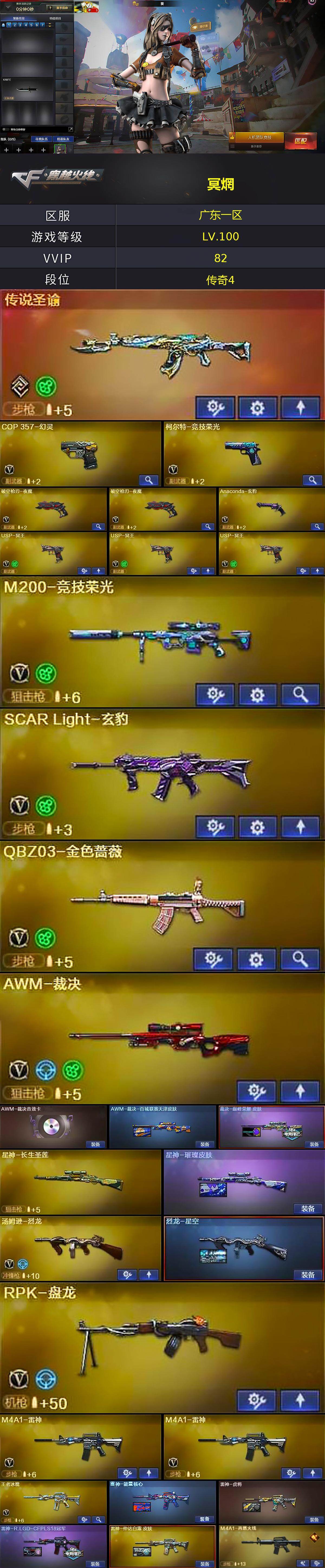 广东一区-85v-5王者武器数-2炫金武器数 【传说武器】:传说圣谕 【热门武器】:传说圣谕,q03-金色蔷薇,m14ebr-玄武,hk417-朱雀,m200-竞技荣光,死亡之眼,m4a1-黑骑士,汤姆逊-烈龙,rpk-盘龙,加特林-炼狱,cop 357-幻灵,沙鹰-修罗,荣耀世冠-龙啸 【王者