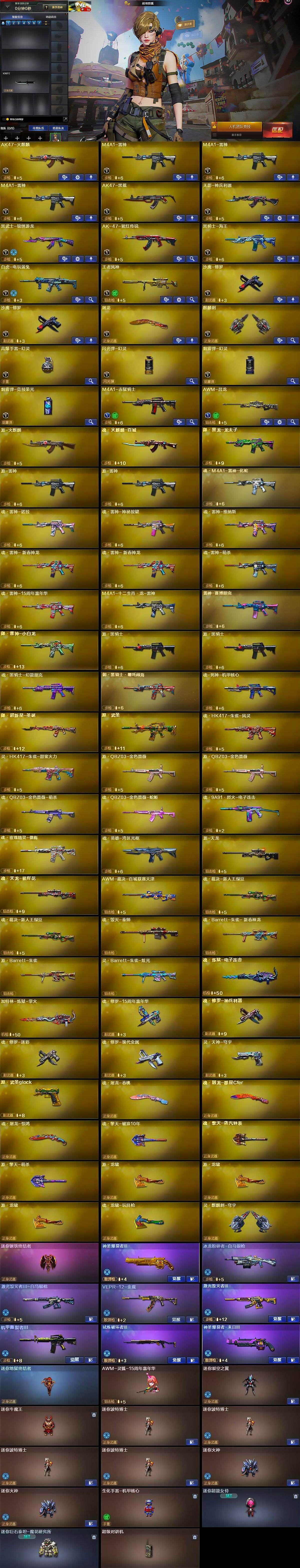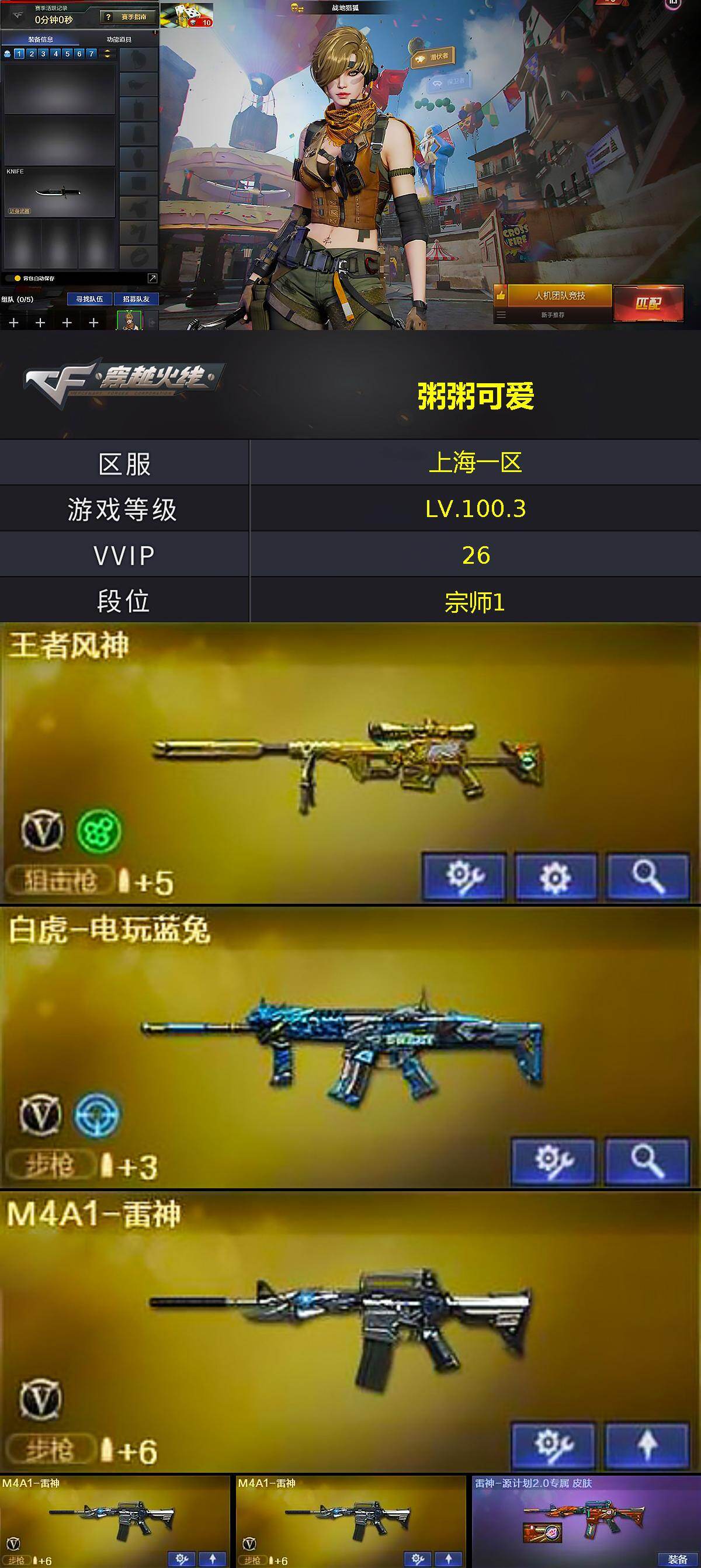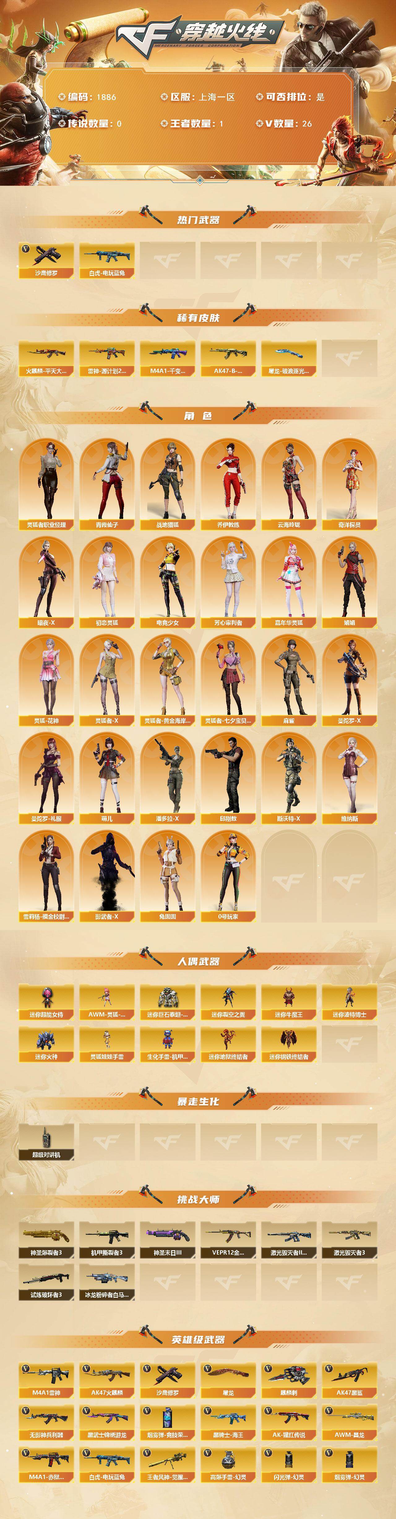 上海一区-27v-1王者武器数-0炫金武器数 【热门武器】:白虎-电玩蓝兔,沙鹰-修罗2 【皮肤】:雷神-源计划2.0专属 皮肤,火麒麟-平天大圣,m4a1-千变-孔明皮肤,ak47-b-常胜将军-孙权2,屠龙-破浪逐光 皮肤 【角色】:战地猎狐,奇洋探员,乔伊教练,云海玲珑,暗夜-x,初恋灵狐,电竞少女,芳心审判者,嘉年华灵狐,娟娟,0号玩家,灵狐-花神,灵狐者-x,灵狐者-黄金海岸,灵狐者-七夕宝贝,灵狐者-职业经理,麻雀,曼陀罗-x,曼陀罗-礼服,萌儿,潘多拉-x,邱刚敖,青霞仙子,斯沃特-x,兔囡囡,维纳斯,雪莉杨-摸金校尉,影武者-x 【人偶武器】:迷你钢铁终结者,迷你地狱终结者,awm-灵狐-15周年嘉年华,迷你裂空之翼,迷你牛魔王,迷你波特博士4,迷你火种2,生化手蕾-机甲核心,迷你超能女侍,迷你巨石泰坦-魔花研究所,灵狐娃娃手蕾2 【暴走生化】:超级对讲机 【挑战大师】:神圣爆裂者iii,冰龙粉碎者-白马银呛,激光毁灭者iii-白马银呛,vepr-12-金魔,激光毁灭者iii,机甲撕裂者iii,试炼破坏者iii,神圣爆裂者-末日iii 【英雄级武器】:ak47-火麒麟,m4a1-雷神3,ak47-黑鲨,无影-神兵利器,黑武士-锦绣游龙,ak-47-猩红传说,黑骑士-海王,白虎-电玩蓝兔,王者风神-觉醒版,沙鹰-修罗2,屠龙,麒麟刺,高爆手蕾-幻灵,闪光丹-幻灵,盐雾蛋-幻灵,盐雾蛋-竞技荣光,m4a1-赤狱骑士,awm-昌龙 【道具】:bs战队炫彩背包,cfs限定背包,亚洲杯纪念炫彩背包,全能呛王背包,冰冰企鹅背包,奇洋探员-海龟背包,女皇终结者-背包,炫彩背包-诺拉,老虎背包,背包-洛丽塔,虎牙炫彩背包,超级背包,哔哩哔哩名片,女皇终结者-魔龙之吻,救世主-黑桃战神,黄金生化钩,绿色巨人,灵魂忍者3,变异宝贝,妖姬,迷雾幽灵2,生化弹匣,夺命之镰,防化服3,金色流光-呛王排位2,星辰流光-呛王排位,呛王排位28赛季金色流光,电玩兔兔表情2,热带奇洋表情,动感闪耀表情,云海游龙表情,ep战队名片,ep战队喷图,ep战队击杀图标,防弹头盔6,防弹衣6,c4工具钳6,手蕾包6 【特殊呛械】: