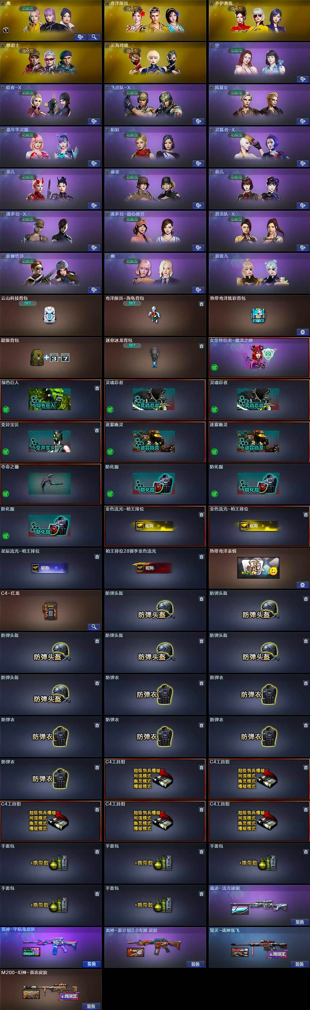 [16474397]河北一区-39v-2王者武器数-0炫金武器数 【热门武器】:q03-金色蔷薇,m200-幻神2,c.a.t,牛牛-ak47,m4a1-黑骑士,汤姆逊-烈龙,加特林-炼狱 【皮肤】:m200-幻神-黄忠皮肤,裁决-流光秘银,雷神-宇航兔皮肤,雷神-源计划2.0专属 皮肤,毁灭-战神张飞,毁灭-英雄计划 皮肤 【角色】:鹰,奇洋探员,乔伊教练,修道士,云海玲珑,空,暗夜-x,飞虎队-x,风暴女,嘉年华灵狐,娟娟,灵狐者-x,龙儿,麻雀,萌儿,潘多拉-x,潘多拉-甜心教官,潜龙队-x,新娜塔莎,幽,游珑儿 【人偶武器】:awm-灵狐-15周年嘉年华,c.a.t,牛牛-ak47,迷你深渊冰龙,夺魂,迷你牛牛,生化手蕾-机甲核心2,q03-斯沃特 【挑战大师】:神圣爆裂者-末日iii 【英雄级武器】:ak47-火麒麟,m4a1-黑龙,m4a1-雷神,m4a1-黑骑士,an94-超新星,m4a1-龙血,黑武士-锦绣游龙,超新星-热带奇洋,q03-金色蔷薇,barrett-毁灭,m200-幻神2,加特林-炼狱,炼狱-悦蓝-觉醒版,汤姆逊-烈龙,aa-12-雷霆,沙鹰-天神,王者之灵-觉醒版,麒麟刺,龙啸-热带奇洋,斩神刀-雷暴,高爆手蕾-雷霆,高爆手蕾-雷暴,高爆手蕾-云龙,手蕾-热带奇洋,闪光丹-雷霆,闪光丹-雷暴2,闪光丹-云龙2,盐雾蛋-雷霆,盐雾蛋-雷暴,盐雾蛋-云龙,m4a1-赤狱骑士 【道具】:云山科技背包,奇洋探员-海龟背包,热带奇洋炫彩背包,超级背包,迷你冰龙背包,女皇终结者-魔龙之吻,绿色巨人,灵魂忍者2,变异宝贝,迷雾幽灵2,夺命之镰,防化服3,金色流光-呛王排位2,星辰流光-呛王排位,呛王排位28赛季金色流光,热带奇洋表情,c4-红龙,防弹头盔6,防弹衣6,c4工具钳5,手蕾包5 【特殊呛械】:1黑骑士,1烈龙,1炼狱