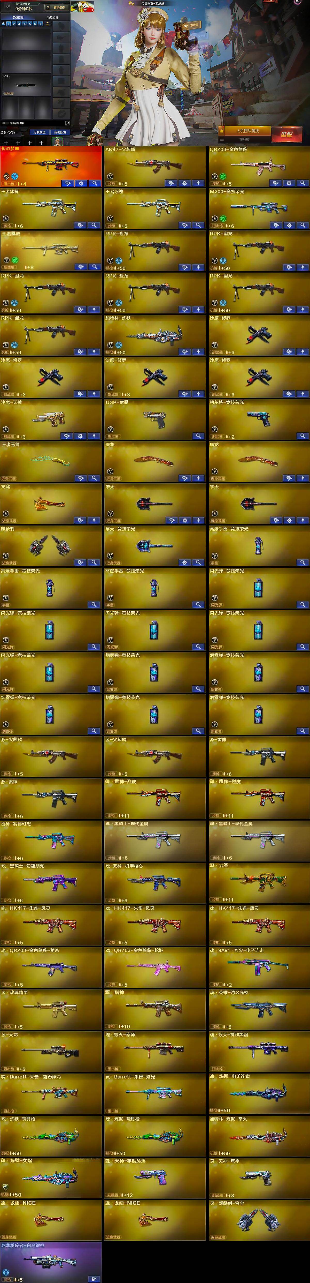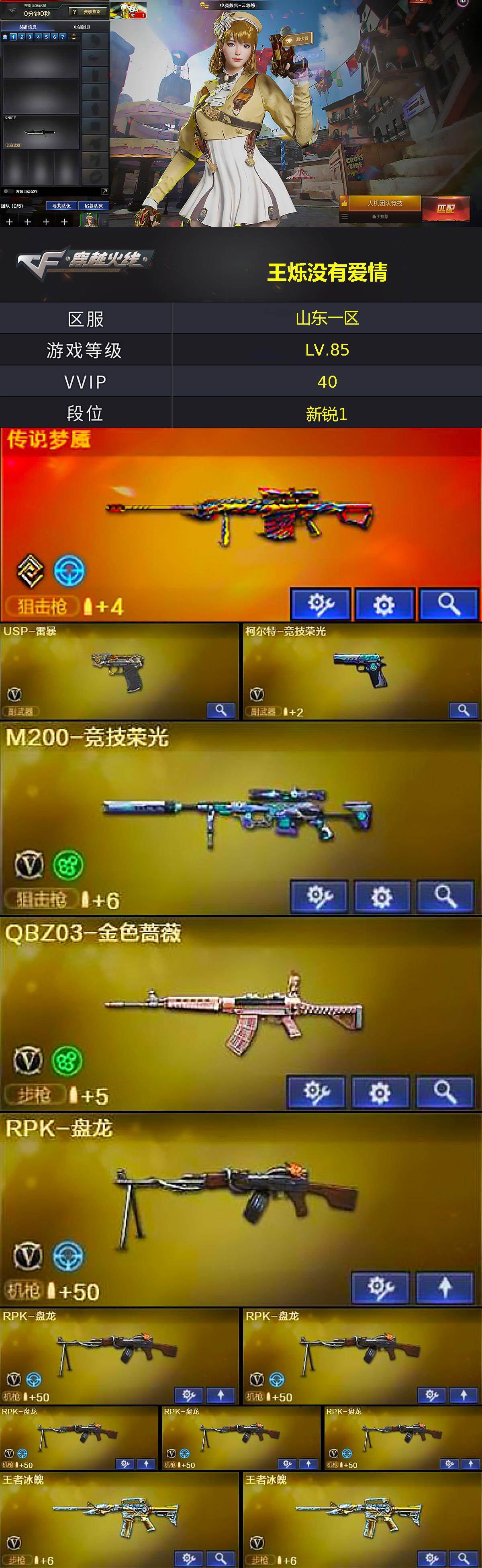 山东一区-43v-4王者武器数-0炫金武器数 【传说武器】:传说梦魇 【热门武器】:传说梦魇,q03-金色蔷薇,m200-竞技荣光,rpk-盘龙6,加特林-炼狱,usp-雷暴,沙鹰-修罗4 【王者炫金武器】:王者玉锋 【角色】:电竞教官-云悠悠,初恋灵狐 【挑战大师】:冰龙粉碎者-白马银呛