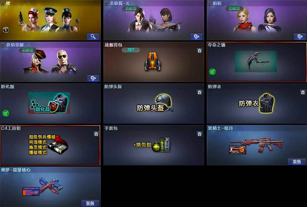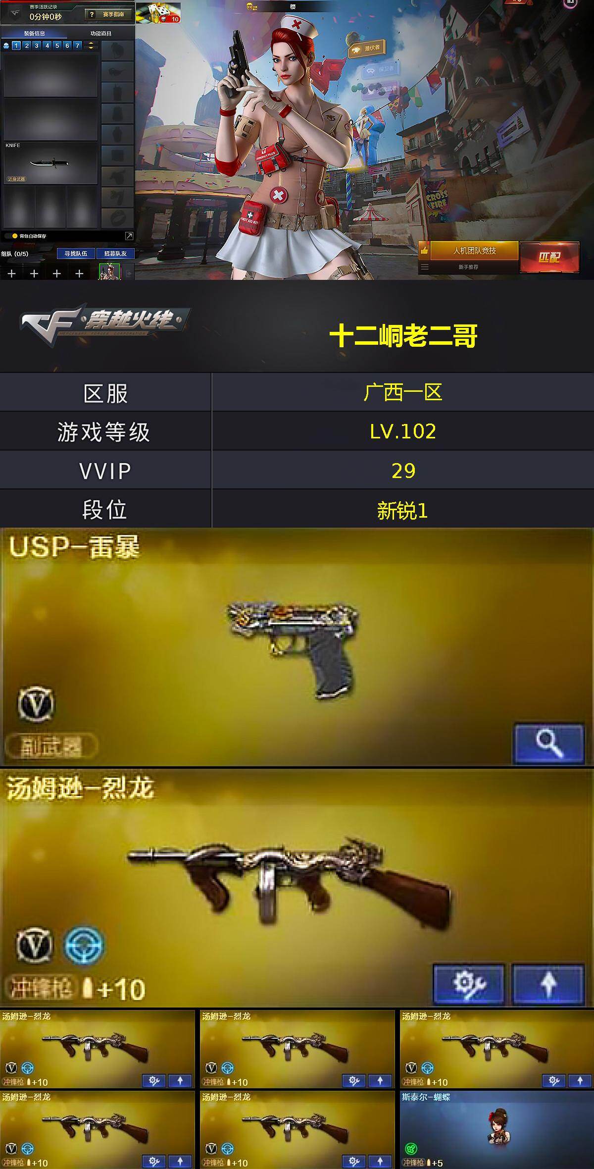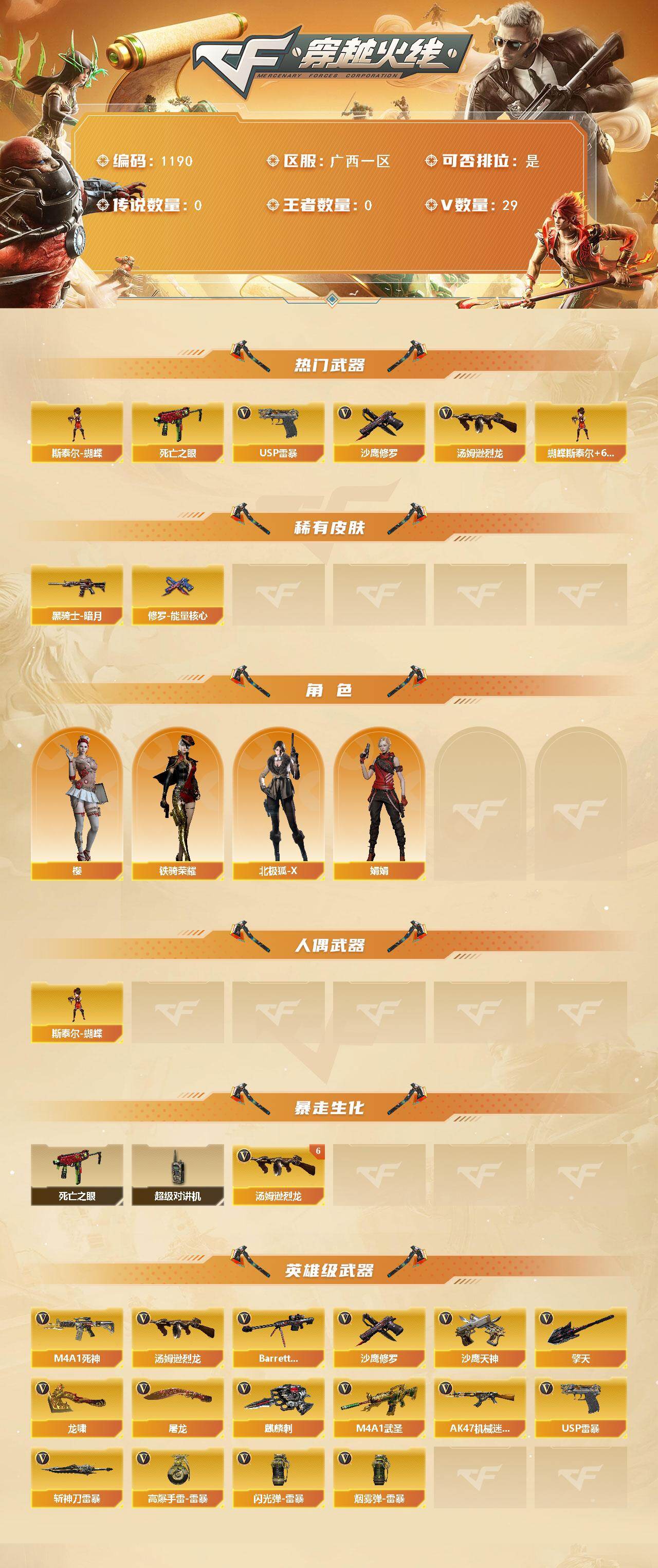 广西一区-29v-0王者武器数-0炫金武器数 【热门武器】:死亡之眼,汤姆逊-烈龙6,斯泰尔-蝴蝶,usp-雷暴,沙鹰-修罗 【皮肤】:黑骑士-暗月,修罗-能量核心 【角色】:樱,北极狐-x,娟娟,铁骑荣耀 【人偶武器】:斯泰尔-蝴蝶 【暴走生化】:死亡之眼,超级对讲机 【英雄级武器】:m4a1-