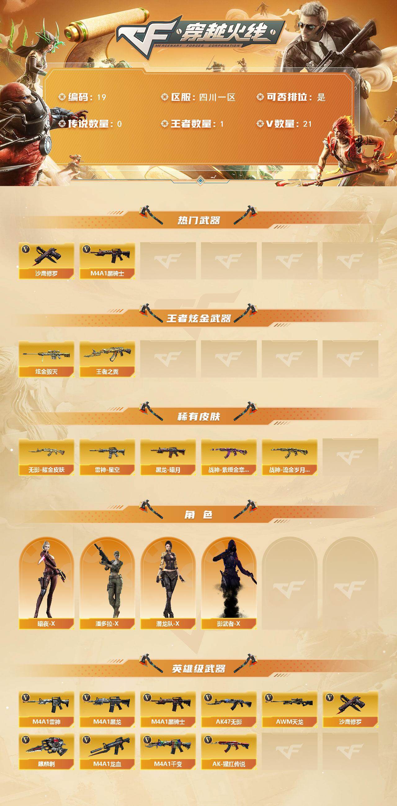 【21v 王者之翼 炫金毁灭】【等级】101【区服】四川一区【英雄角色】0【英雄武器】21【王者级武器】王者之翼【炫金级武器】炫金毁灭【英雄级武器】awm-天龙 9a91-烈火 m4a1-千变 ak47-无影 m4a1-黑龙 9a91-烈火 m4a1-龙血 m4a1-雷神 m4a1-黑骑士 m4a1-雷神 m4a1-黑龙 9a91-烈火 9a91-烈火 m4a1-黑龙 ak-4