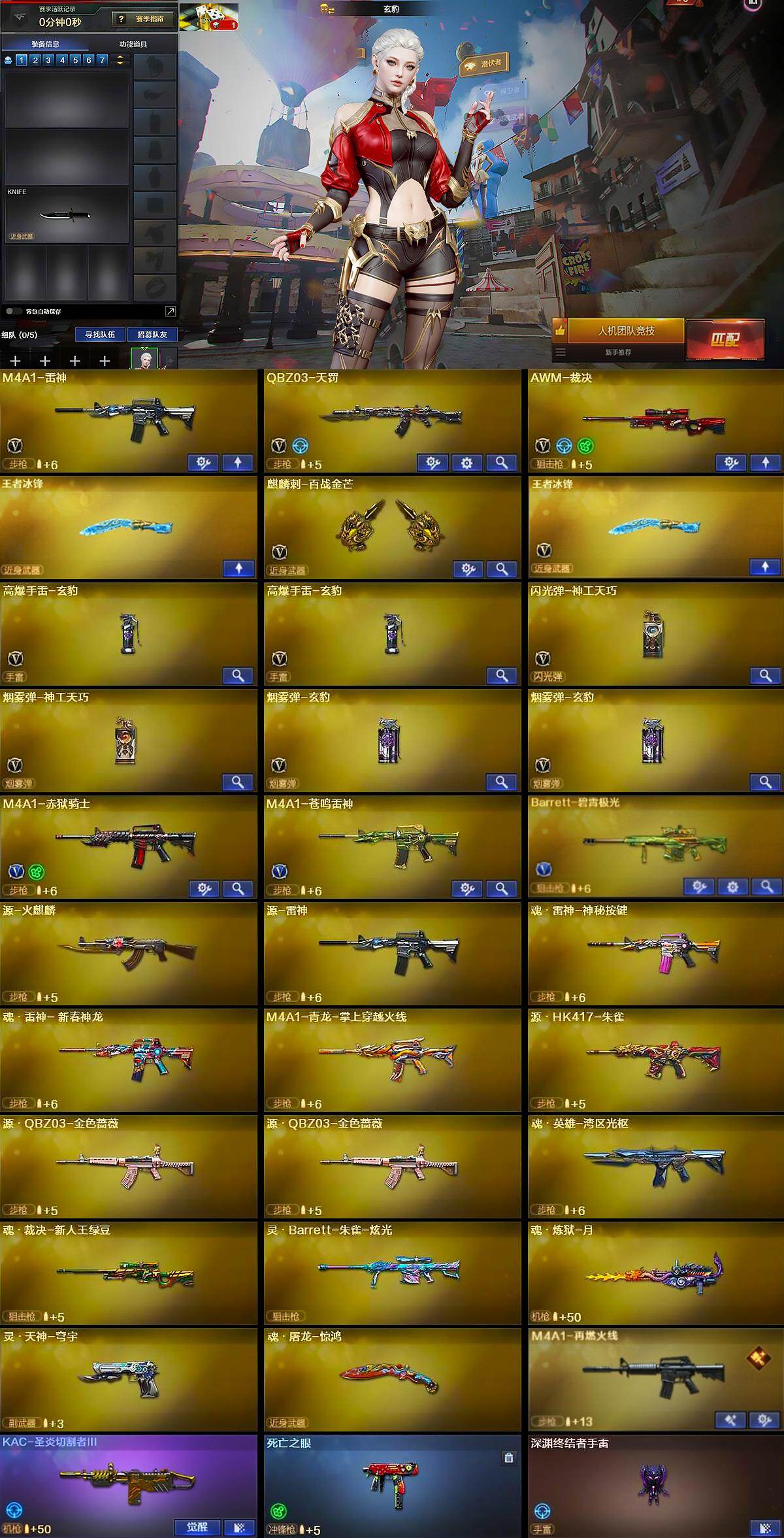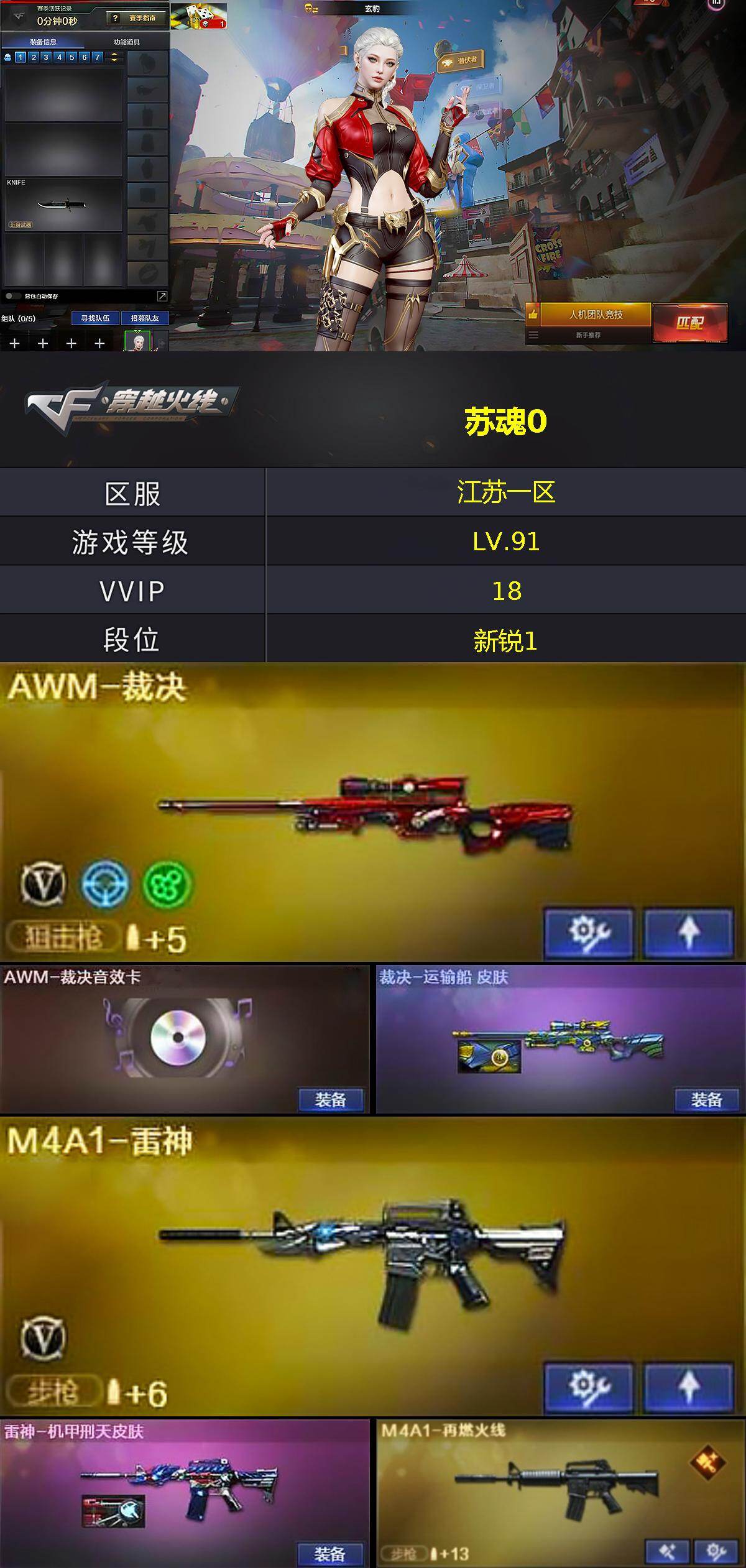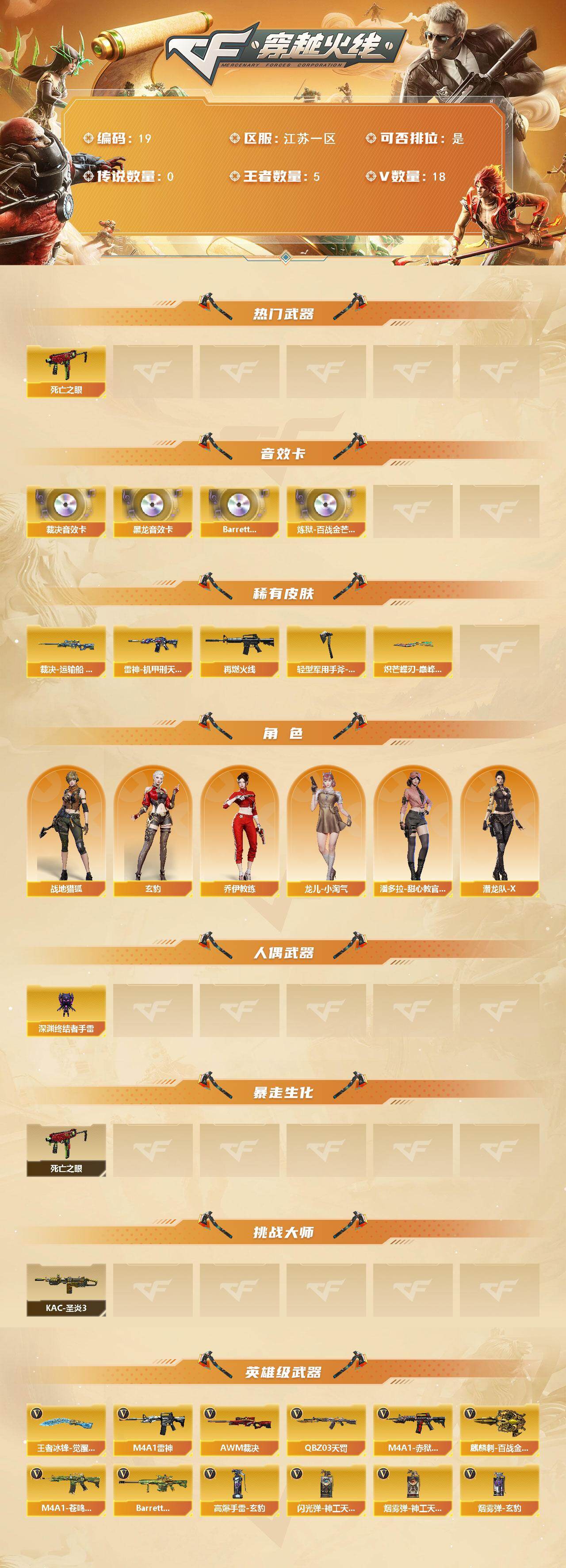 【裁决三件套】【等级】91【区服】江苏一区【英雄角色】1【英雄武器】17【王者级武器】盐雾蛋-雷暴王者 闪光丹-雷暴王者 高爆手蕾-雷暴王者 高爆手蕾-雷暴王者 王者冰锋【英雄级角色】战地猎狐 玄豹 葵-阿尔法武装【英雄级武器】barrett-毁灭 m4a1-雷神 屠龙-电竞之星 盐雾蛋-神工天巧 闪光丹-神工天巧 m4a1-苍鸣雷神 barrett-碧霄极光 m4a1-再燃火