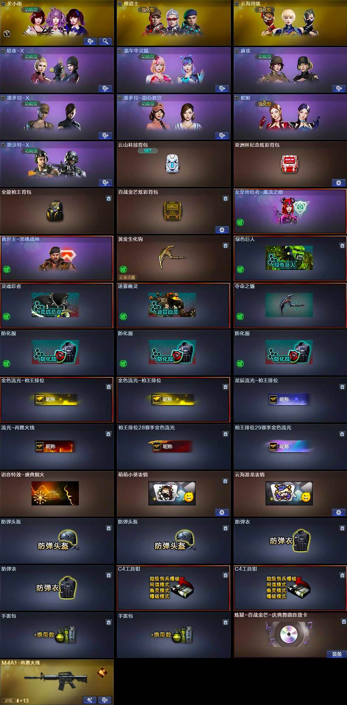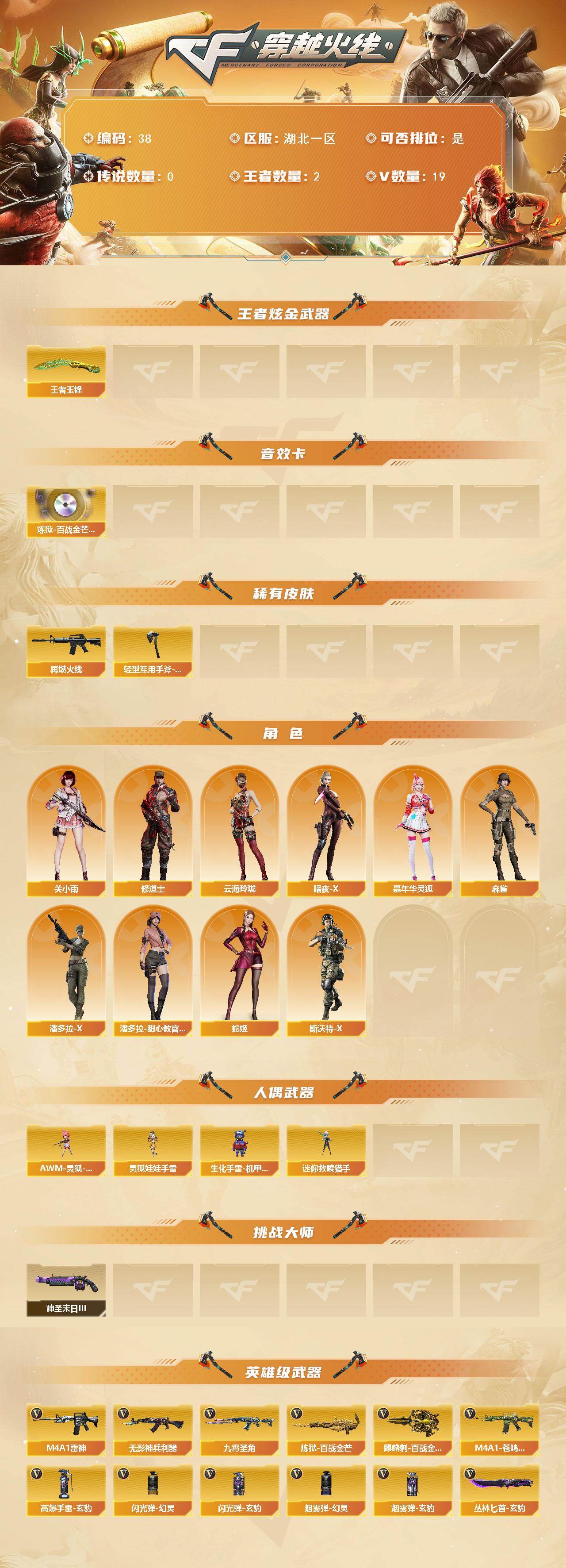【38】【过年不打烊放心选购·特价出售】湖北一区-19v-2王者武器数-0炫金武器数 【王者炫金武器】:王者玉锋 【音效卡】:炼狱-百战金芒-庆典舞曲音效卡 【皮肤】:m4a1-再燃火线,轻型军用手斧-再燃火线 【角色】:关小雨,修道士,云海玲珑,暗夜-x,嘉年华灵狐,麻雀,潘多拉-x,潘多拉-甜心教官,蛇姬,斯沃特-x 【人偶武器】:迷你救赎猎手,awm-灵狐-15周年嘉年华,生化手蕾-机甲核心,灵狐娃娃手蕾2 【挑战大师】:神圣爆裂者-末日iii 【英雄级武器】:m4a1-雷神,无影-神兵利器,九霄圣角,炼狱-百战金芒,麒麟刺-百战金芒,丛林匕首-玄豹,高爆手蕾-玄豹,闪光丹-幻灵,闪光丹-玄豹,盐雾蛋-幻灵,盐雾蛋-玄豹2,m4a1-苍鸣雷神 【道具】:云山科技背包,亚洲杯纪念炫彩背包,全能呛王背包,百战金芒炫彩背包,女皇终结者-魔龙之吻,救世主-黑桃战神,黄金生化钩,绿色巨人,灵魂忍者,迷雾幽灵,夺命之镰,防化服3,金色流光-呛王排位2,星辰流光-呛王排位,流光-再燃火线,呛王排位28赛季金色流光,呛王排位29赛季金色流光,语音特效-盛典烟火,萌萌小葵表情,云海游龙表情,防弹头盔2,防弹衣2,c4工具钳2,手蕾包2 【特殊呛械】: