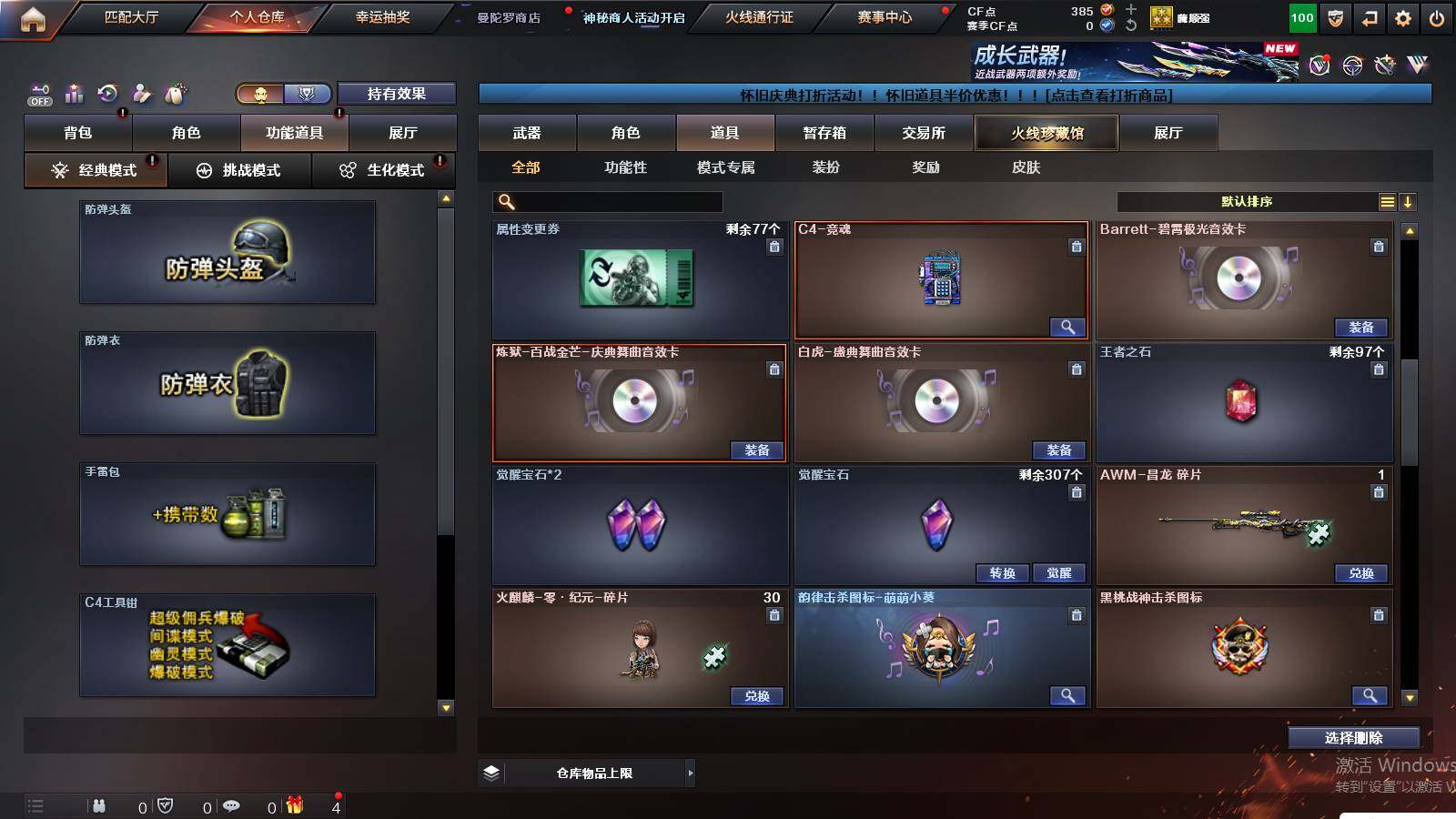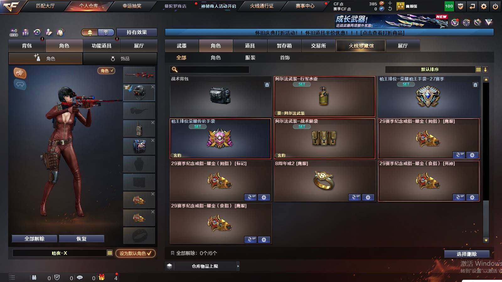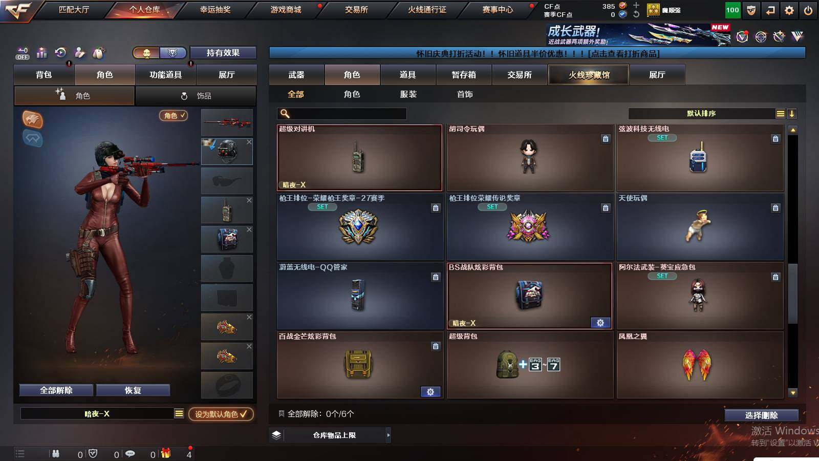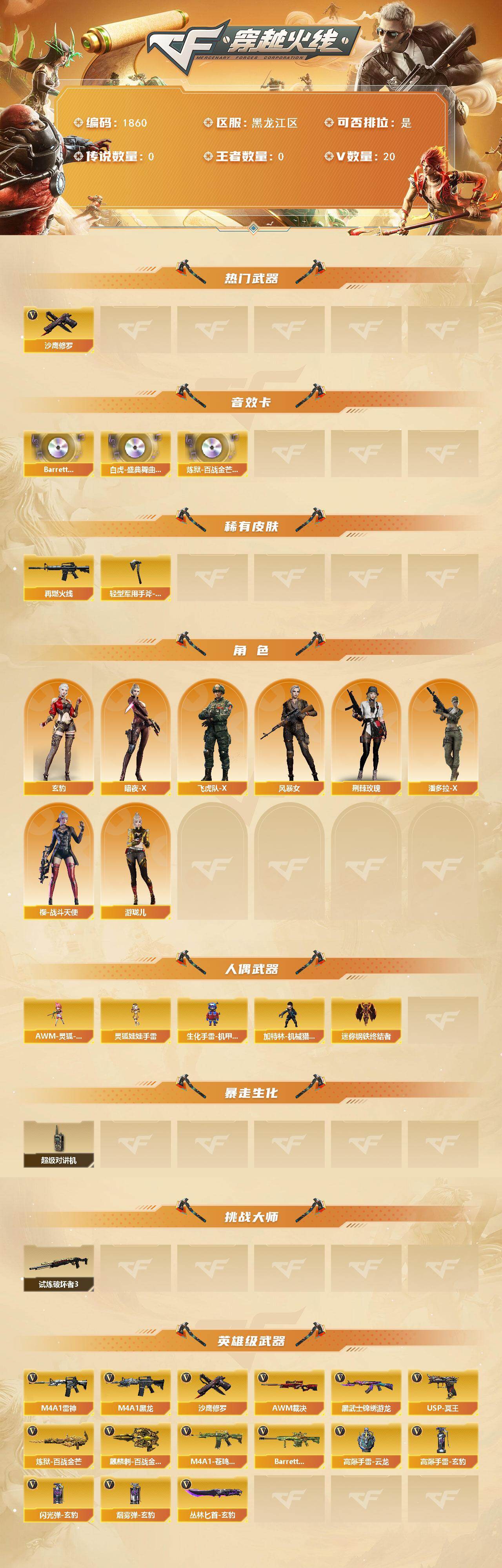 黑龙江区-20v 【热门武器】:沙鹰-修罗2 【音效卡】:barrett-碧霄极光音效卡,白虎-盛典舞曲音效卡,炼狱-百战金芒-庆典舞曲音效卡 【皮肤】:m4a1-再燃火线,轻型军用手斧-再燃火线 【角色】:玄豹,暗夜-x,飞虎队-x,风暴女,荆棘玫瑰,潘多拉-x,樱-战斗天使,游珑儿 【人偶武器】:迷你钢铁终结者,加特林-机械猎手,awm-灵狐-15周年嘉年华,生化手蕾-机甲核心2,灵狐