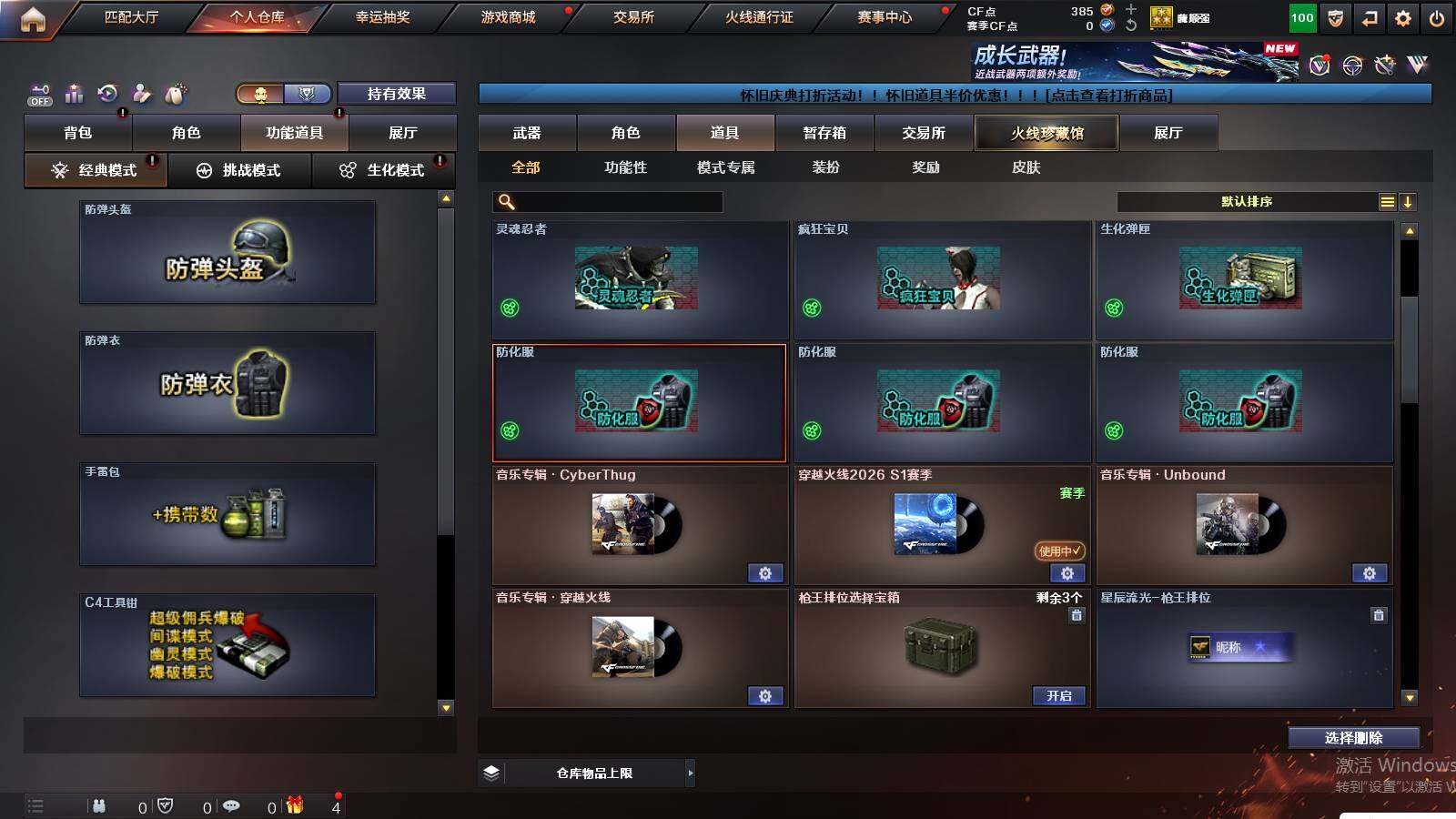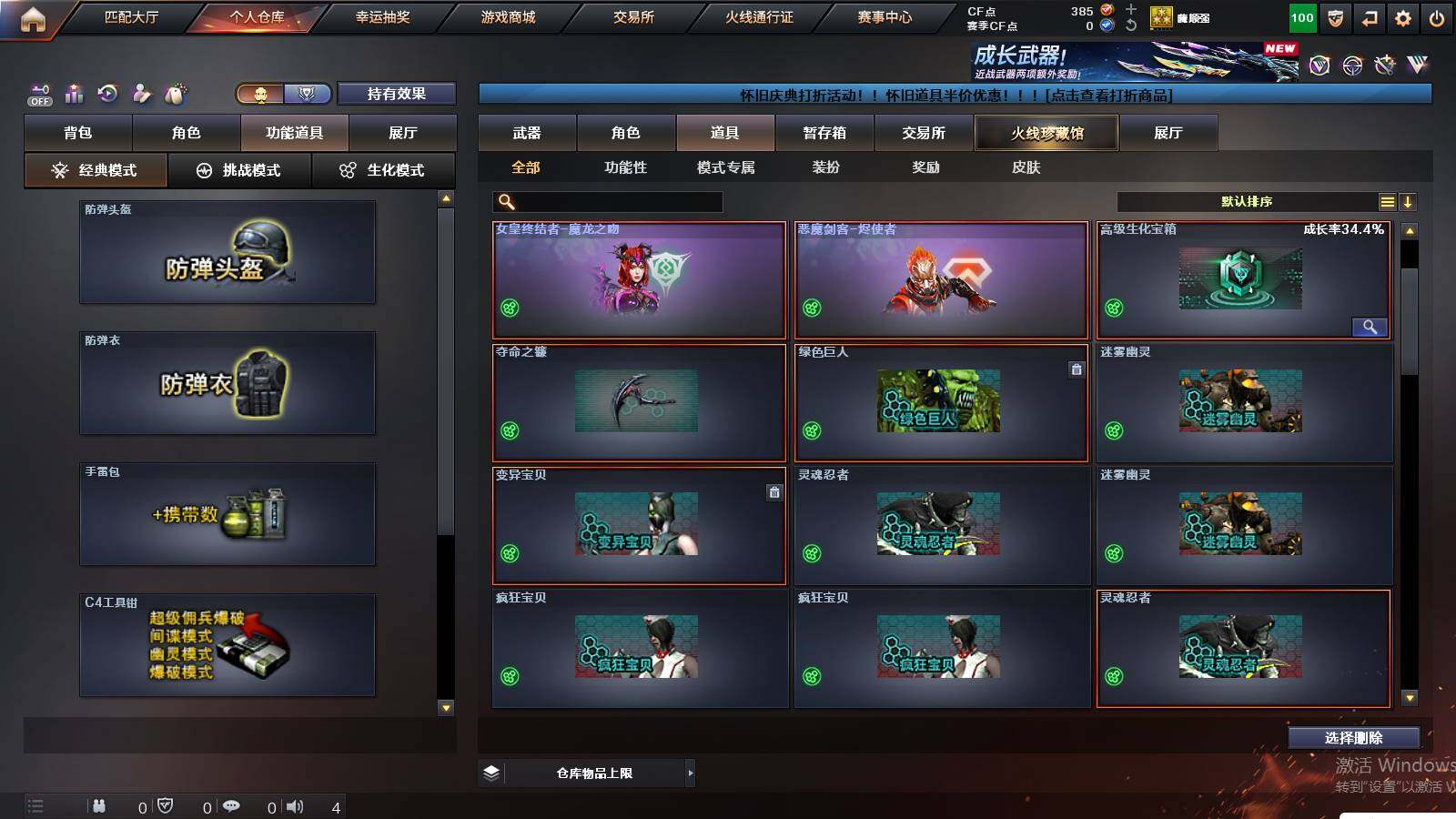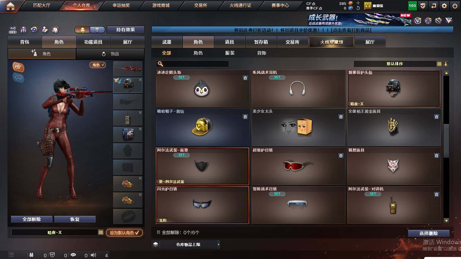 黑龙江区-20v 【热门武器】:沙鹰-修罗2 【音效卡】:barrett-碧霄极光音效卡,白虎-盛典舞曲音效卡,炼狱-百战金芒-庆典舞曲音效卡 【皮肤】:m4a1-再燃火线,轻型军用手斧-再燃火线 【角色】:玄豹,暗夜-x,飞虎队-x,风暴女,荆棘玫瑰,潘多拉-x,樱-战斗天使,游珑儿 【人偶武器】:迷你钢铁终结者,加特林-机械猎手,awm-灵狐-15周年嘉年华,生化手蕾-机甲核心2,灵狐