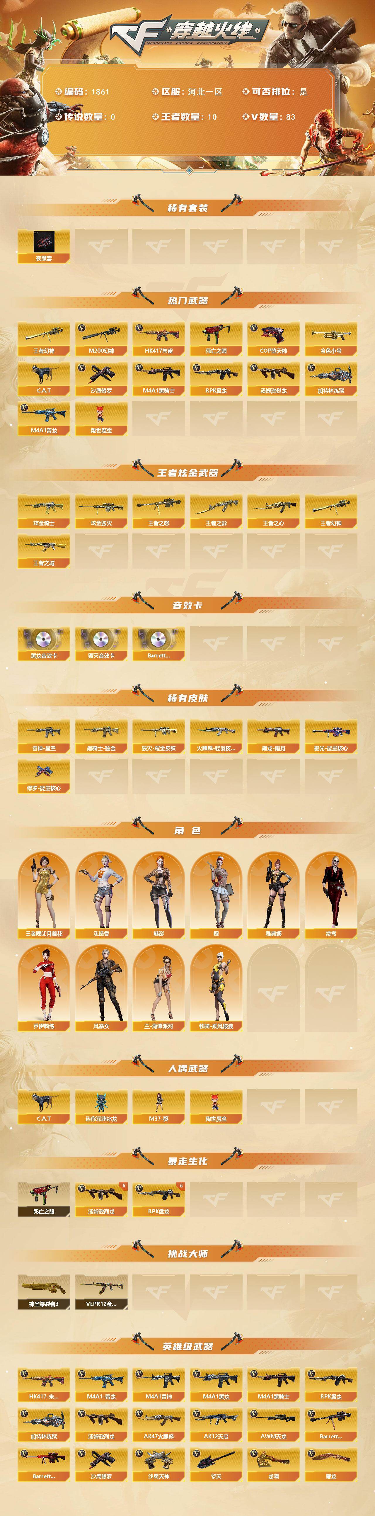 河北一区-83v 【热门武器】:王者幻神,hk417-朱雀,m4a1-青龙,m200-幻神,死亡之眼,金色小号,c.a.t,m4a1-黑骑士2,汤姆逊-烈龙6,rpk-盘龙6,加特林-炼狱,降世魔童,cop-堕天神,沙鹰-修罗2 【王者炫金武器】:王者之城,王者之影,王者之心,王者幻神,王者之怒,炫金骑士,炫金毁灭 【音效卡】:m4a1-黑龙音效卡,barrett-毁灭音效卡,barr
