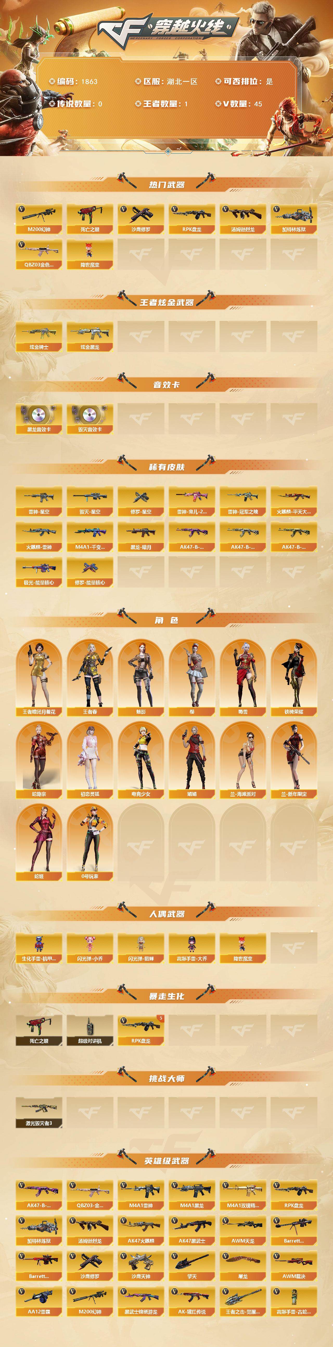 湖北一区-45v-1王者武器数-4炫金武器数 【热门武器】:q03-金色蔷薇,m200-幻神,死亡之眼2,汤姆逊-烈龙,rpk-盘龙5,加特林-炼狱,降世魔童2,沙鹰-修罗3 【王者炫金武器】:炫金骑士3,炫金黑龙 【音效卡】:m4a1-黑龙音效卡2,barrett-毁灭音效卡 【皮肤】:雷神-星空,雷神-冠军之魄,雷神-宠儿-2019mvp,火麒麟-雷神,火麒麟-平天大圣,毁