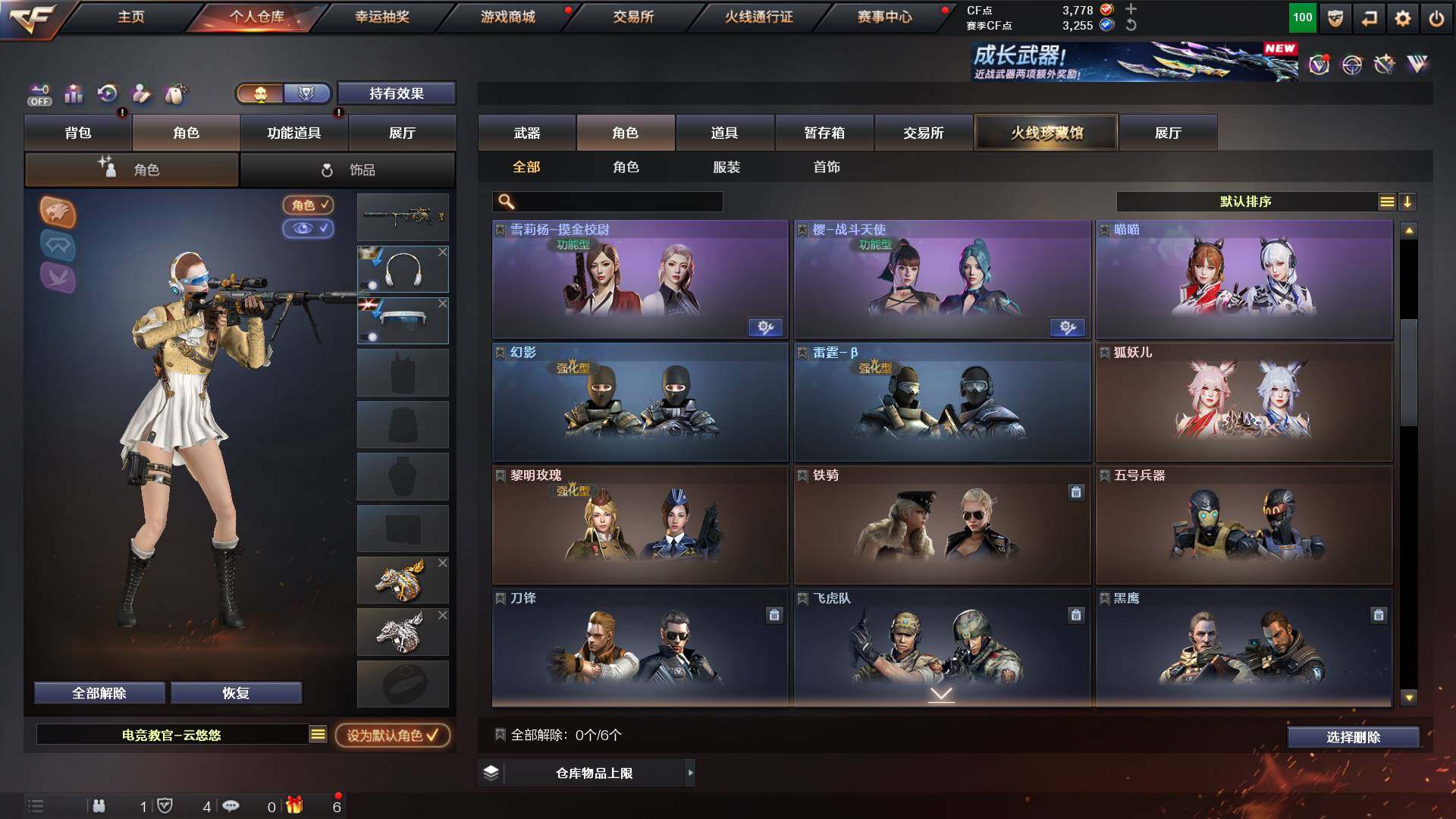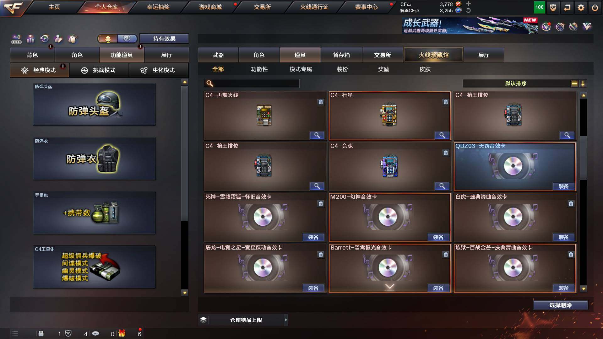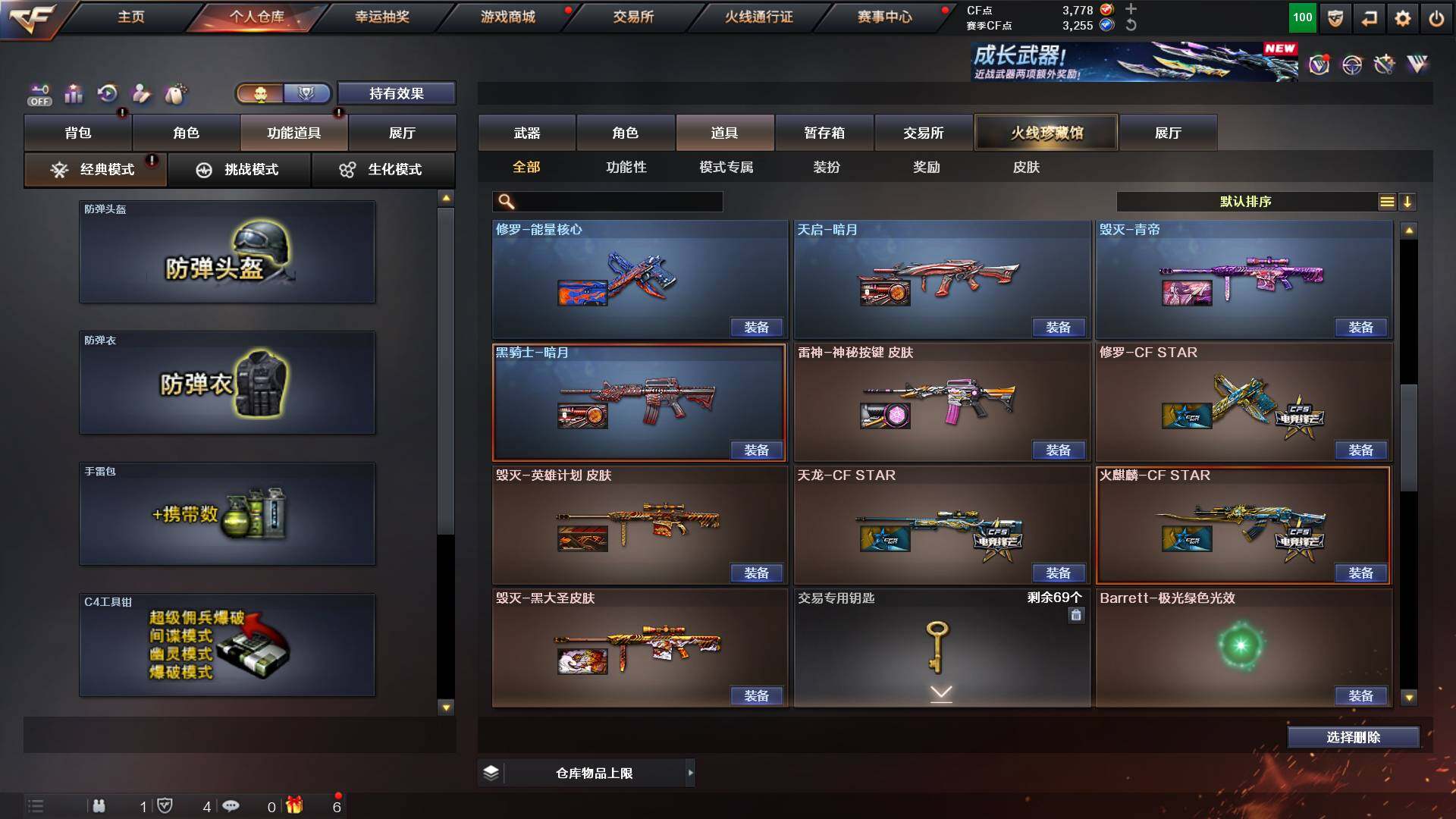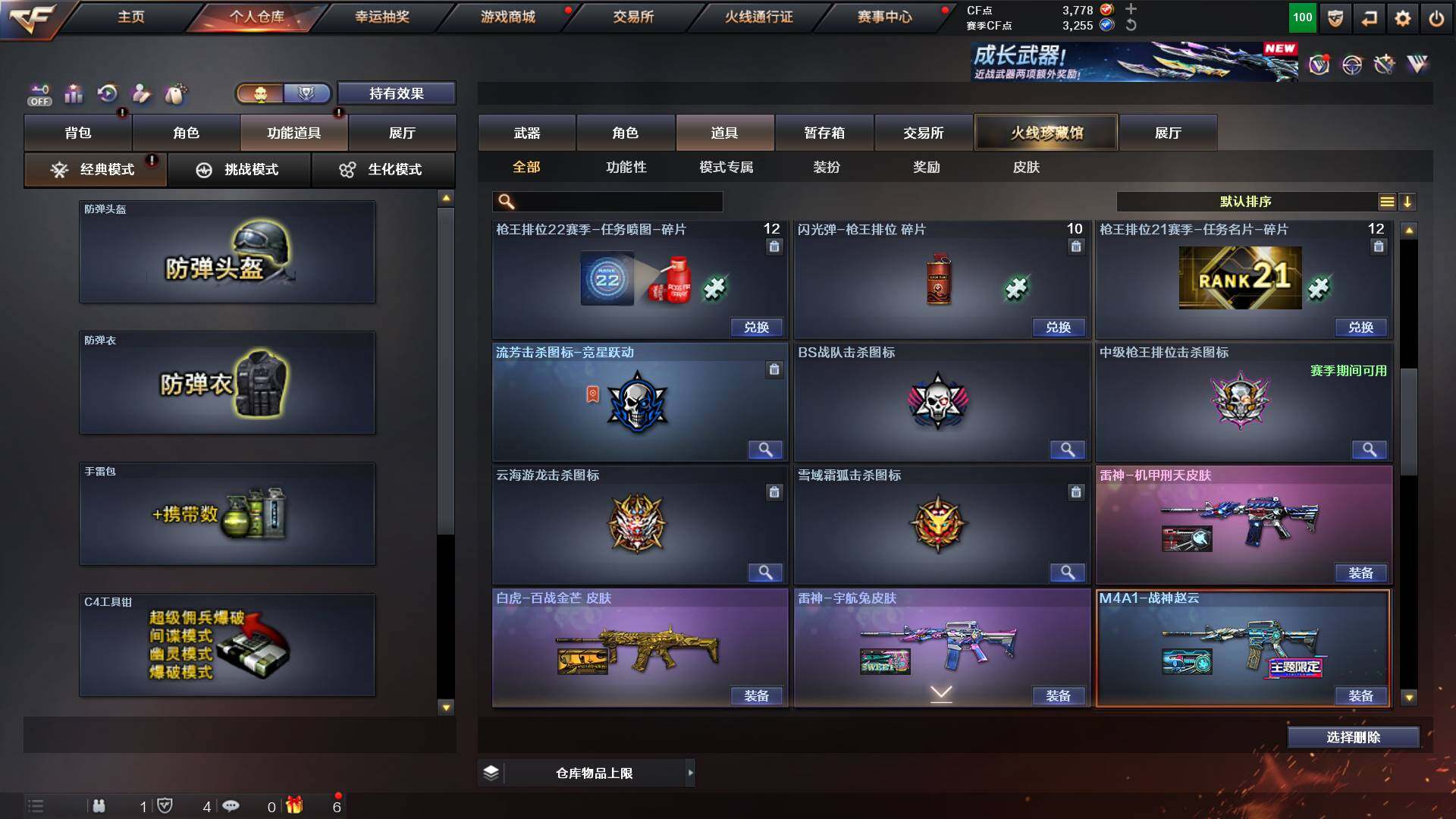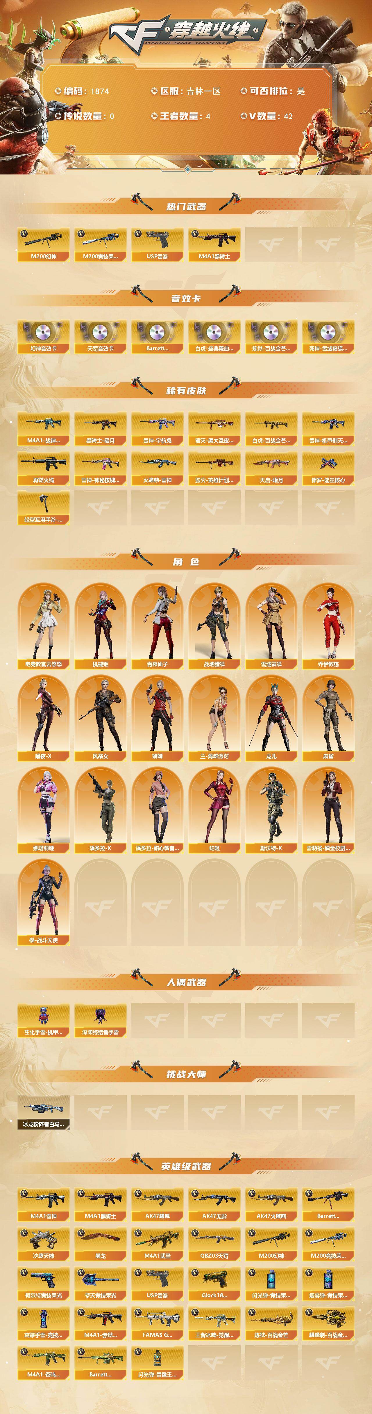 吉林一区-42v-4王者武器数-0炫金武器数 【热门武器】:m200-幻神,m200-竞技荣光,m4a1-黑骑士,usp-雷暴 【音效卡】:m200-幻神音效卡,q03-天罚音效卡,barrett-碧霄极光音效卡,白虎-盛典舞曲音效卡,炼狱-百战金芒-庆典舞曲音效卡,死神-雪域霜狐-怀旧音效卡 【皮肤】:白虎-百战金芒 皮肤,m4a1-战神赵云,雷神-机甲刑天皮肤,雷神-宇航兔皮肤,m4a