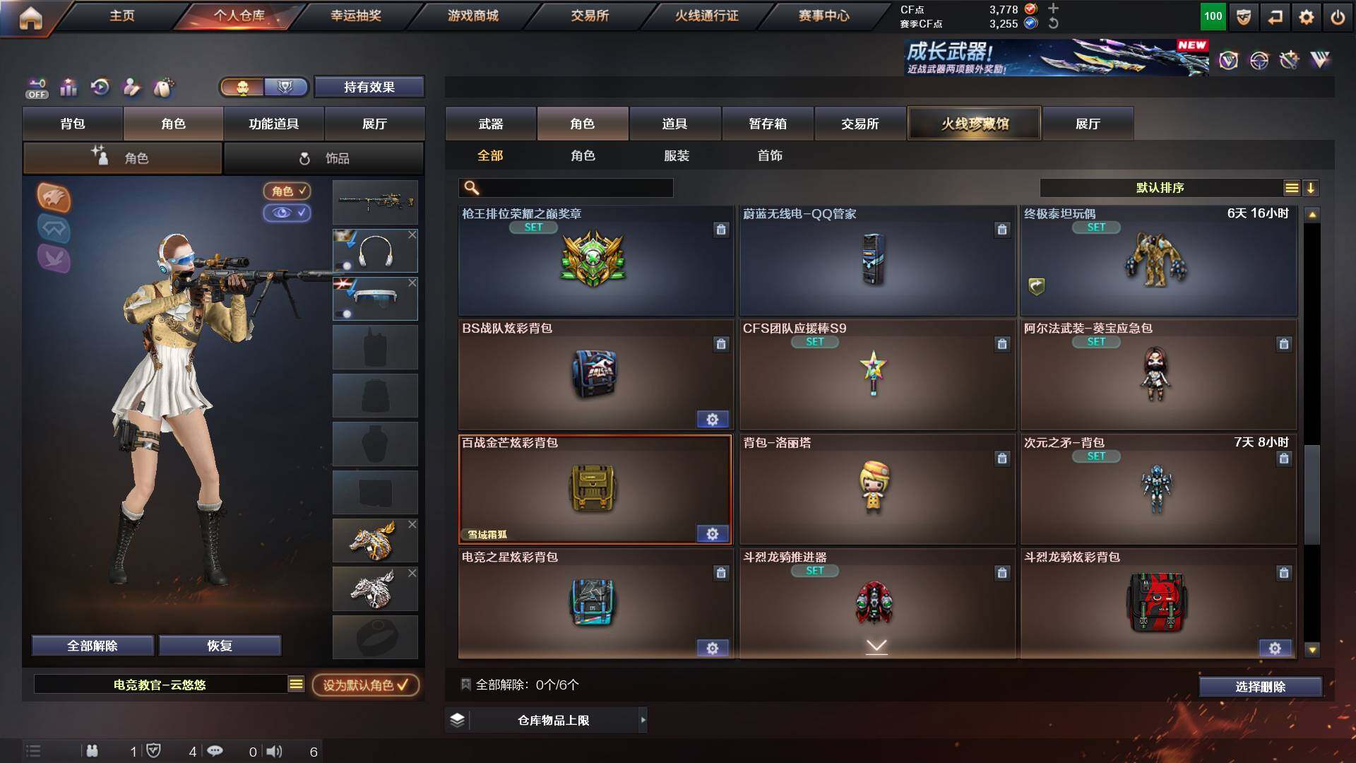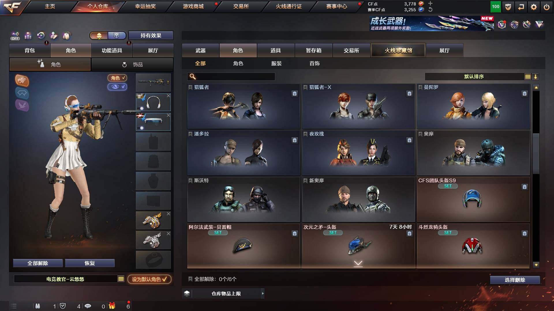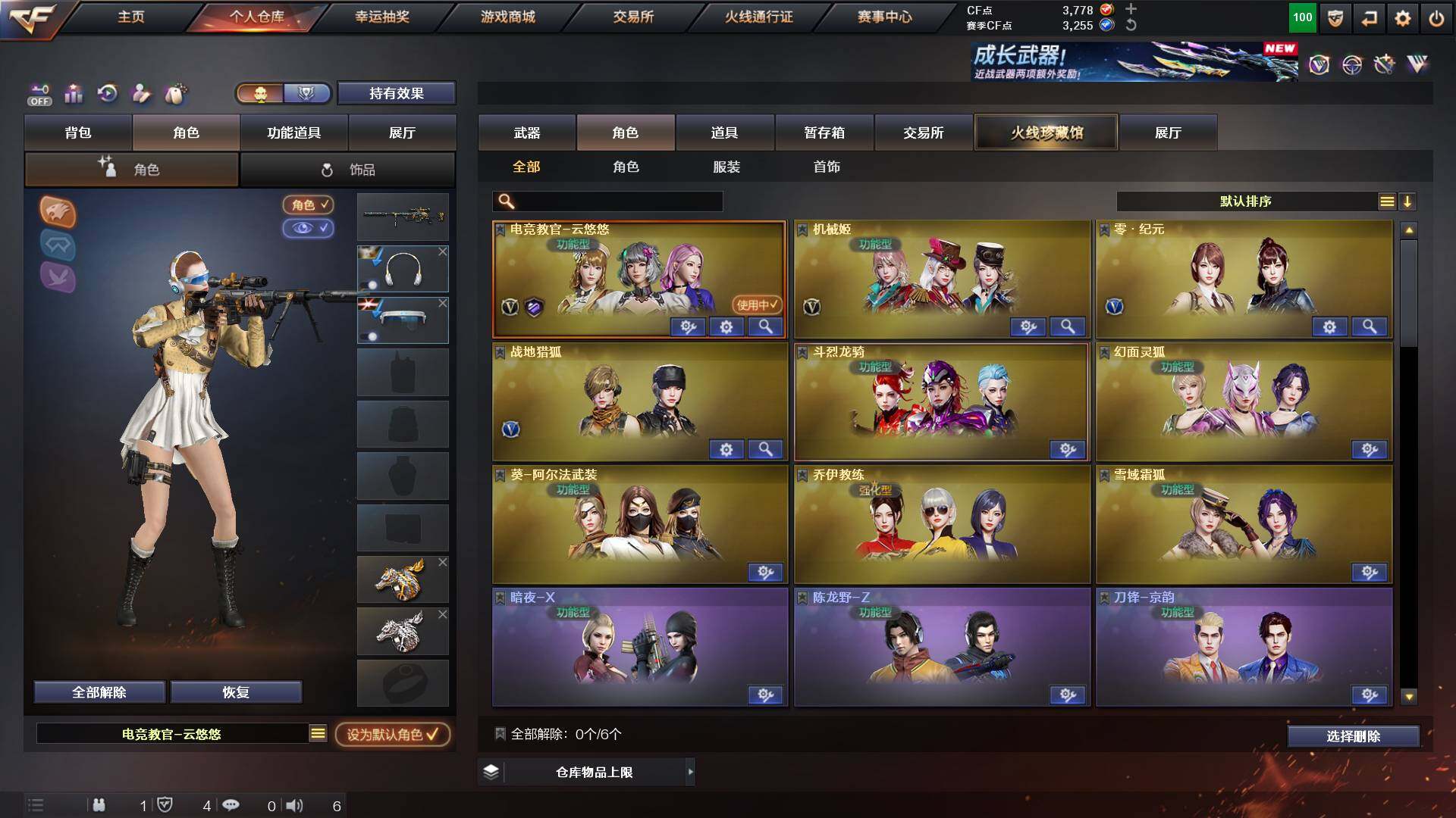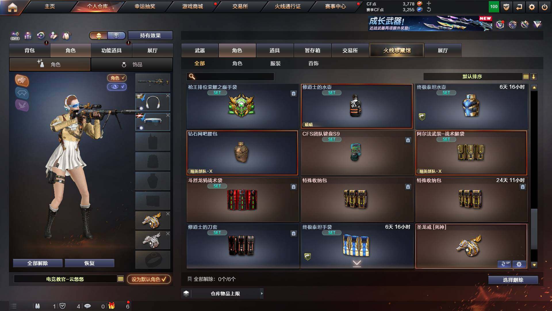 吉林一区-42v-4王者武器数-0炫金武器数 【热门武器】:m200-幻神,m200-竞技荣光,m4a1-黑骑士,usp-雷暴 【音效卡】:m200-幻神音效卡,q03-天罚音效卡,barrett-碧霄极光音效卡,白虎-盛典舞曲音效卡,炼狱-百战金芒-庆典舞曲音效卡,死神-雪域霜狐-怀旧音效卡 【皮肤】:白虎-百战金芒 皮肤,m4a1-战神赵云,雷神-机甲刑天皮肤,雷神-宇航兔皮肤,m4a