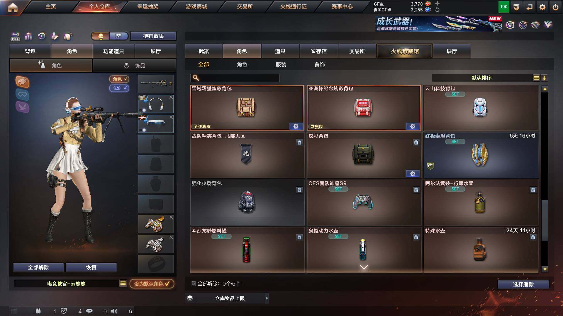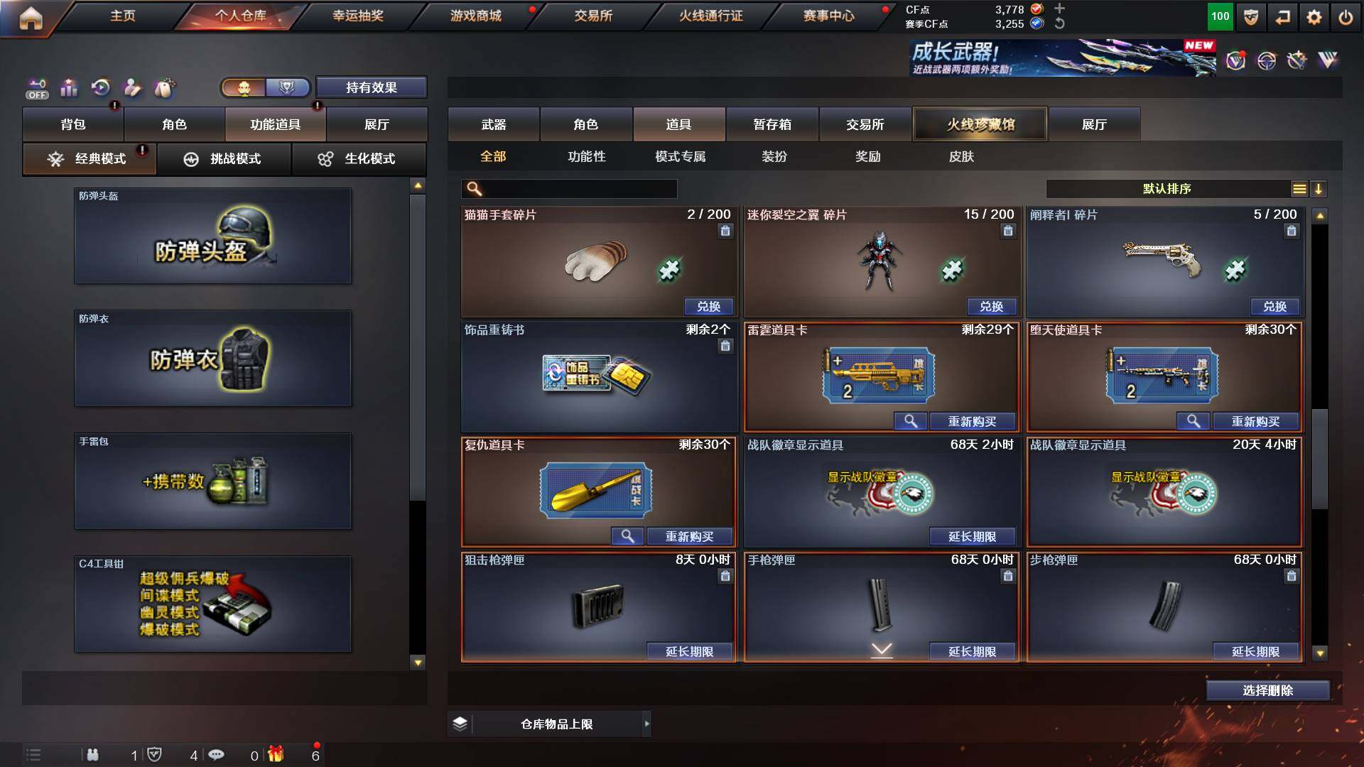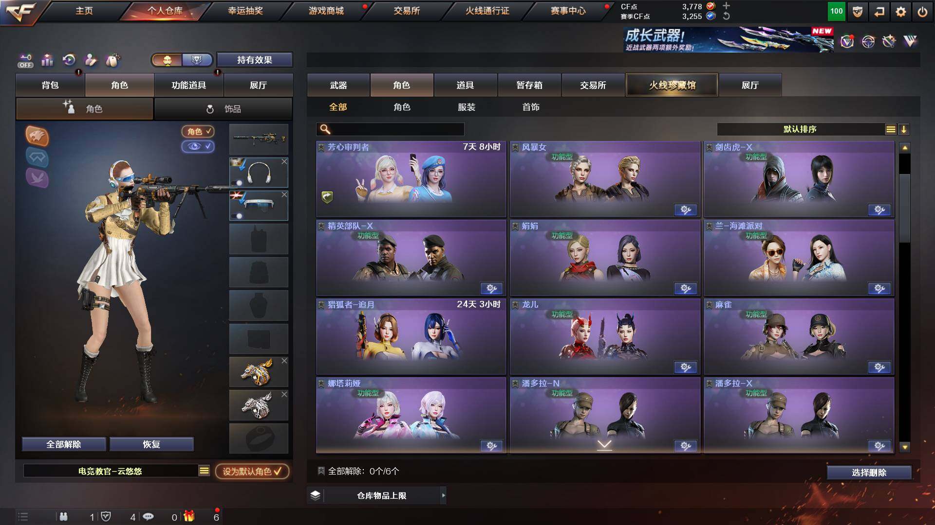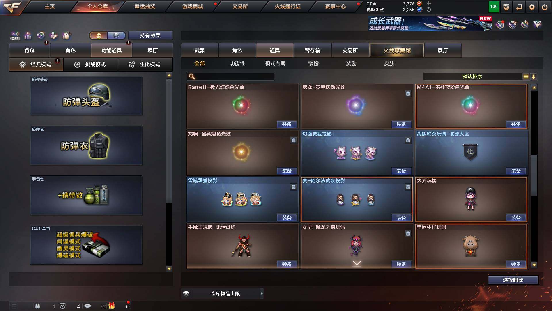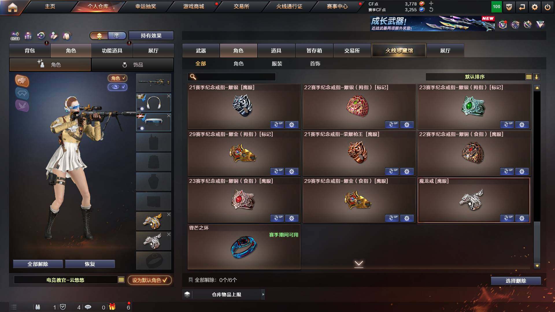 吉林一区-42v-4王者武器数-0炫金武器数 【热门武器】:m200-幻神,m200-竞技荣光,m4a1-黑骑士,usp-雷暴 【音效卡】:m200-幻神音效卡,q03-天罚音效卡,barrett-碧霄极光音效卡,白虎-盛典舞曲音效卡,炼狱-百战金芒-庆典舞曲音效卡,死神-雪域霜狐-怀旧音效卡 【皮肤】:白虎-百战金芒 皮肤,m4a1-战神赵云,雷神-机甲刑天皮肤,雷神-宇航兔皮肤,m4a