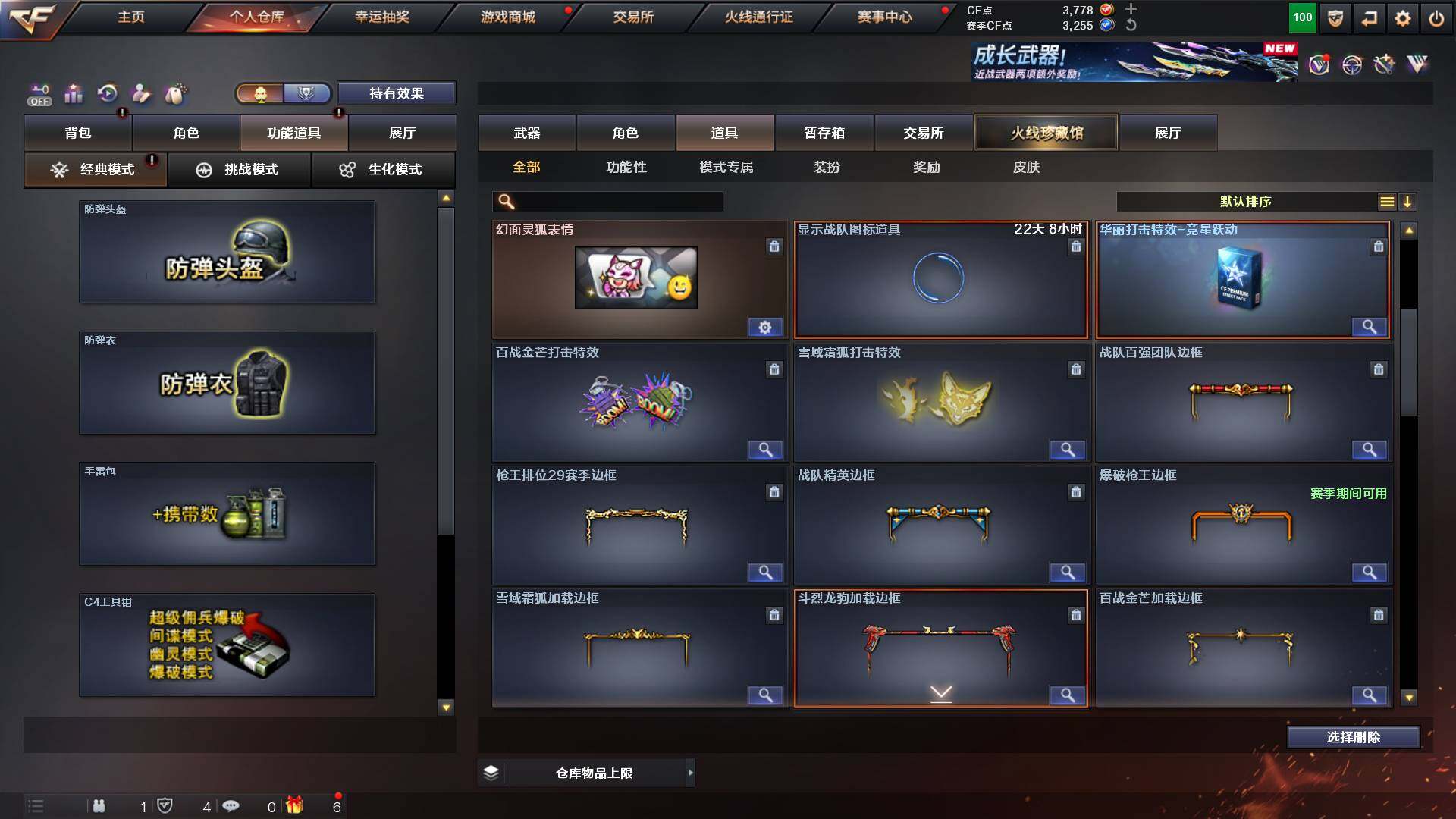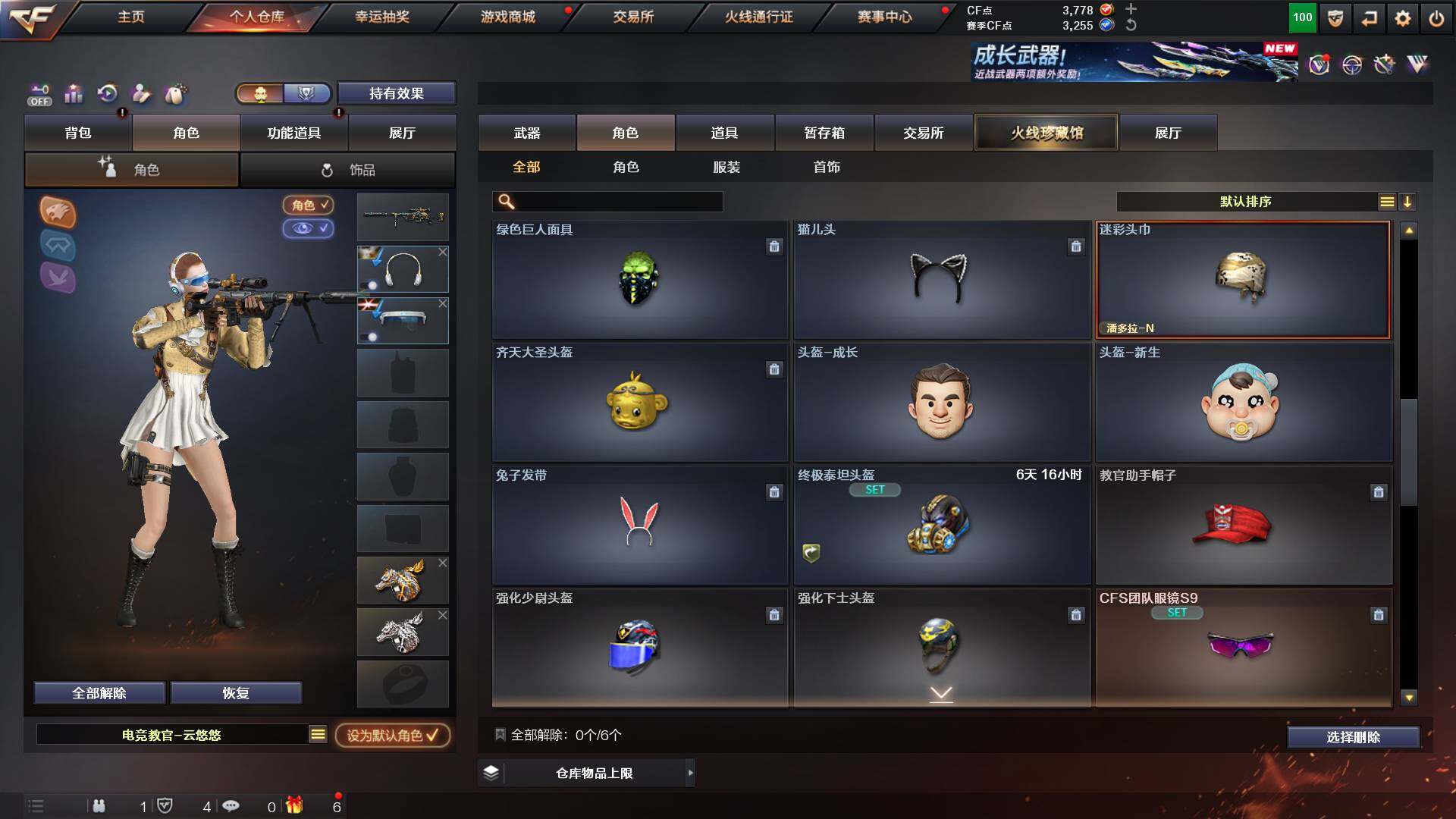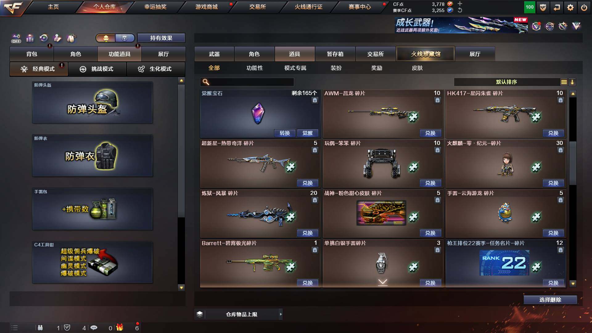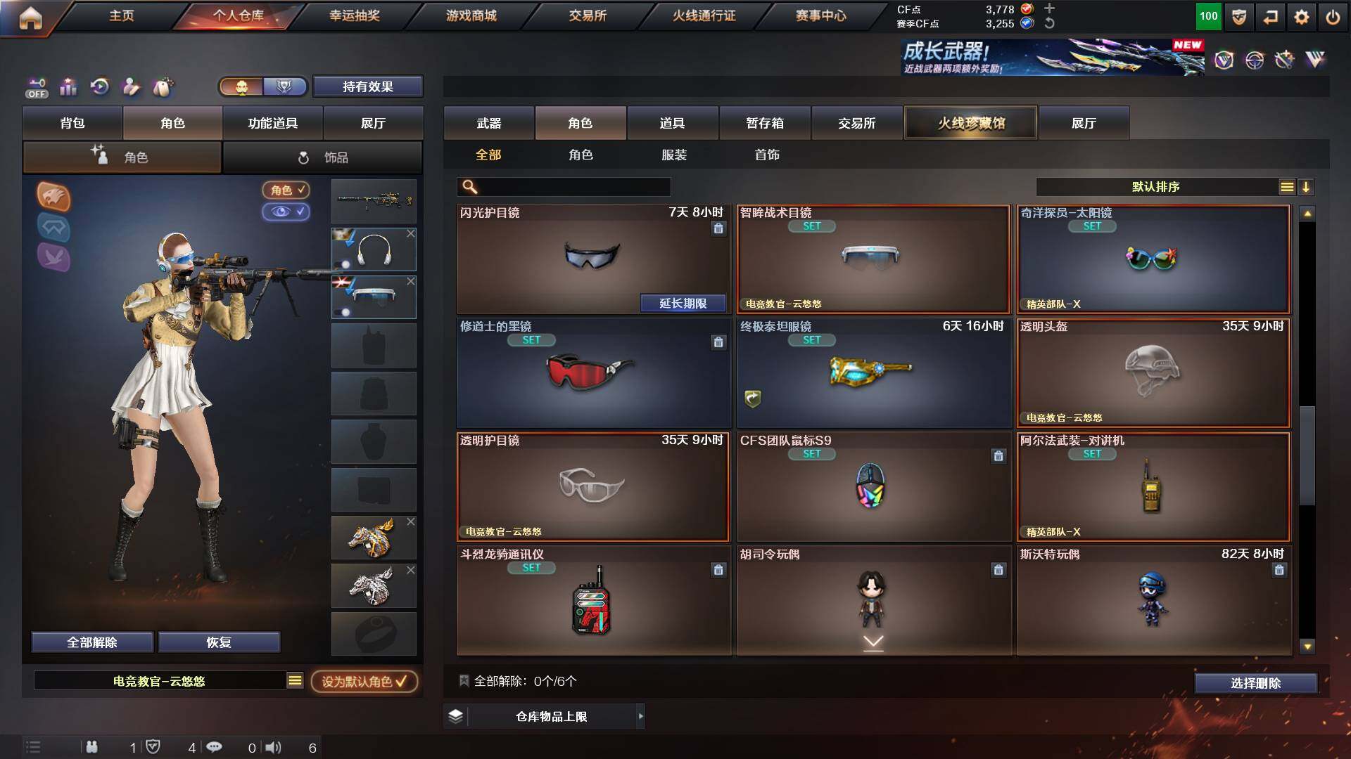 吉林一区-42v-4王者武器数-0炫金武器数 【热门武器】:m200-幻神,m200-竞技荣光,m4a1-黑骑士,usp-雷暴 【音效卡】:m200-幻神音效卡,q03-天罚音效卡,barrett-碧霄极光音效卡,白虎-盛典舞曲音效卡,炼狱-百战金芒-庆典舞曲音效卡,死神-雪域霜狐-怀旧音效卡 【皮肤】:白虎-百战金芒 皮肤,m4a1-战神赵云,雷神-机甲刑天皮肤,雷神-宇航兔皮肤,m4a