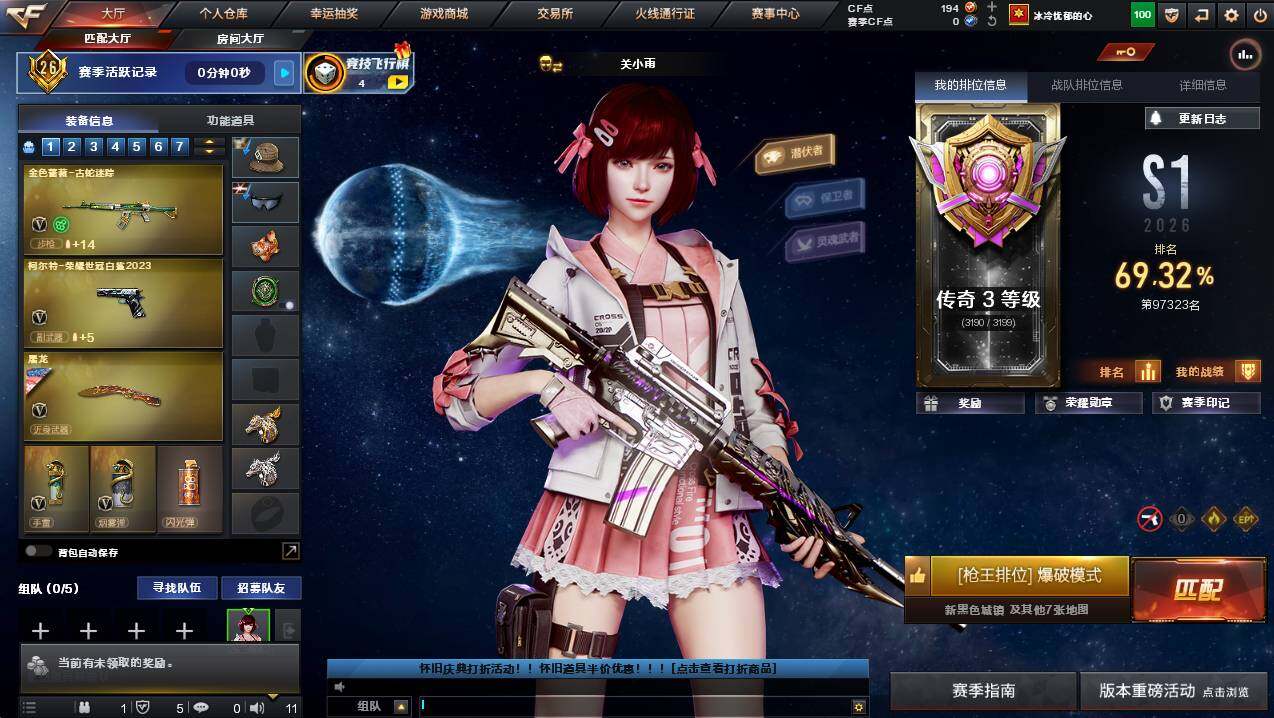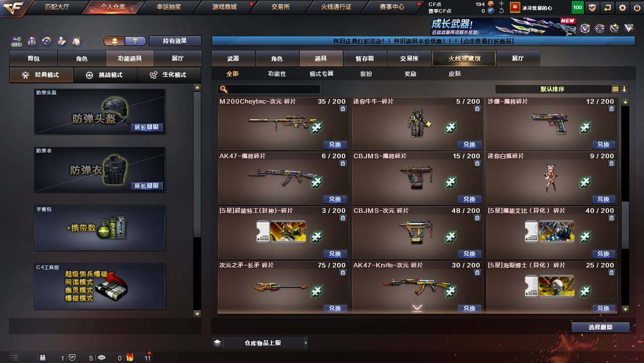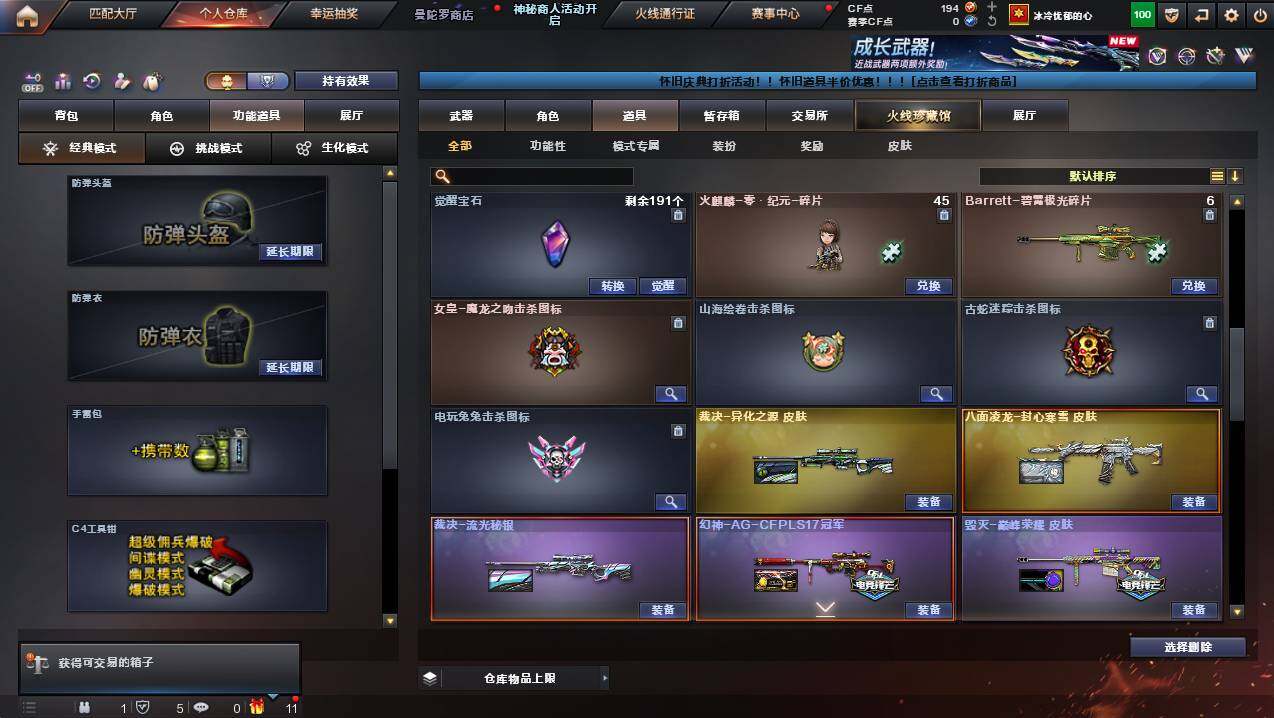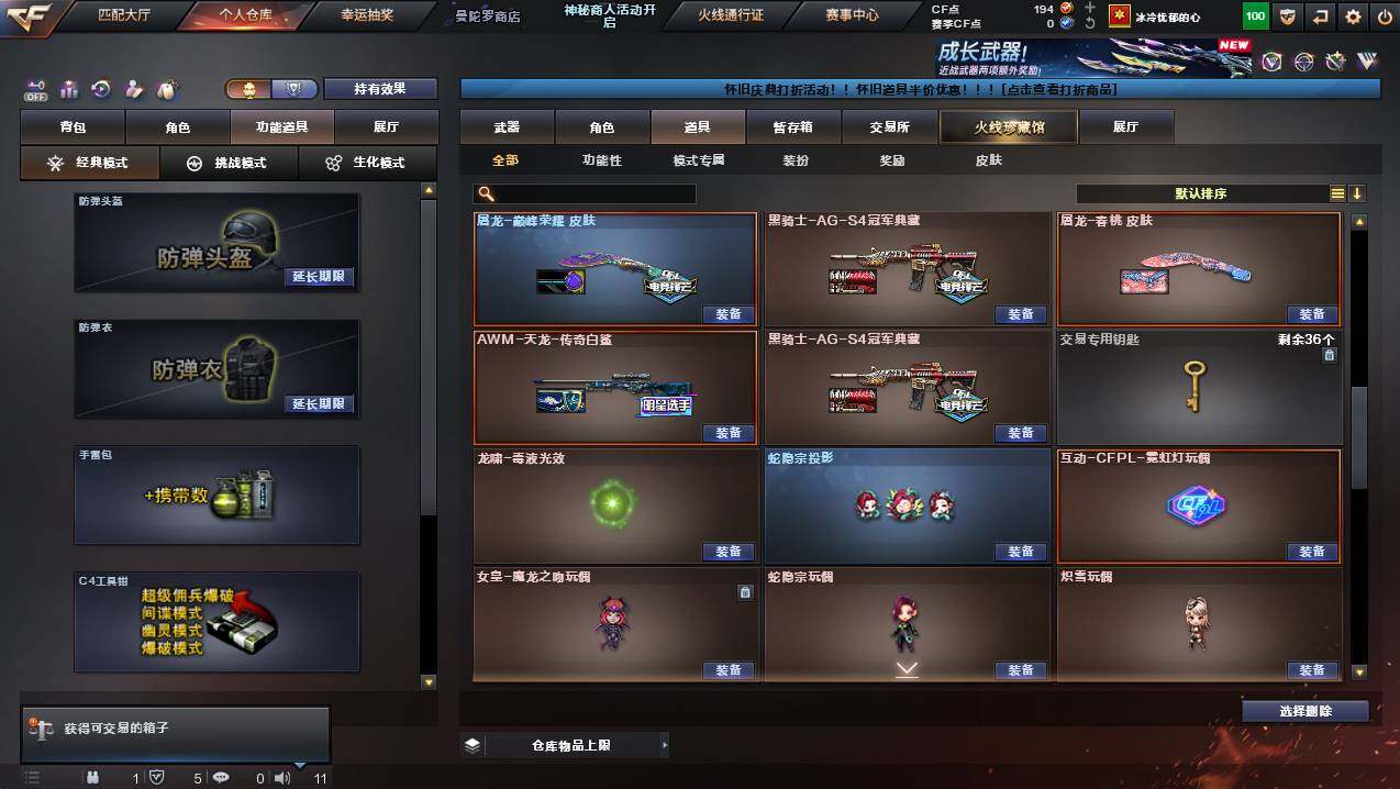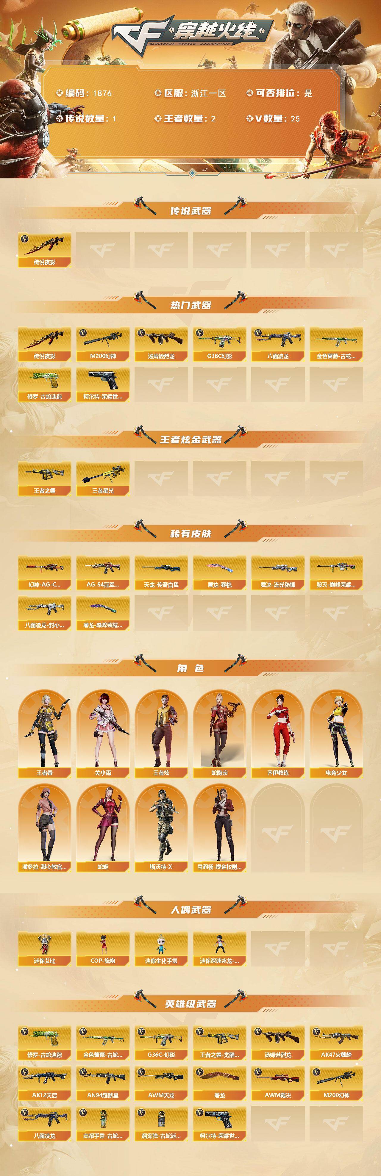 浙江一区-25v-2王者武器数-0炫金武器数 【传说武器】:传说夜影 【热门武器】:传说夜影,g36c-幻影,m200-幻神,柯尔特-荣耀世冠白鲨2023,金色蔷薇-古蛇迷踪,修罗-古蛇迷踪,八面凌龙,汤姆逊-烈龙 【王者炫金武器】:王者星光,王者之霆 【皮肤】:幻神-ag-cfpls17冠军,裁决-流光秘银,毁灭-巅峰荣耀 皮肤,黑骑士-ag-s4冠军典藏2,八面凌龙-封心寒雪 皮肤,aw