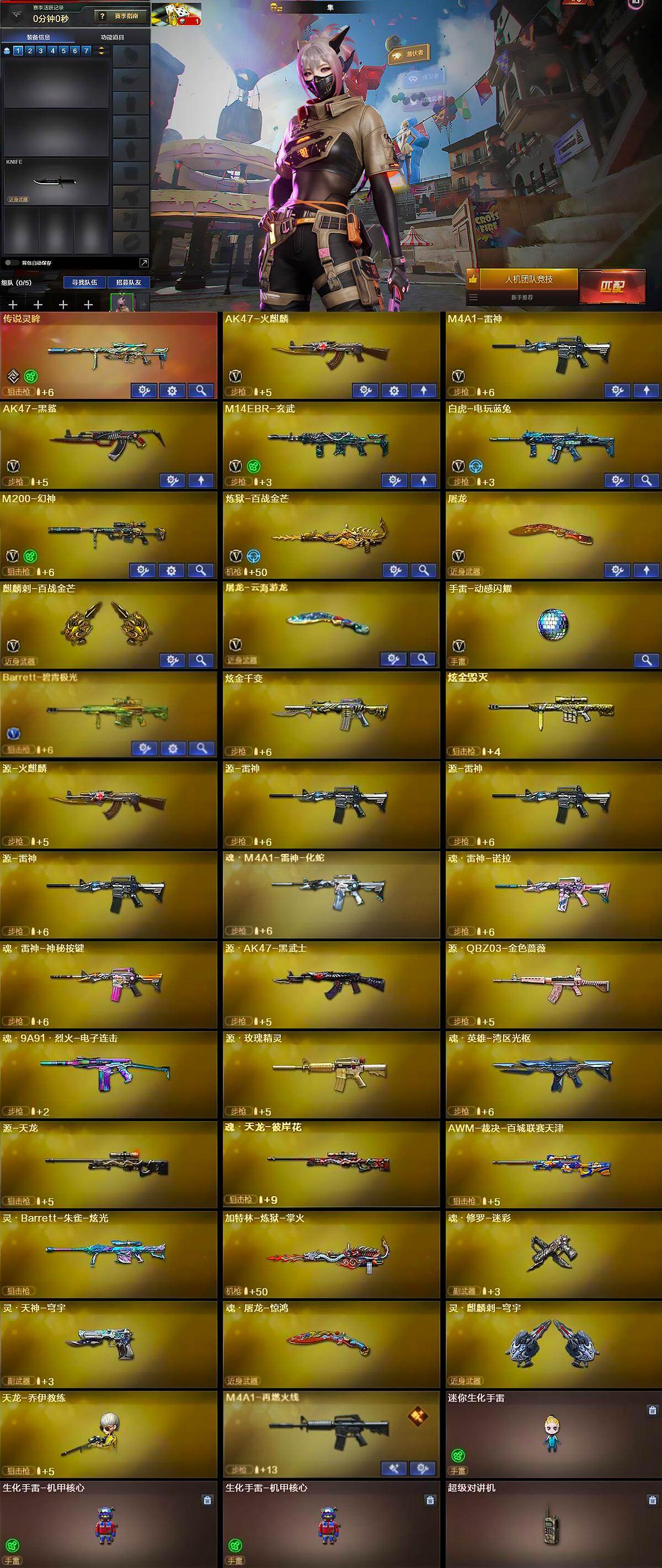 南方大区-22v-0王者-2炫金 【传说武器】:传说灵眸 【热门武器】:传说灵眸,m14ebr-玄武,m200-幻神,白虎-电玩蓝兔 【王者炫金武器】:炫金千变,炫金毁灭 【音效卡】:麒麟刺-百战金芒-盛典舞曲音效卡,炼狱-百战金芒-庆典舞曲音效卡 【皮肤】:幻神-动感闪耀 皮肤,雷神-源计划2.0
