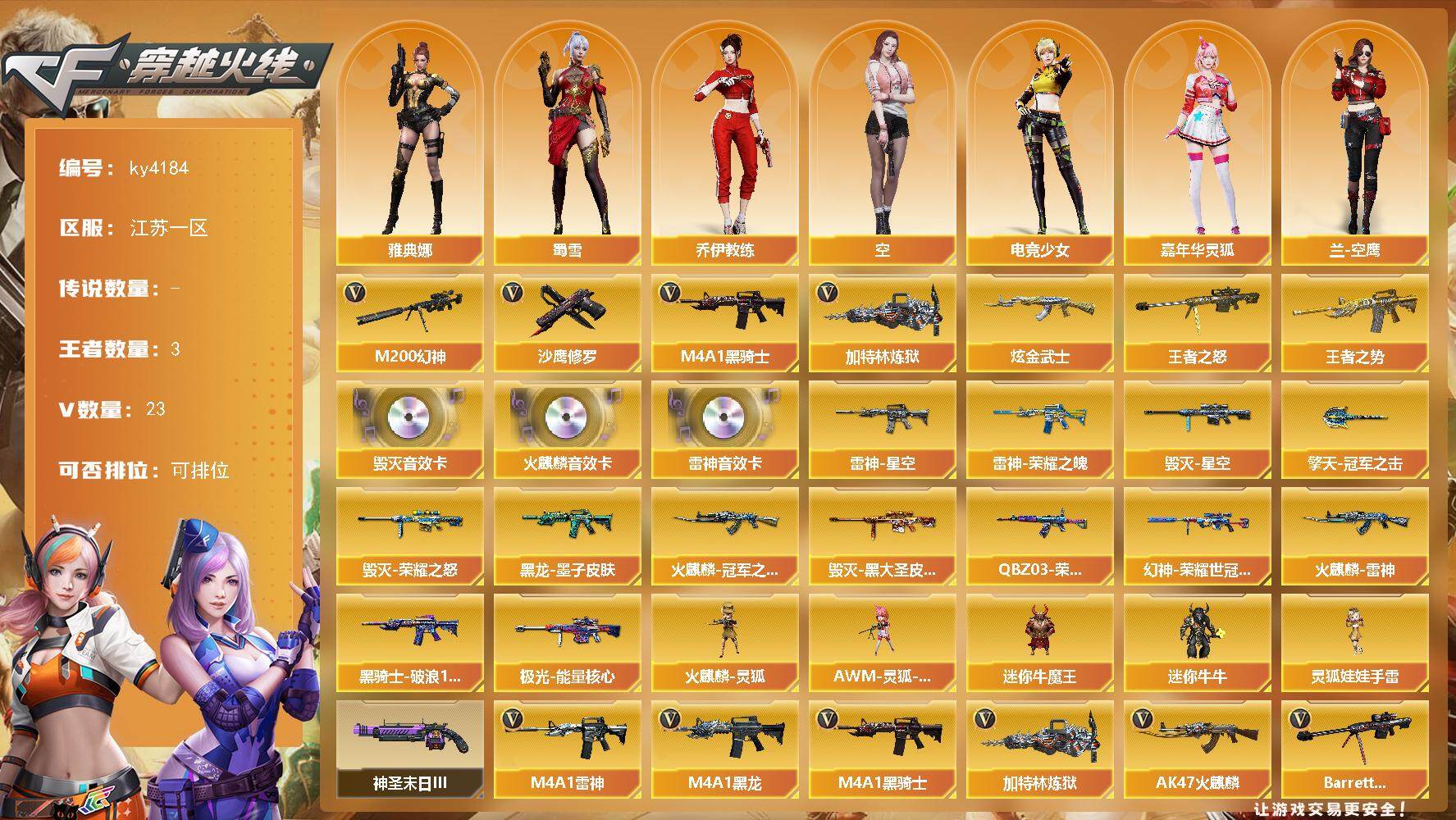 江苏一区-23v-2王者武器数-1炫金武器数 【热门武器】:m200-幻神,m4a1-黑骑士,加特林-炼狱2,沙鹰-修罗4 【王者炫金武器】:王者之势,王者之怒,炫金武士 【音效卡】:ak47-火麒麟音效卡,m4a1-雷神音效卡,barrett-毁灭音效卡 【皮肤】:m200-幻神-荣耀世冠白鲨
