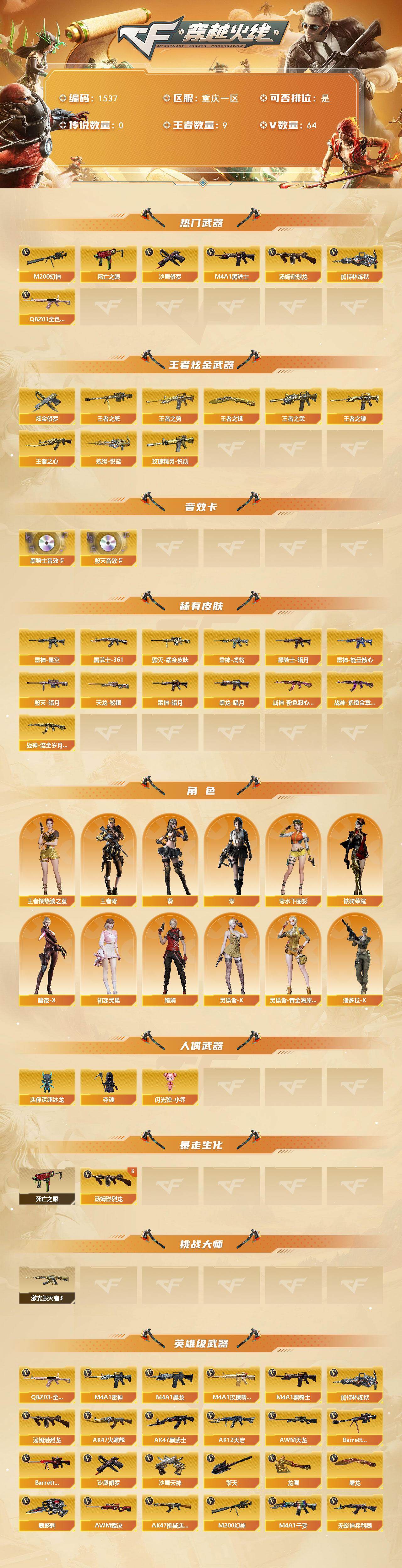 [16524628]重庆一区-64v-9王者武器数-1炫金武器数 【热门武器】:q03-金色蔷薇,m200-幻神,死亡之眼,m4a1-黑骑士2,汤姆逊-烈龙6,加特林-炼狱,沙鹰-修罗5 【王者炫金武器】:王者之势,王者之武,玫瑰精灵-悦动,王者之魄2,王者之心,王者之怒,炼狱-悦蓝,王者之锋,炫金修罗 【音效卡】:m4a1-黑骑士音效卡2,barrett-毁灭音效卡 【皮肤】:雷神-暗月,雷神-能量核心,雷神-星空,雷神-虎将,毁灭-暗月,毁灭耀金皮肤,黑龙-暗月,黑骑士-暗月,ak47-黑武士-361,战神-粉色甜心皮肤,战神-紫绶金章皮肤,战神-流金岁月皮肤,天龙-秘银 【角色】:零,葵,王者樱-热浪之夏,王者-零,暗夜-x,初恋灵狐,娟娟,零-水下丽影,灵狐者-x,灵狐者-黄金海岸,潘多拉-x,铁骑荣耀 【人偶武器】:迷你深渊冰龙,夺魂,闪光丹-小乔 【暴走生化】:死亡之眼 【挑战大师】:激光毁灭者iii 【英雄级武器】:m4a1-千变2,ak47-火麒麟3,m4a1-黑龙,m4a1-雷神4,m4a1-黑骑士2,ak47-黑武士2,ak12-天启5,ak47-机械迷城,无影-神兵利器,m4a1-玫瑰精灵,q03-金色蔷薇,ak-47-猩红传说,ak47-b-战神,黑骑士-海王,awm-天龙3,barrett-毁灭4,barrett-极光,awm-裁决,m200-幻神,加特林-炼狱,汤姆逊-烈龙6,沙鹰-修罗5,沙鹰-天神,屠龙4,龙啸,擎天3,麒麟刺,擎天-cf网剧冠军 【道具】:冰冰企鹅背包-猛男专用,战舰背包,超级背包2,变异宝贝,夺命之镰,防化服,金色流光-呛王排位2,星辰流光-呛王排位,防弹头盔,防弹衣2,c4工具钳,手蕾包 【特殊呛械】:2黑骑士,6烈龙,1炼狱